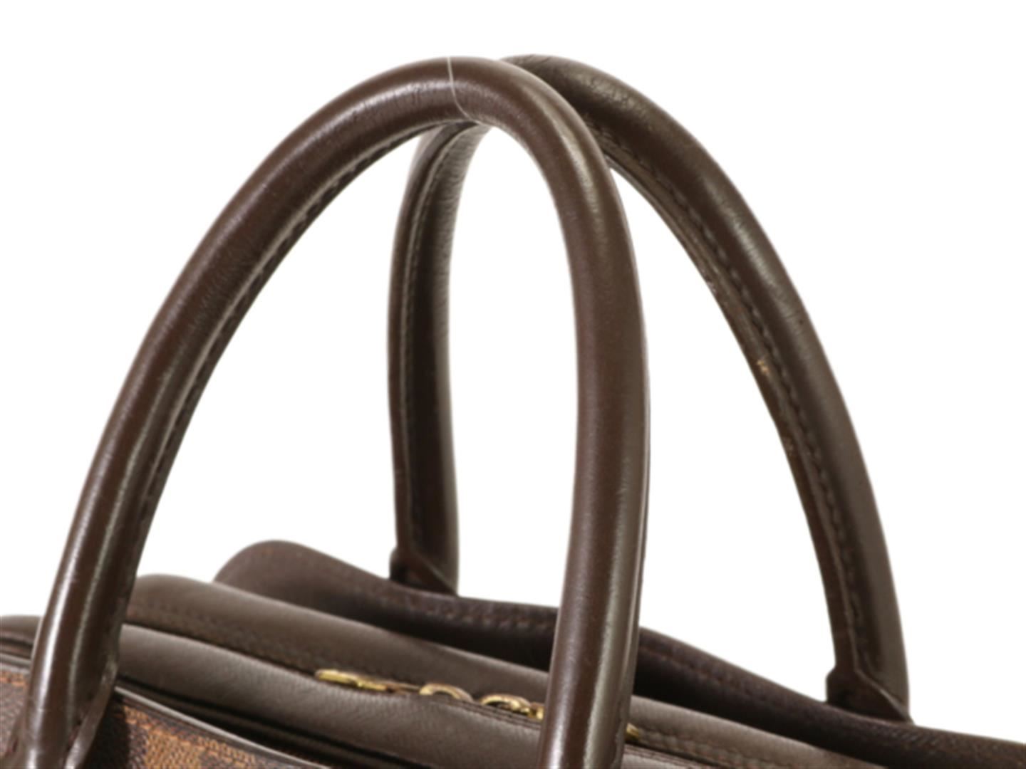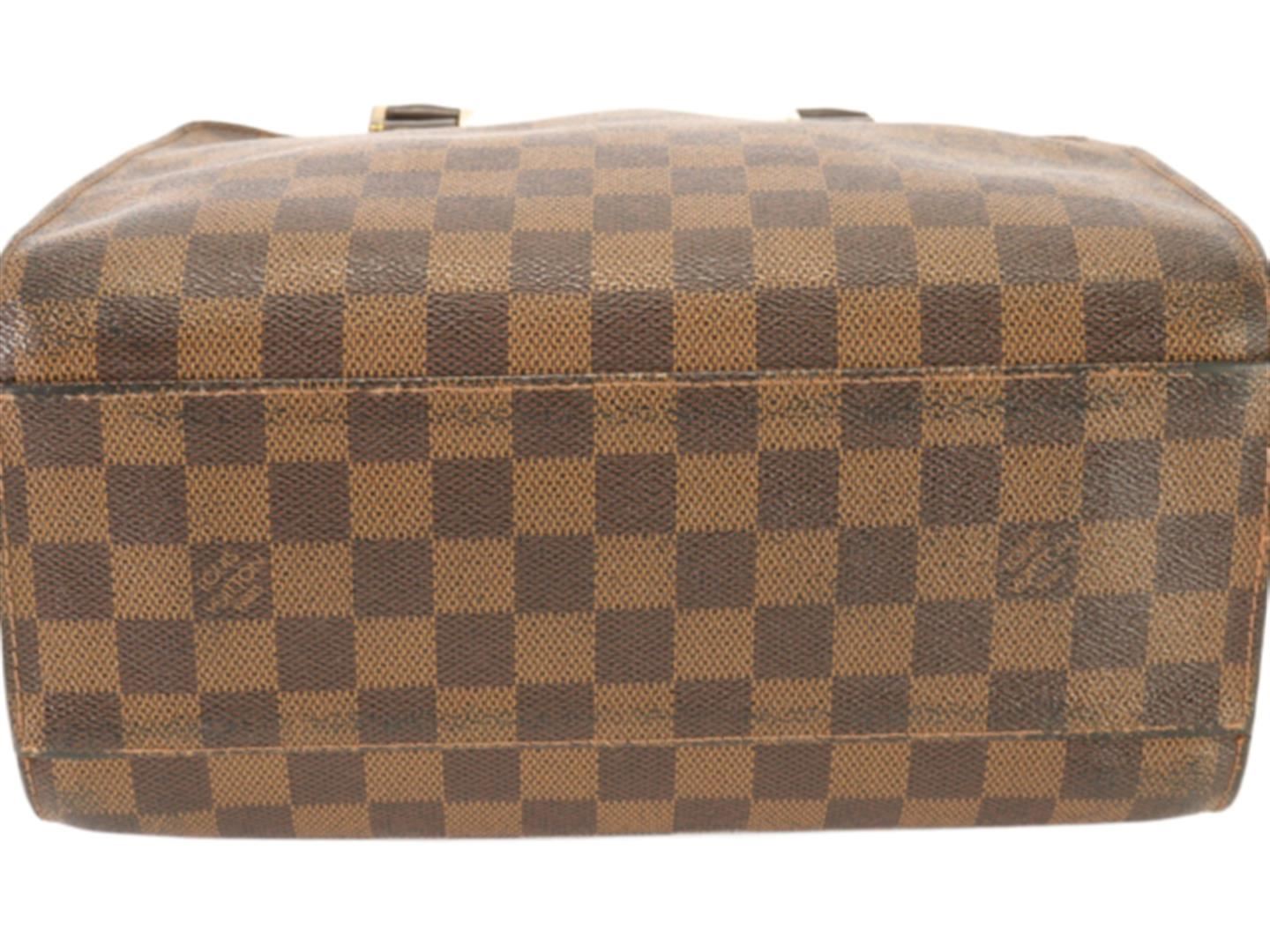 One Louis Vuitton Damier Ebene Canvas Leather Triana Handbag. Item is sold AS-IS. All available information is listed in the description and shown in the photo. Brown Damier Ebene coated canvas Louis Vuitton Triana Handbag with gold-tone hardware, mocha leather trim, dual rolled handles, dual slit pockets at exterior, orange Alcantara lining, single zipped pocket at interior wall and zip closure at top. 10.5"x3.5"x9.5"xBag Drop:5"/26.6cmx8.8cmx24.1cmxBag Drop:12.7cm