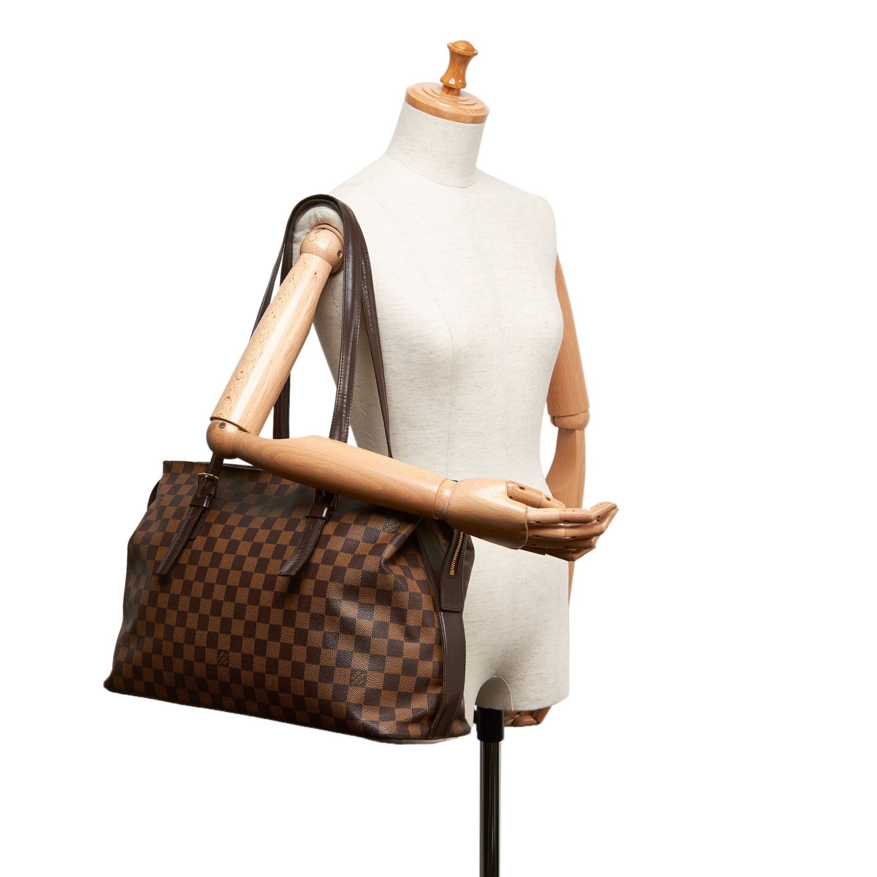 The Chelsea features a damier ebene canvas body, flat straps, an extended zipped pull, and an interior zip pocket. Canvas x Damier Canvas x Leather x Others Brown Exterior front is ripped and scratched. Exterior back is stained and scratched. Exterior bottom is stained and scratched. Exterior handle is scratched. Exterior corners is scratched. Exterior side is scratched. Interior lining is stained. Interior pocket is stained. Zipper is scratched. Padlock is tarnished and scratched. Buckle is scratched. Lock is scratched. Size: 23 x 34 x 16 Card: NO. Louis Vuitton pieces do not come with an authenticity card—please refer to the production date code within the bag for its age and as an authenticity reference. Made in: France