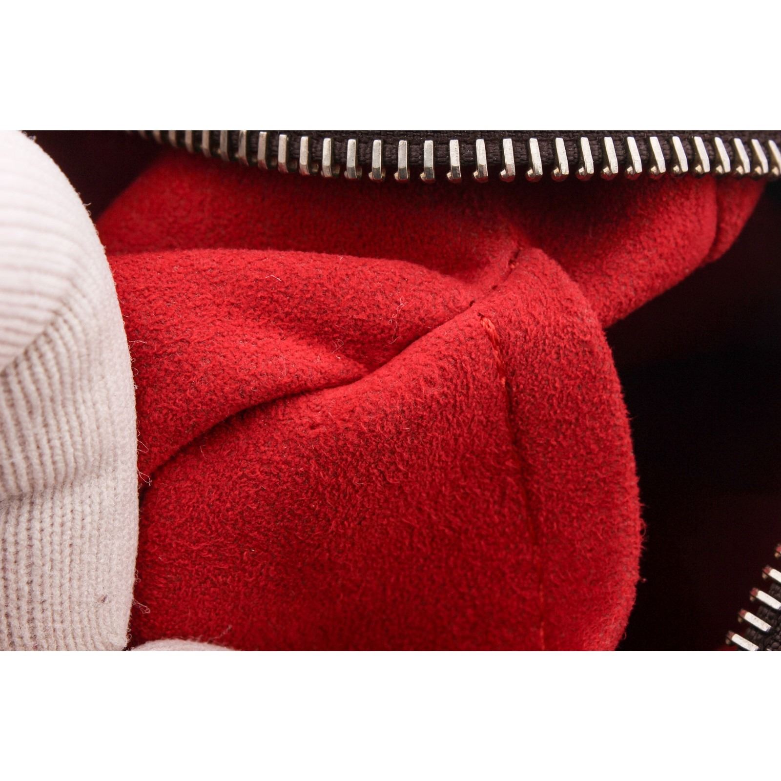 Damier Ebene coated canvas Louis Vuitton Duomo handle bag with brass hardware, dual rolled top handles, moka leather trim, protective feet at base, vermilion Alcantara lining, dual slip pockets at interior and zip closure at top.