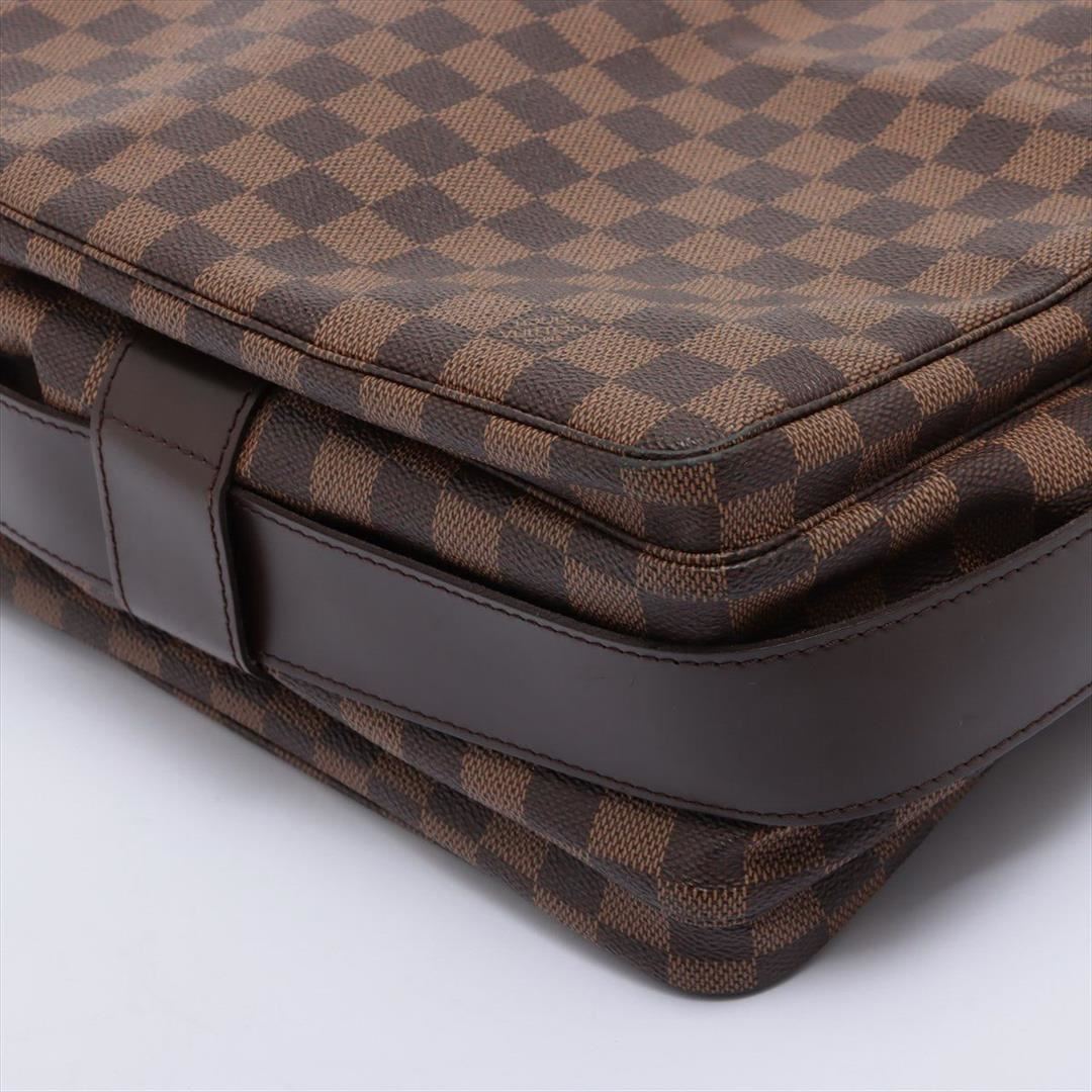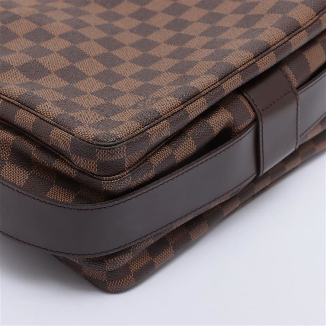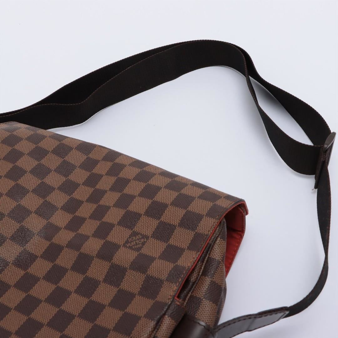 Brown and tan Damier Ebene coated canvas Louis Vuitton Naviglio messenger bag with brass hardware, walnut leather trim, single adjustable flat shoulder strap, three interior compartments; one with zip closure, terracotta woven lining, single slip pocket a
