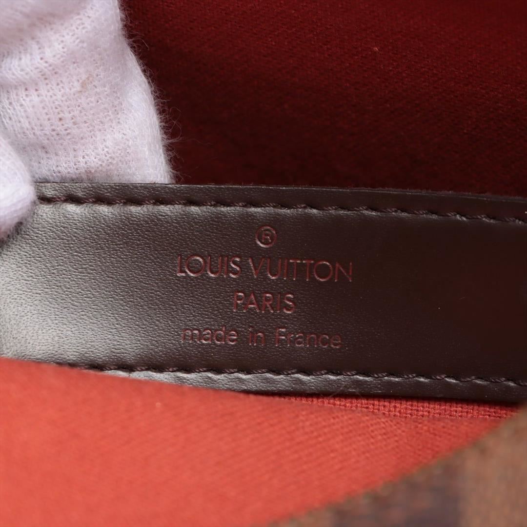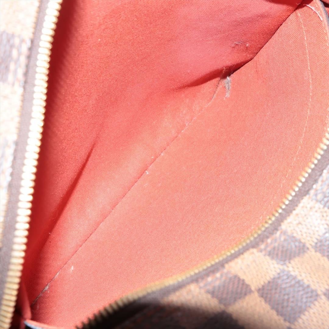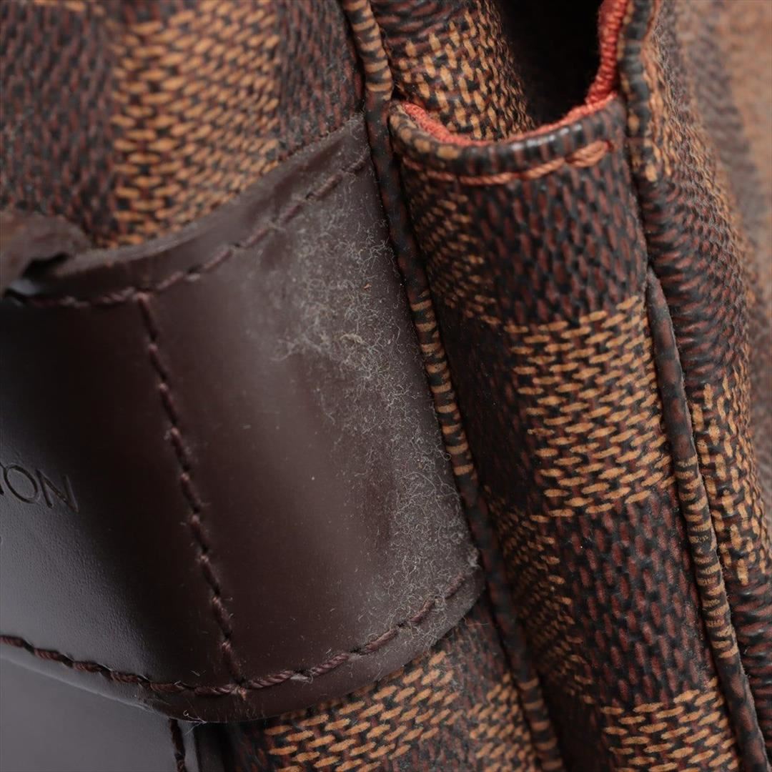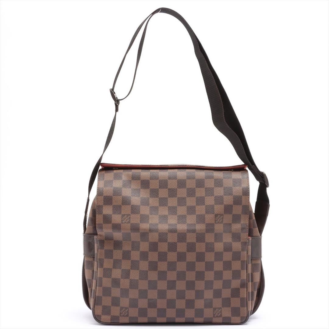 Brown and tan Damier Ebene coated canvas Louis Vuitton Naviglio messenger bag with brass hardware, walnut leather trim, single adjustable flat shoulder strap, three interior compartments; one with zip closure, terracotta woven lining, single slip pocket a
