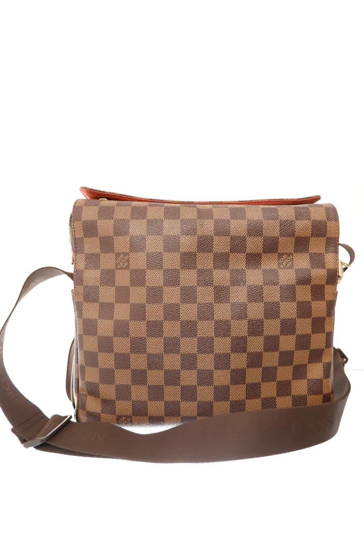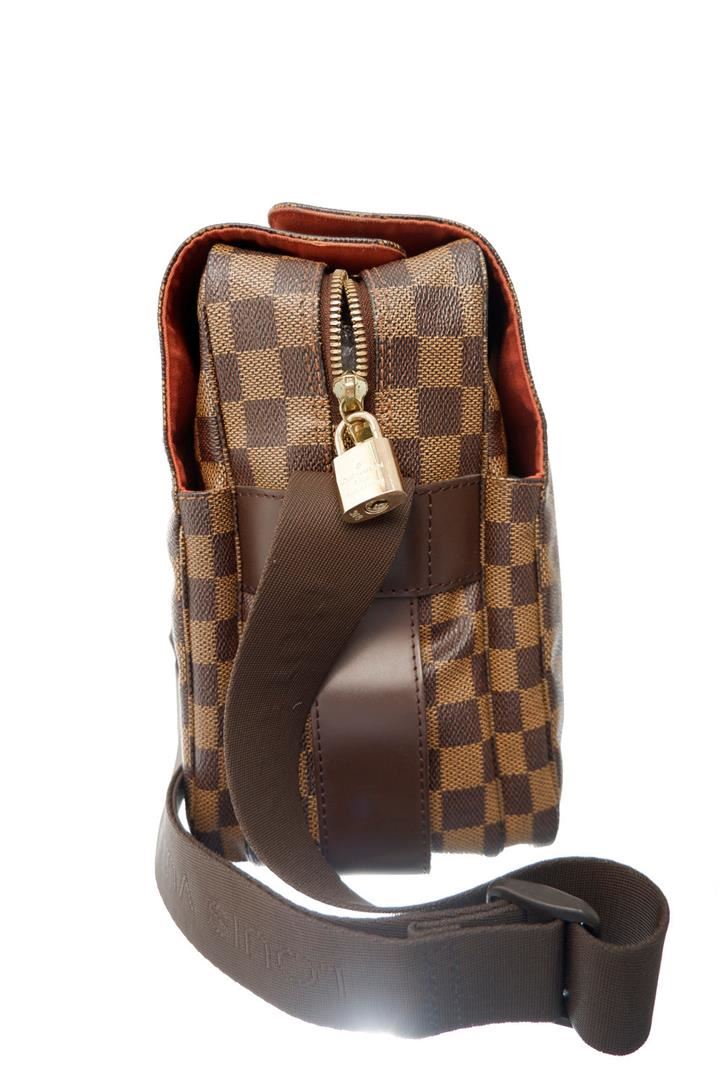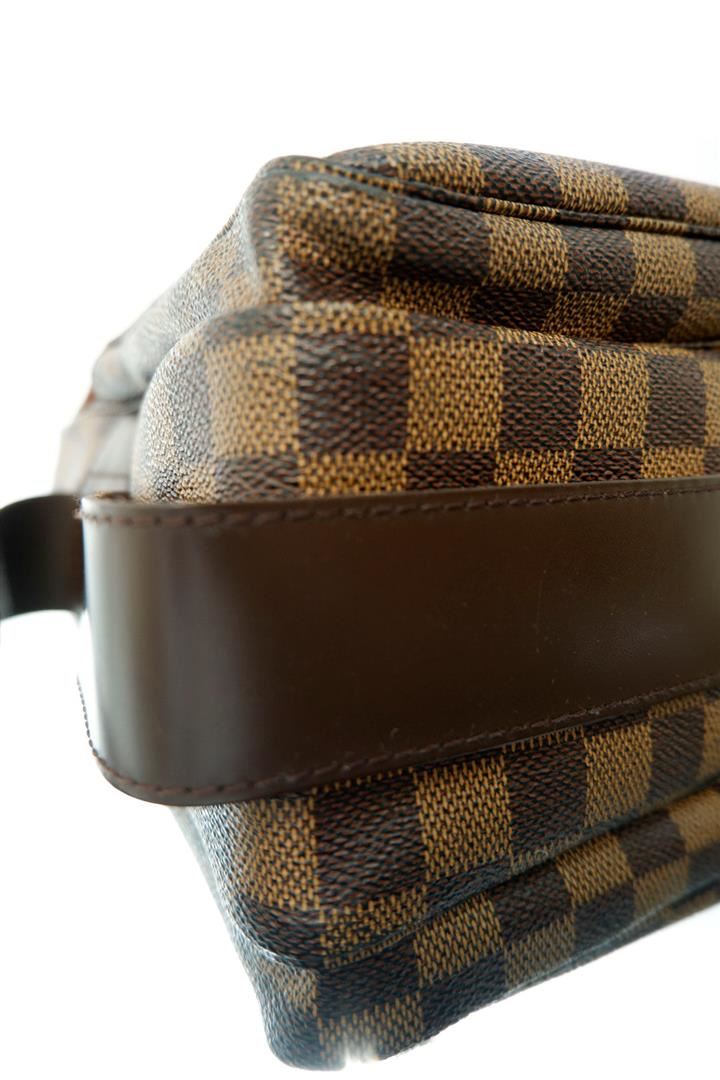 Brown and tan Damier Ebene coated canvas Louis Vuitton Naviglio messenger bag with brass hardware, walnut leather trim, single adjustable flat shoulder strap, three interior compartments; one with zip closure, terracotta woven lining, single slip pocket a