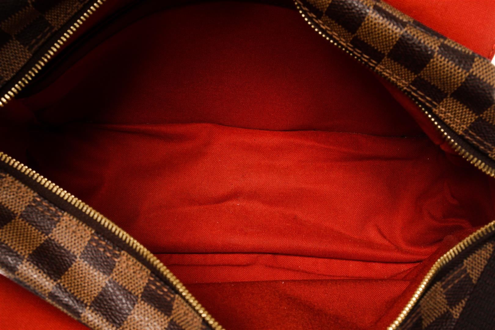 One Louis Vuitton Damier Ebene Naviglio Messenger Bag. Item is sold AS-IS. All available information is listed in the description and shown in the photo. Louis Vuitton Damier Ebene Naviglio Messenger Bag with gold-tone hardware, brown leather trim, red fabric lining, nylon strap, and top snap closures with a central zipper.