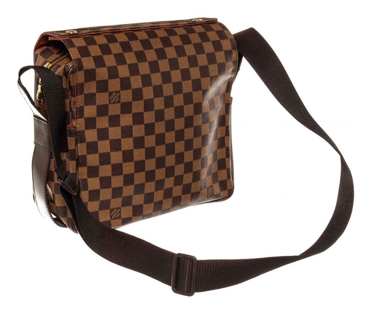 One Louis Vuitton Damier Ebene Naviglio Messenger Bag. Item is sold AS-IS. All available information is listed in the description and shown in the photo. Louis Vuitton Damier Ebene Naviglio Messenger Bag with gold-tone hardware, brown leather trim, red fabric lining, nylon strap, and top snap closures with a central zipper.
