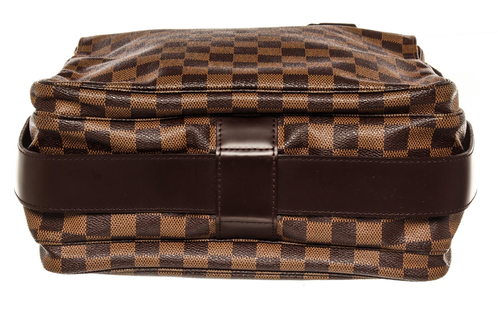 One Louis Vuitton Damier Ebene Naviglio Messenger Bag. Item is sold AS-IS. All available information is listed in the description and shown in the photo. Louis Vuitton Damier Ebene Naviglio Messenger Bag with gold-tone hardware, brown leather trim, red fabric lining, nylon strap, and top snap closures with a central zipper.
