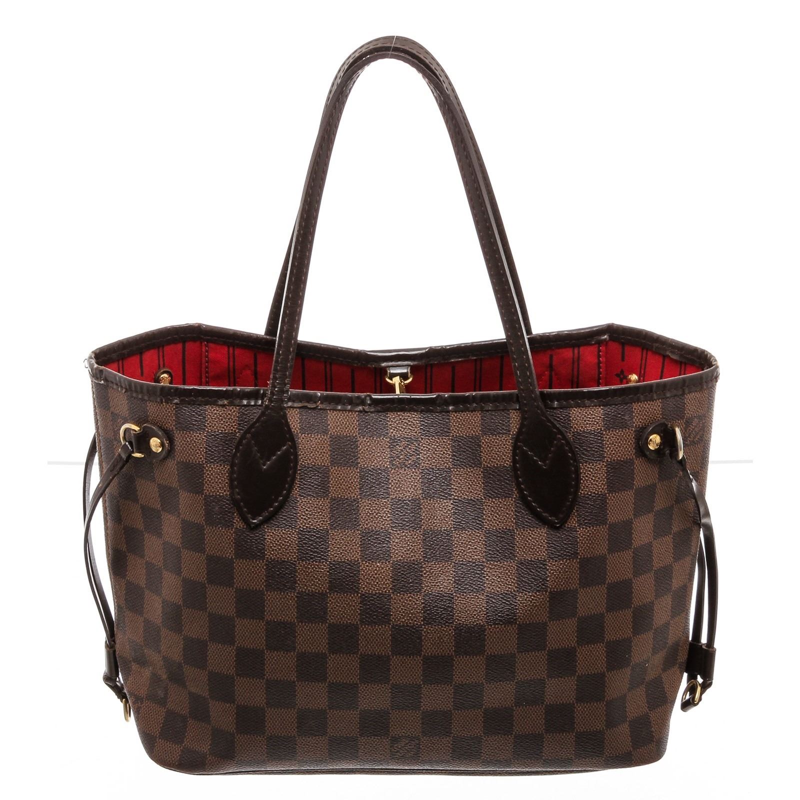 Description: Brown and tan Damier Ebene coated canvas Louis Vuitton Neverfull PM with brass hardware, leather trim, dual flat shoulder straps, red striped canvas lining, single zip pocket at interior wall and lobster clasp closure at top.