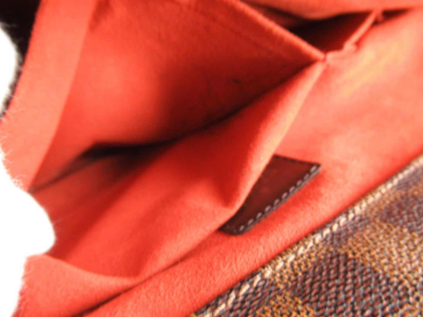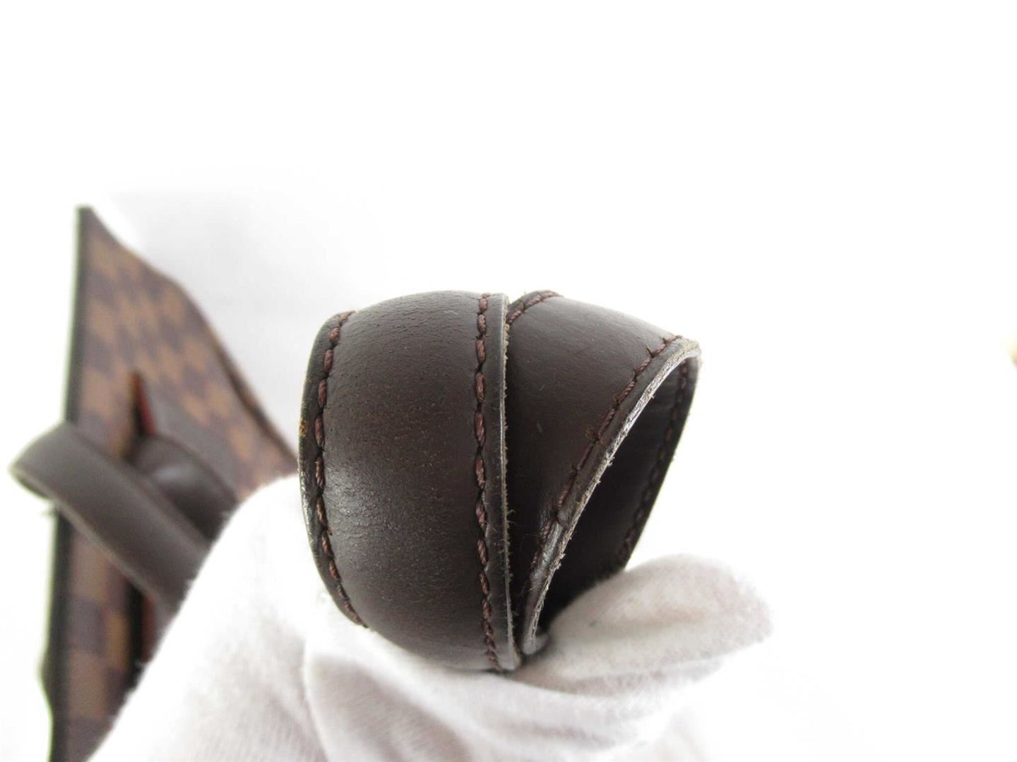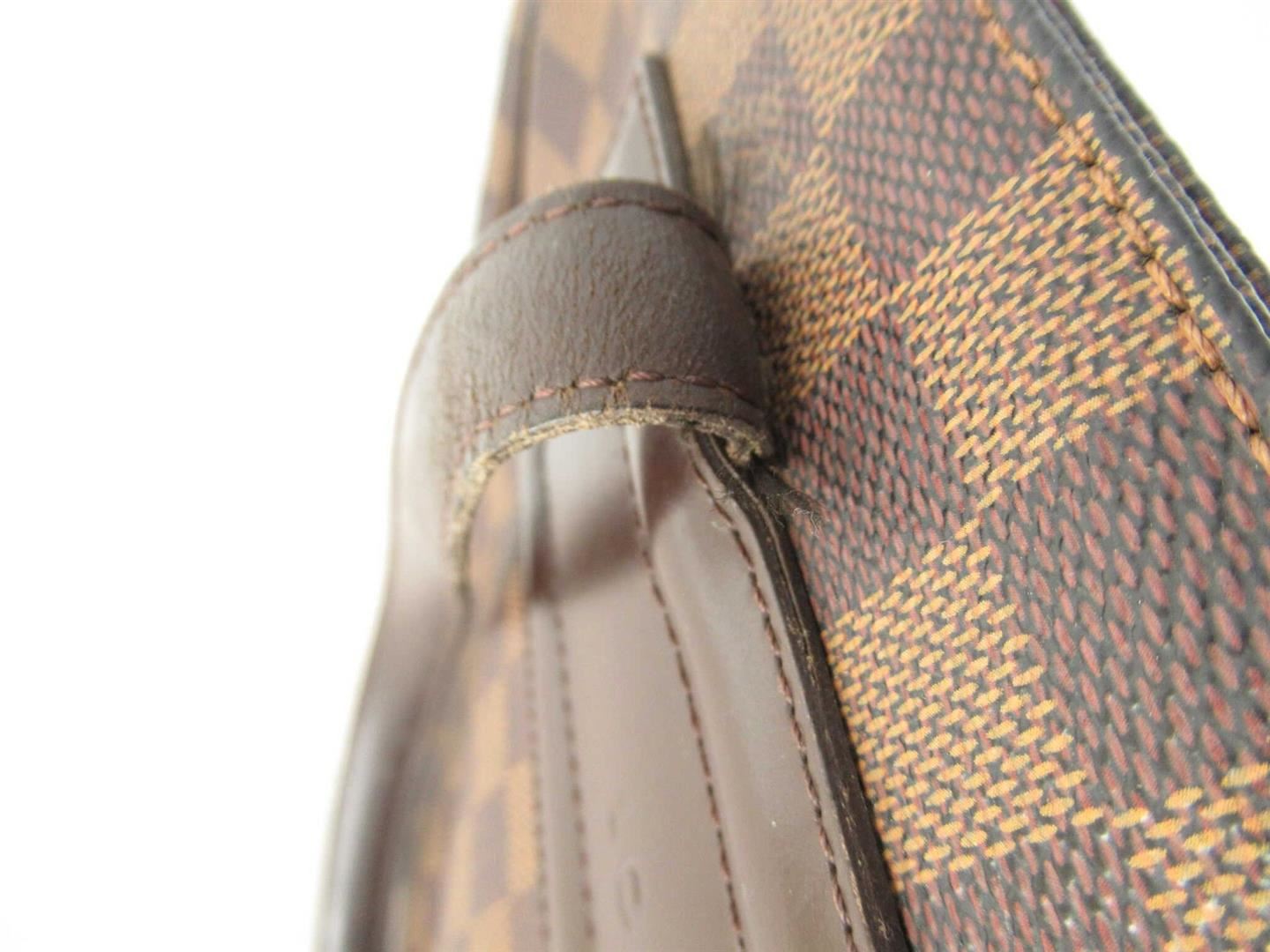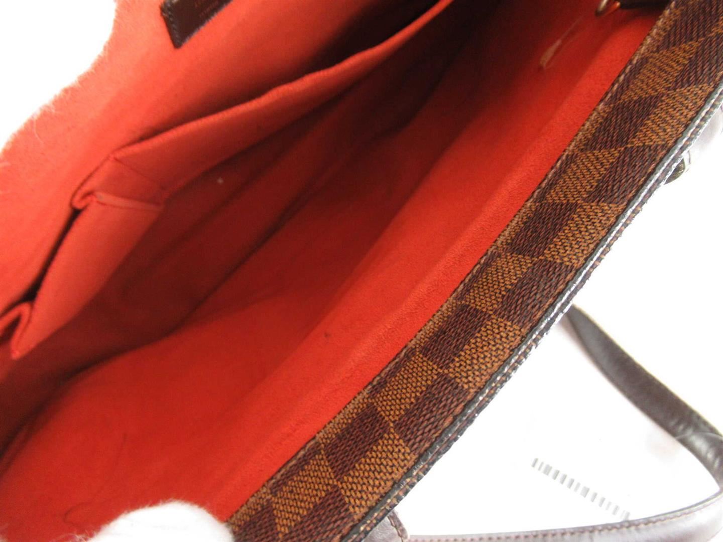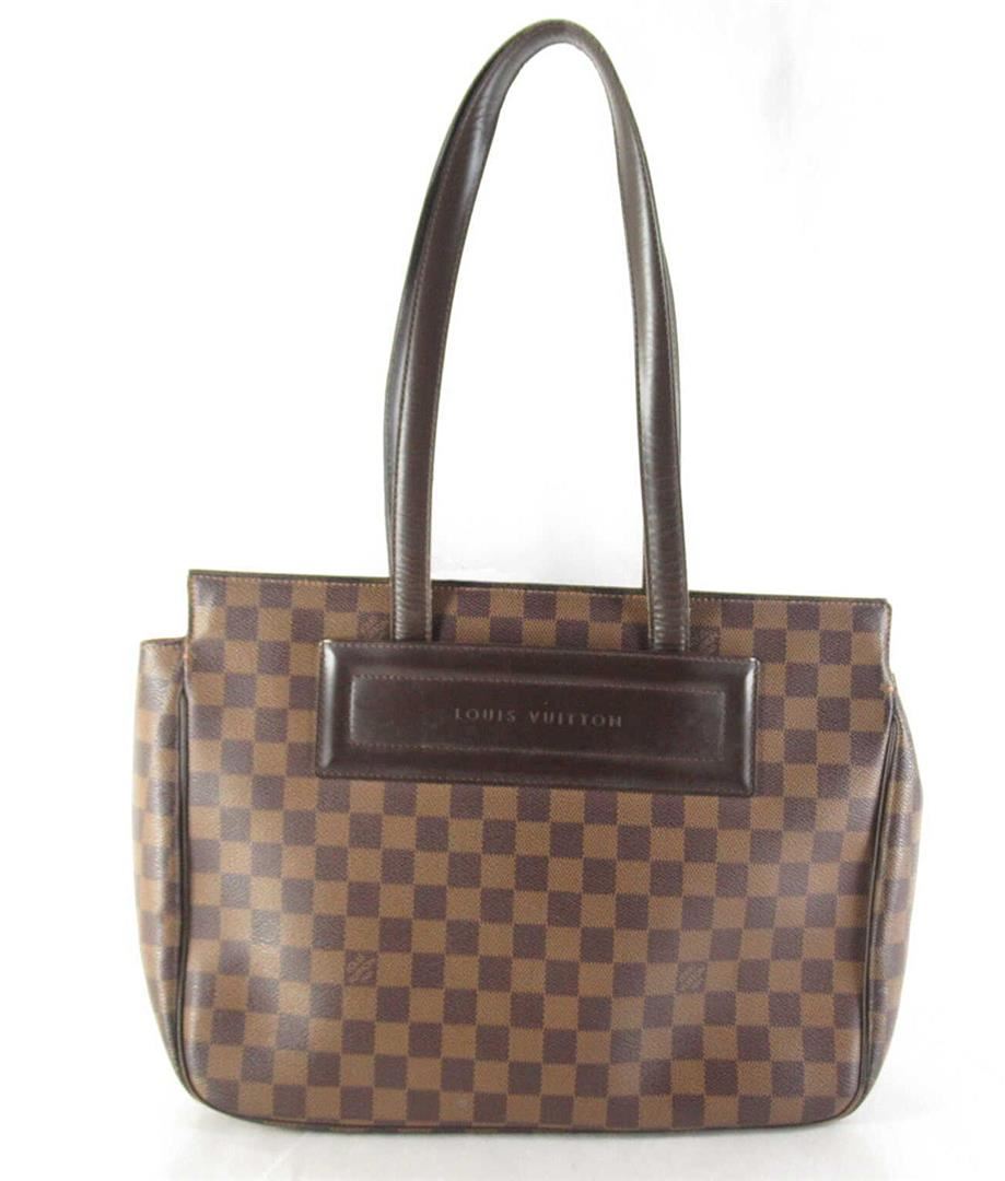 Louis Vuitton Brown Damier Ebene Parioli PM Tote Bag with damier ebene, gold-tone hardware, trim tan vachetta leather, interior slip pocket, shoulder straps, and flap closure.