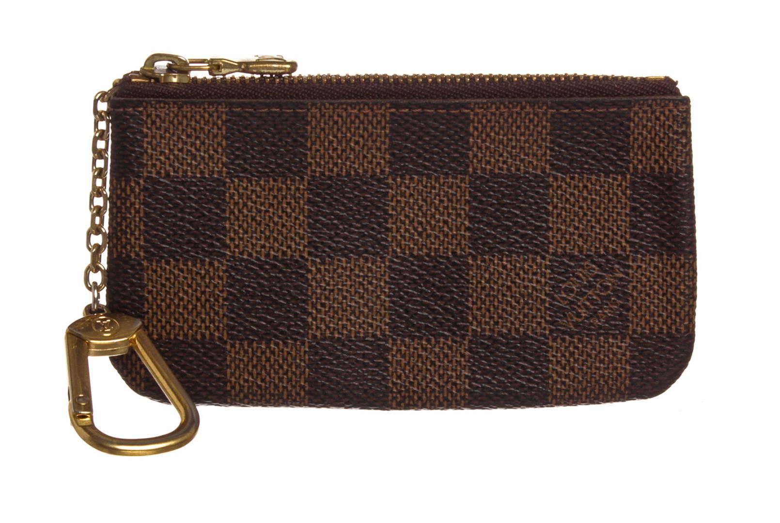 Brown Damier Ebene coated canvas Louis Vuitton Pochette Cles with gold-tone hardware, Taiga leather lining featuring chain hook clasp and zip closure at top.