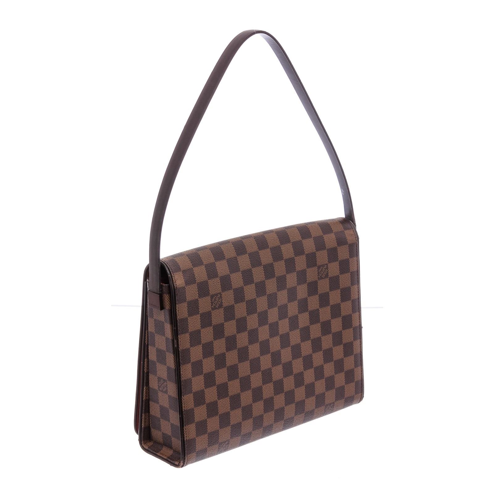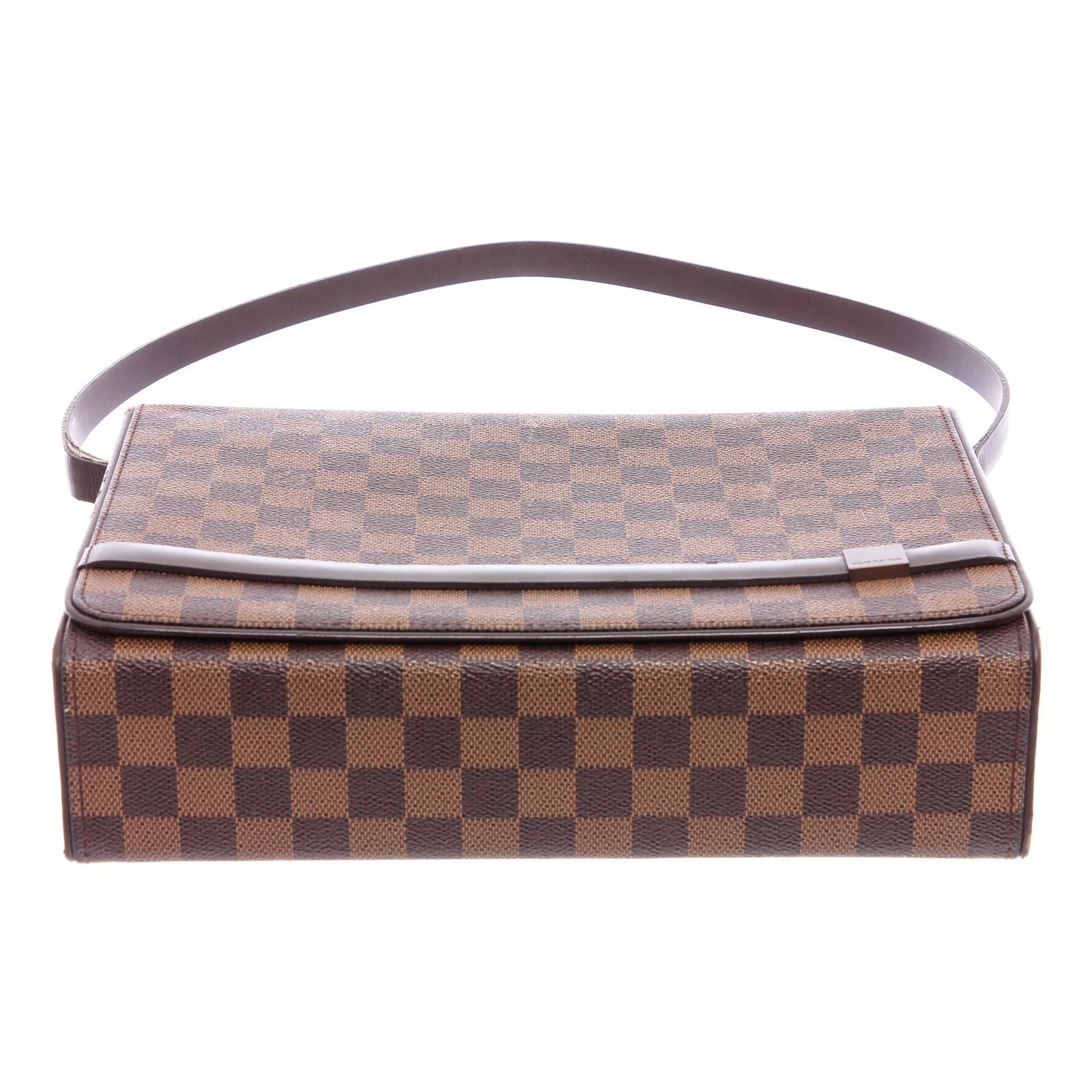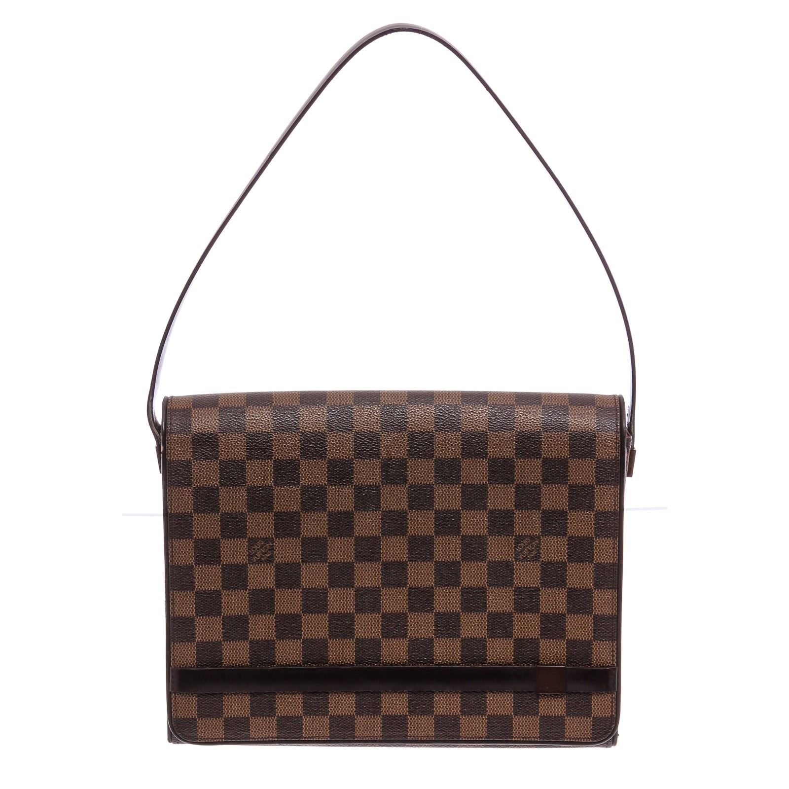 Brown Damier Ebene coated canvas Louis Vuitton Tribeca Carre bag with brass hardware, brown leather trim, logo at front exterior, single flat shoulder strap, terracotta Taiga leather lining, single zip pocket at interior wall and magnetic snap closure at front flap.