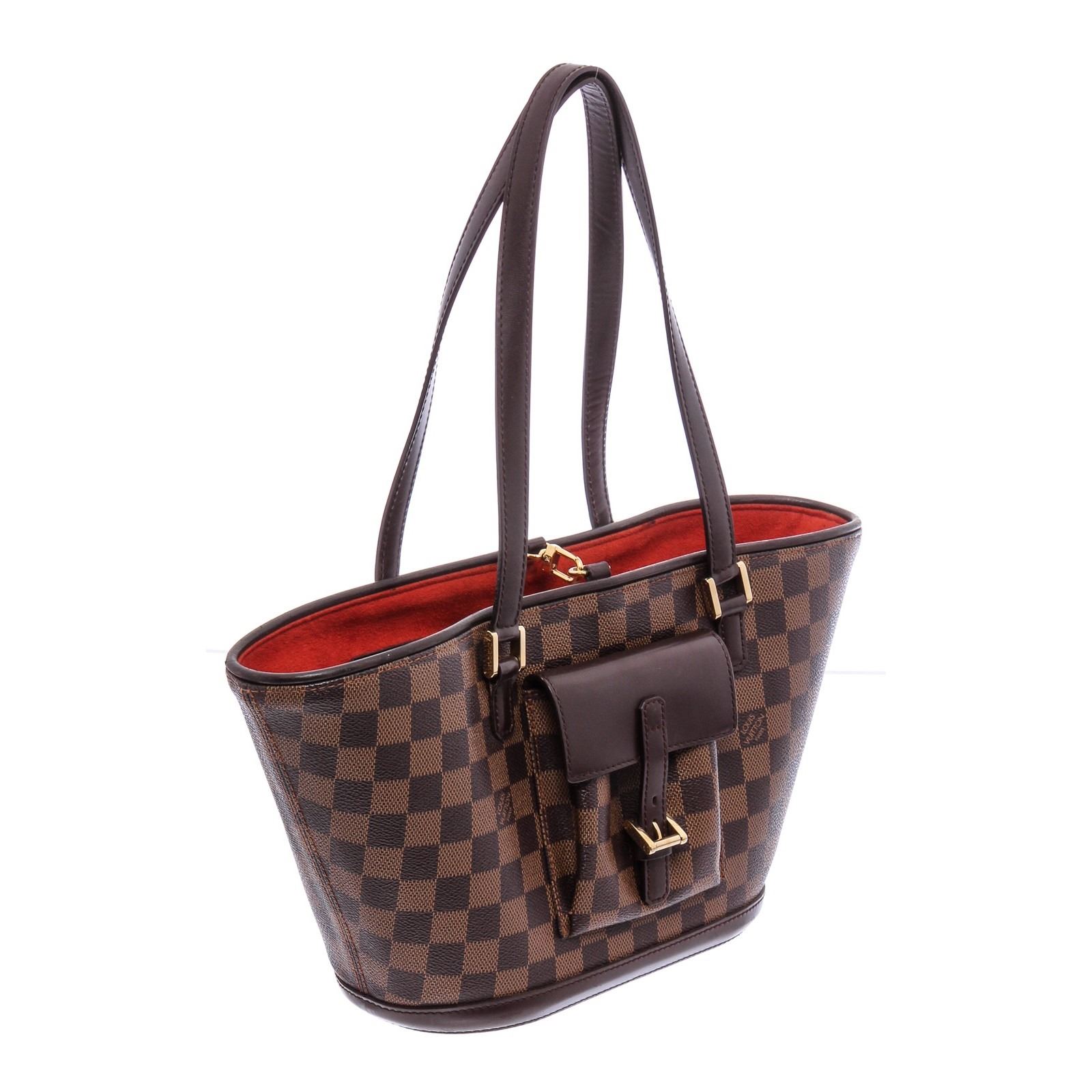 Brown Damier Ebene coated canvas Louis Vuitton Manosque PM with brass hardware, brown leather accents, dual flat shoulder straps, single exterior pocket with buckle closure, terracotta Alcantara lining, dual zip pockets at interior walls and lobster-claw clasp closure at top.