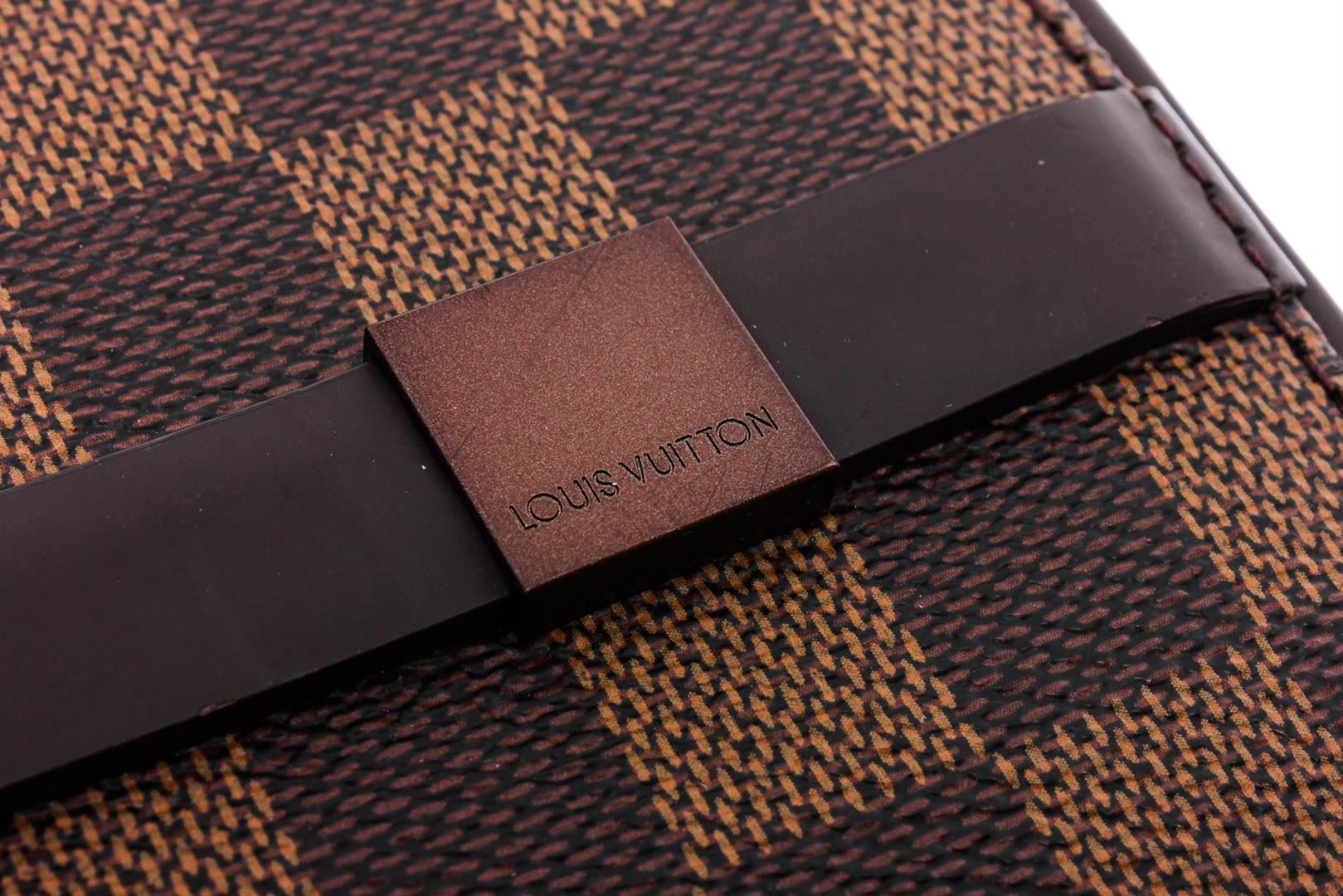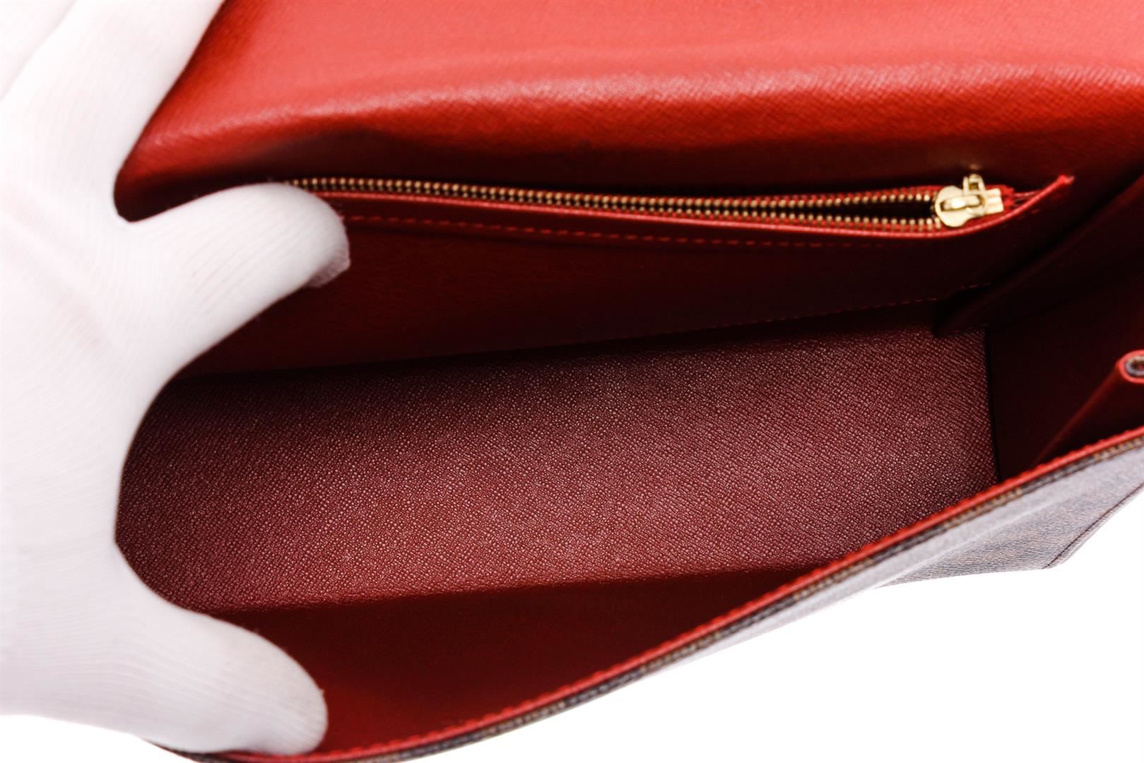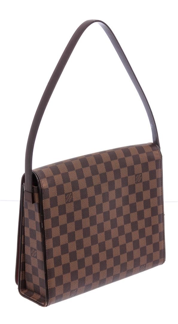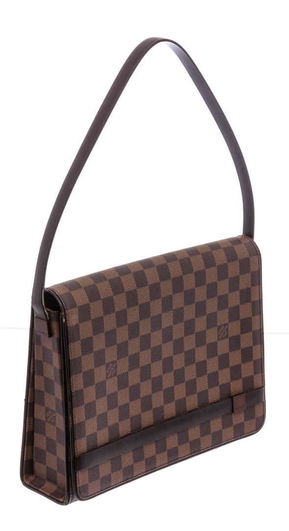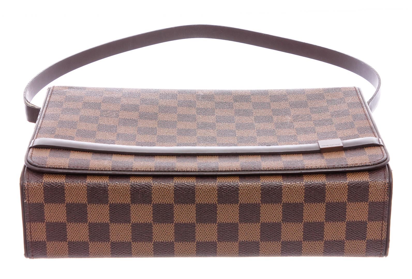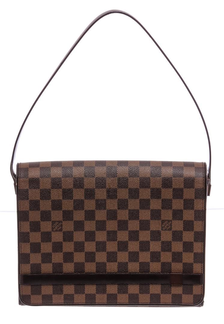 One Louis Vuitton Damier Ebene Tribeca Shoulder Bag. Brown Damier Ebene coated canvas Louis Vuitton Tribeca Carre bag with brass hardware, brown leather trim, logo at front exterior, single flat shoulder strap, terracotta Taiga leather lining, single zip pocket at interior wall and magnetic snap closure at front flap.