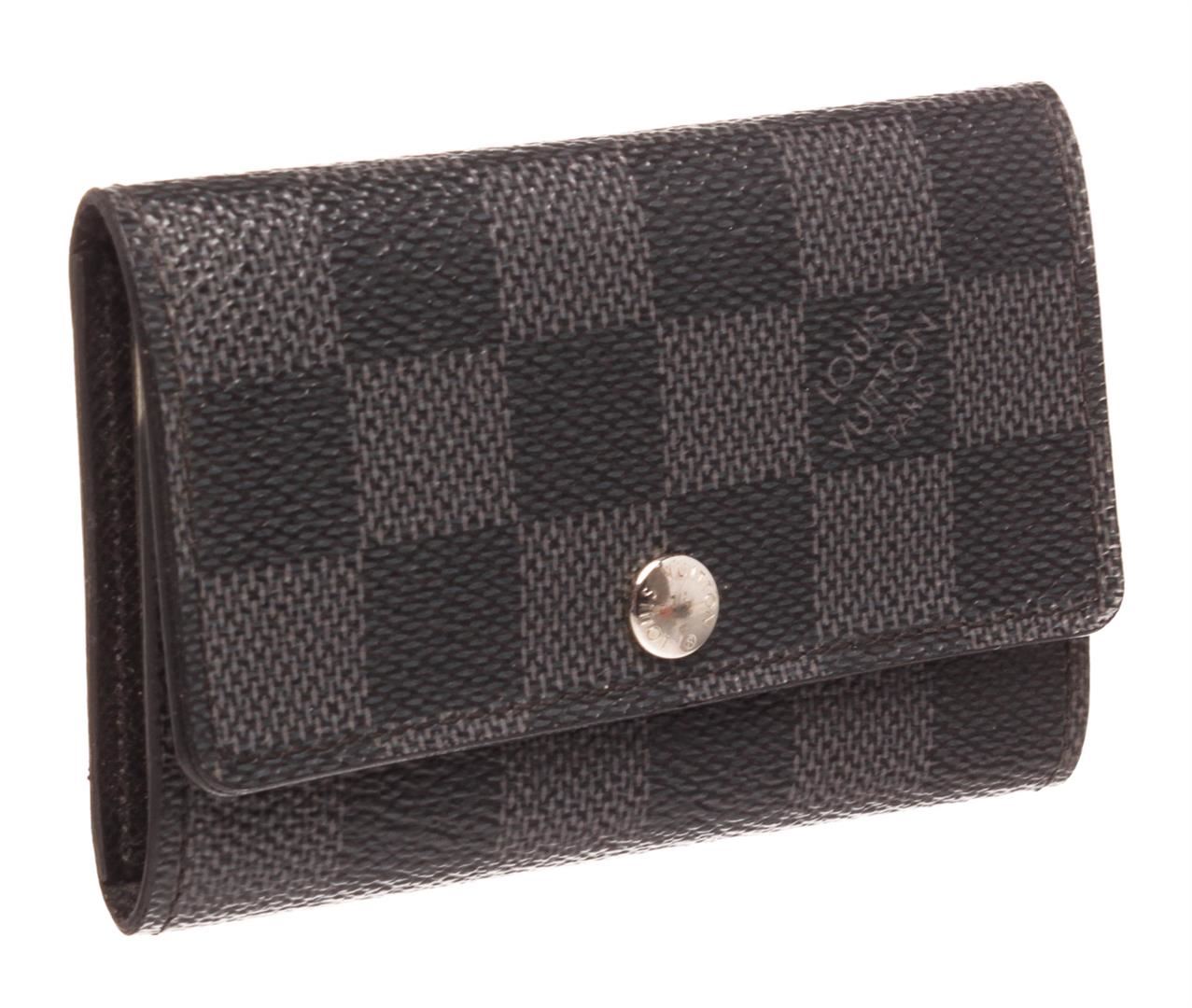 Black and grey coated canvas Louis Vuitton Damier Graphite key case with silver-tone hardware, leather interior featuring six key holders and snap closure at front.