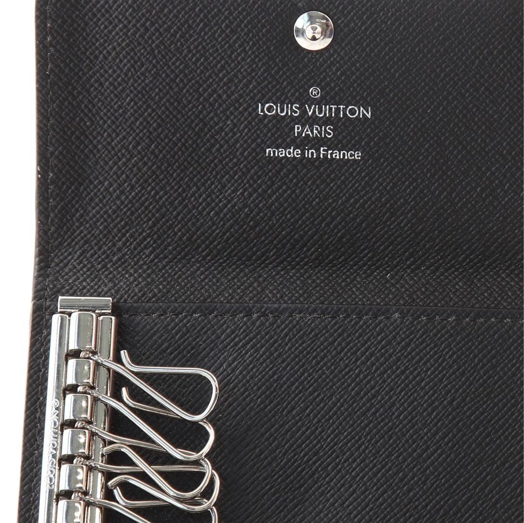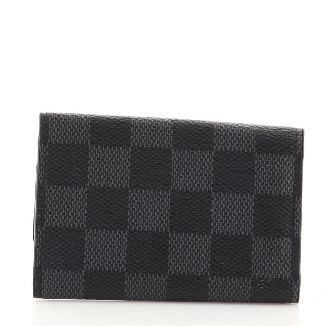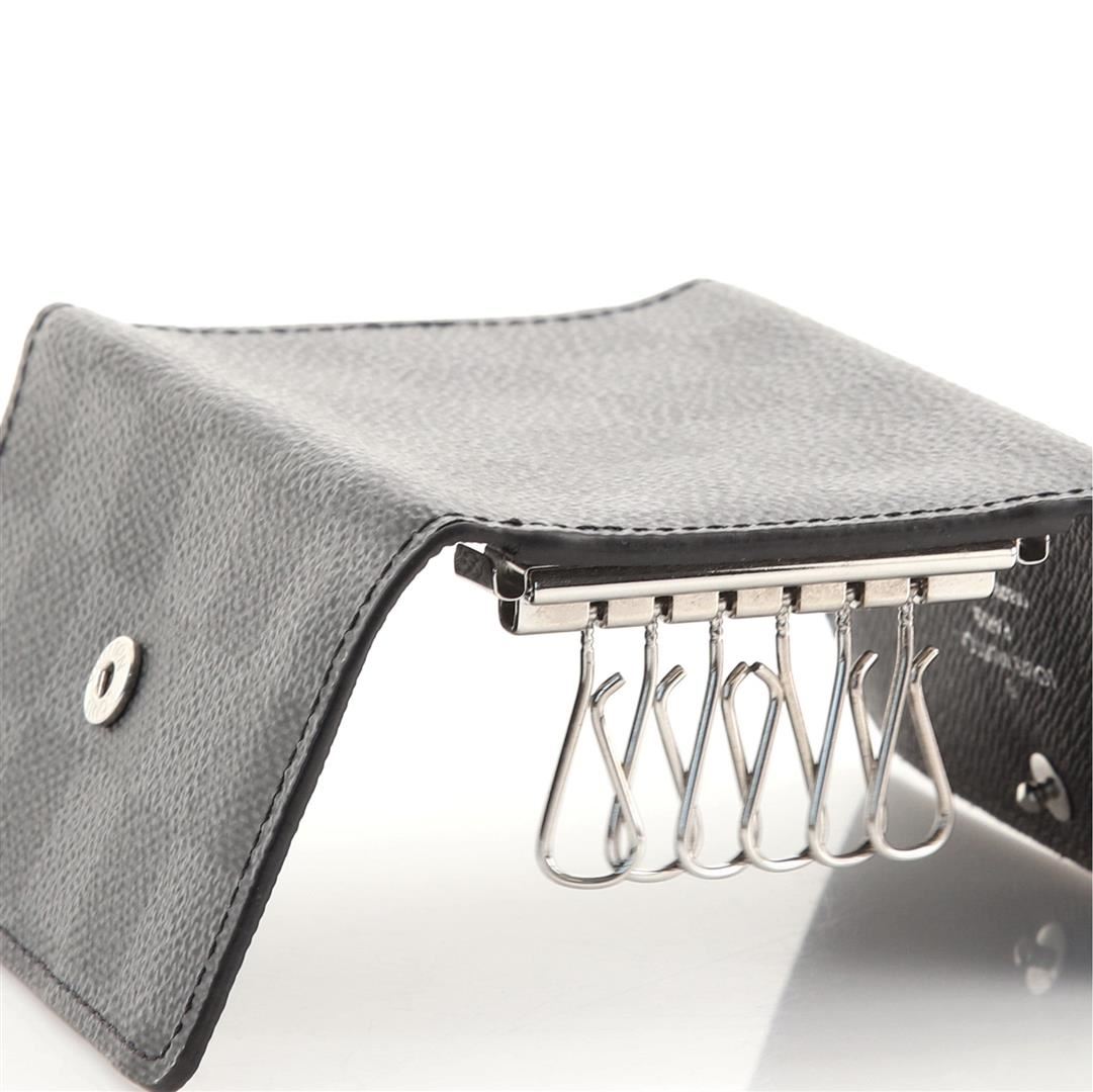 This compact case holds six keys on individual golden brass hooks. In Damier Graphite coated canvas, grained calf leather lining, snapped closure, it is a practical accessory for a handbag or briefcase.