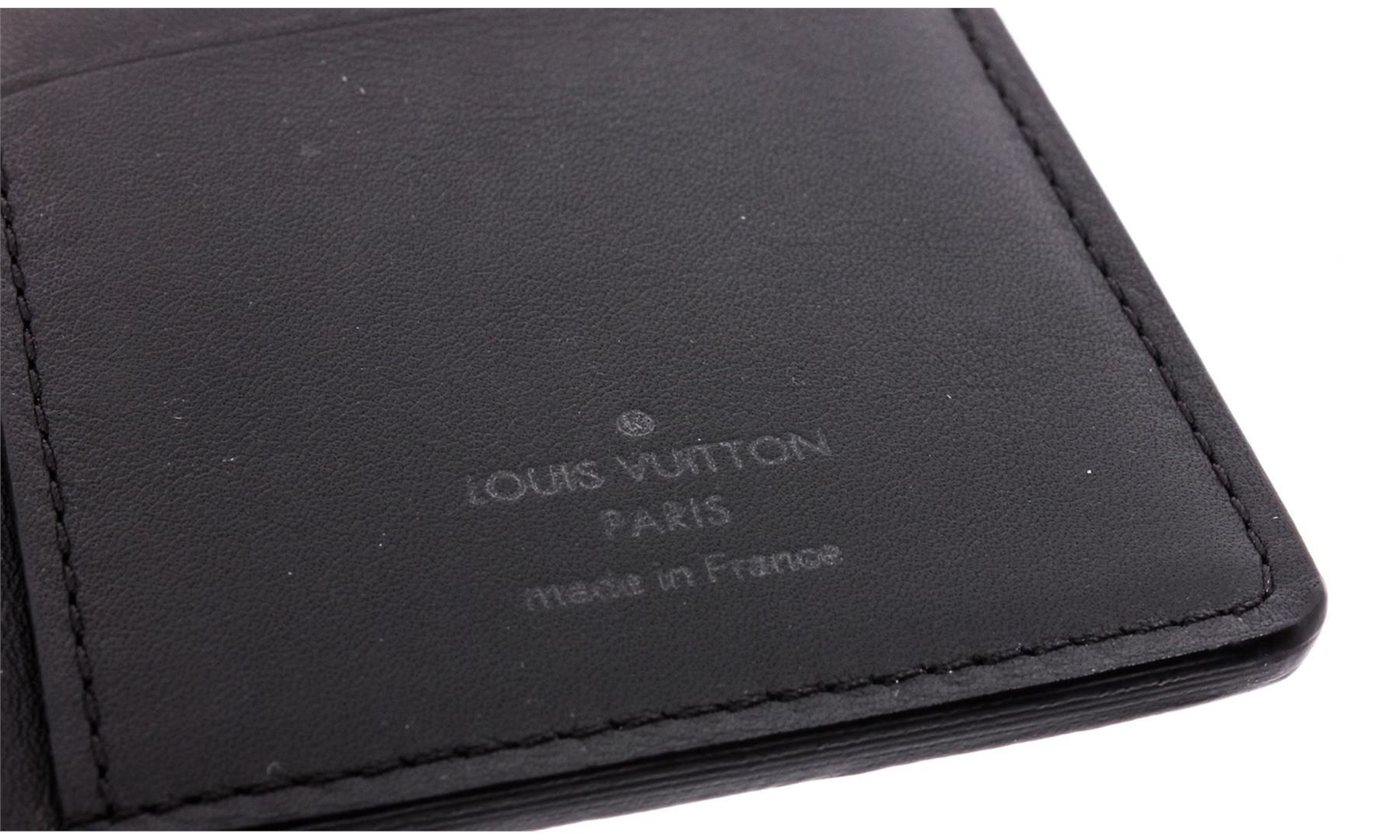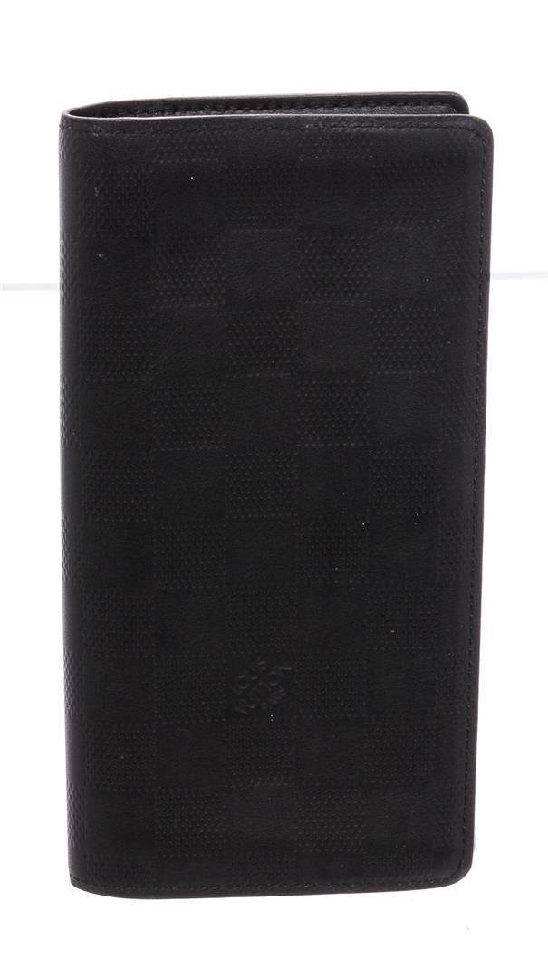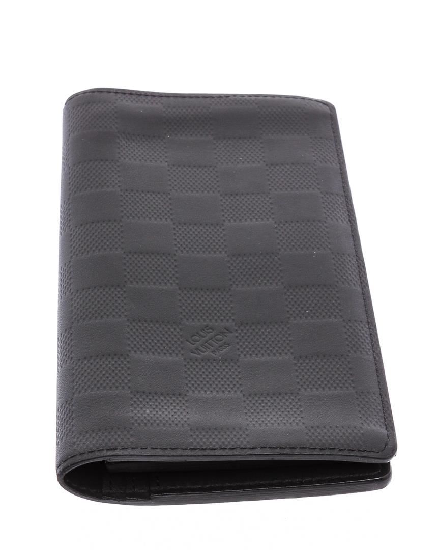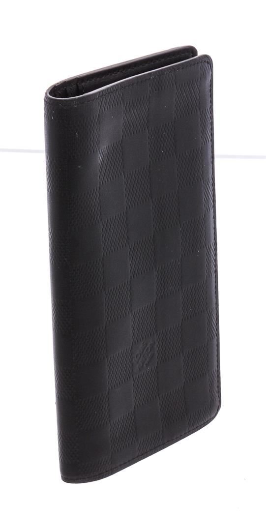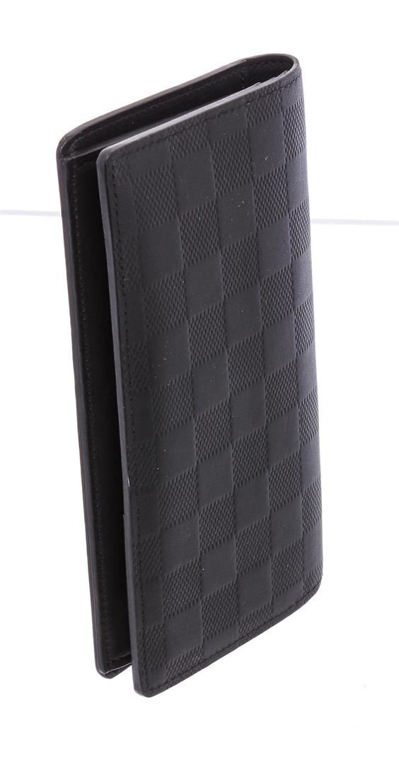 Grey Damier Graphite coated canvas Louis Vuitton Brazza wallet with silver-tone hardware, leather lining featuring 12 card slots and six slit pockets and fold-over closure.