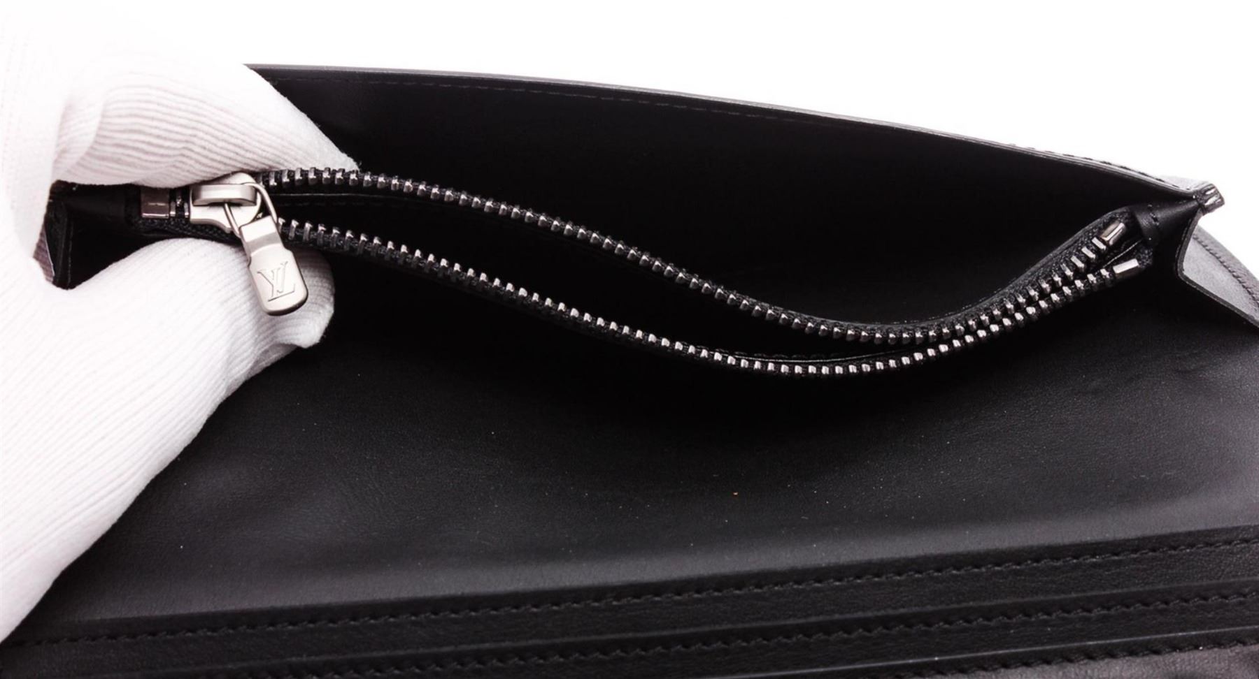 Grey Damier Graphite coated canvas Louis Vuitton Brazza wallet with silver-tone hardware, leather lining featuring 12 card slots and six slit pockets and fold-over closure.