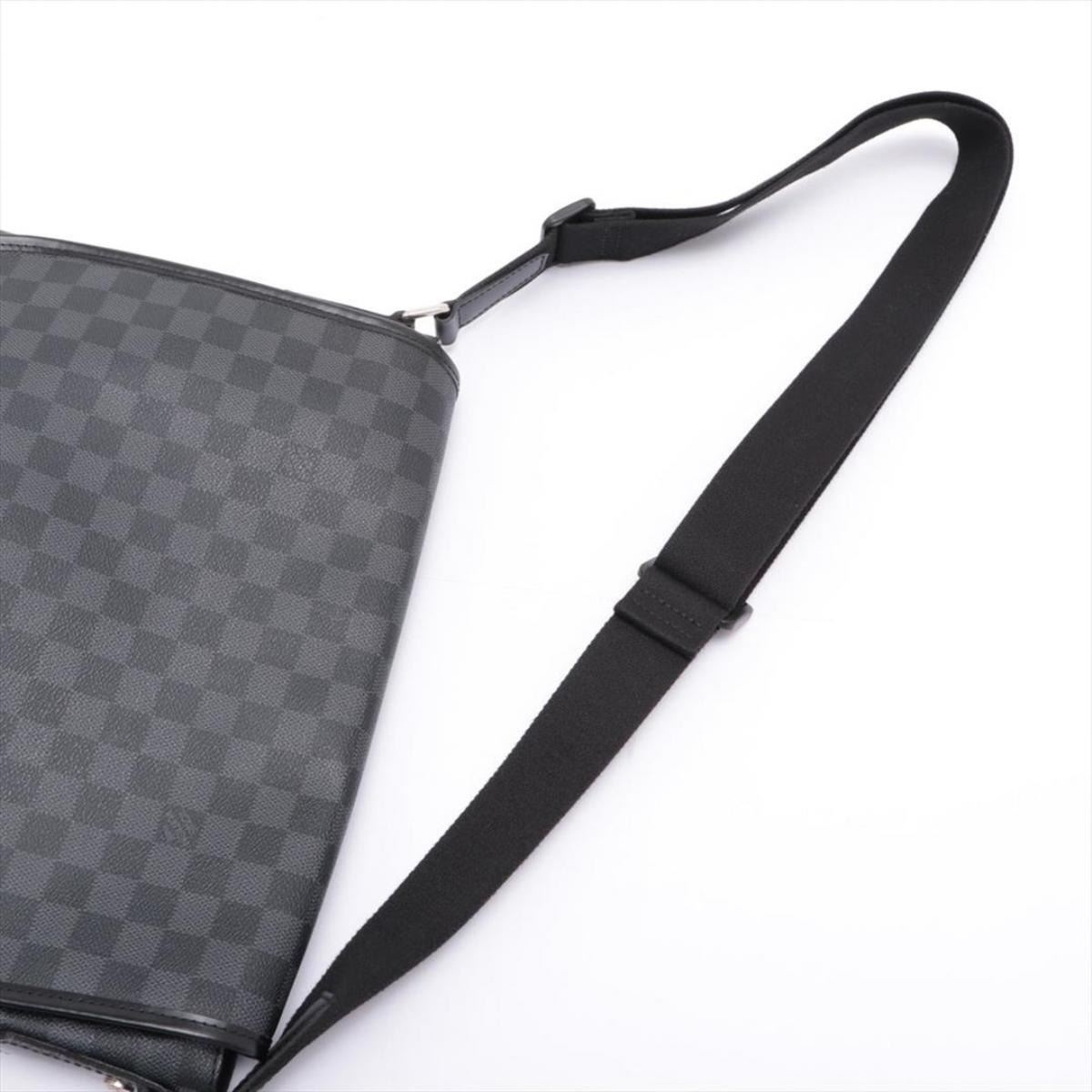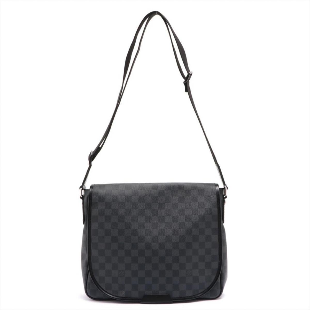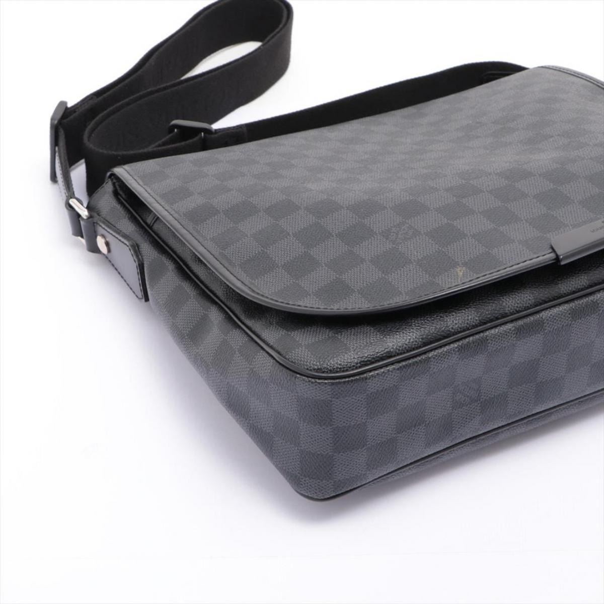 Black and charcoal Damier Graphite coated canvas Louis Vuitton Daniel MM with silver-tone hardware, black leather trim, adjustable flat shoulder strap, exterior zip pocket at back, slip pocket at flap underside, black woven lining, dual slip pockets at interior wall and magnetic closure at front flap. 13.5"x 3"x 11"xHandle Drop: 23"/34.2cmx7.6cmx27.9cmxHandle Drop:58.4cm