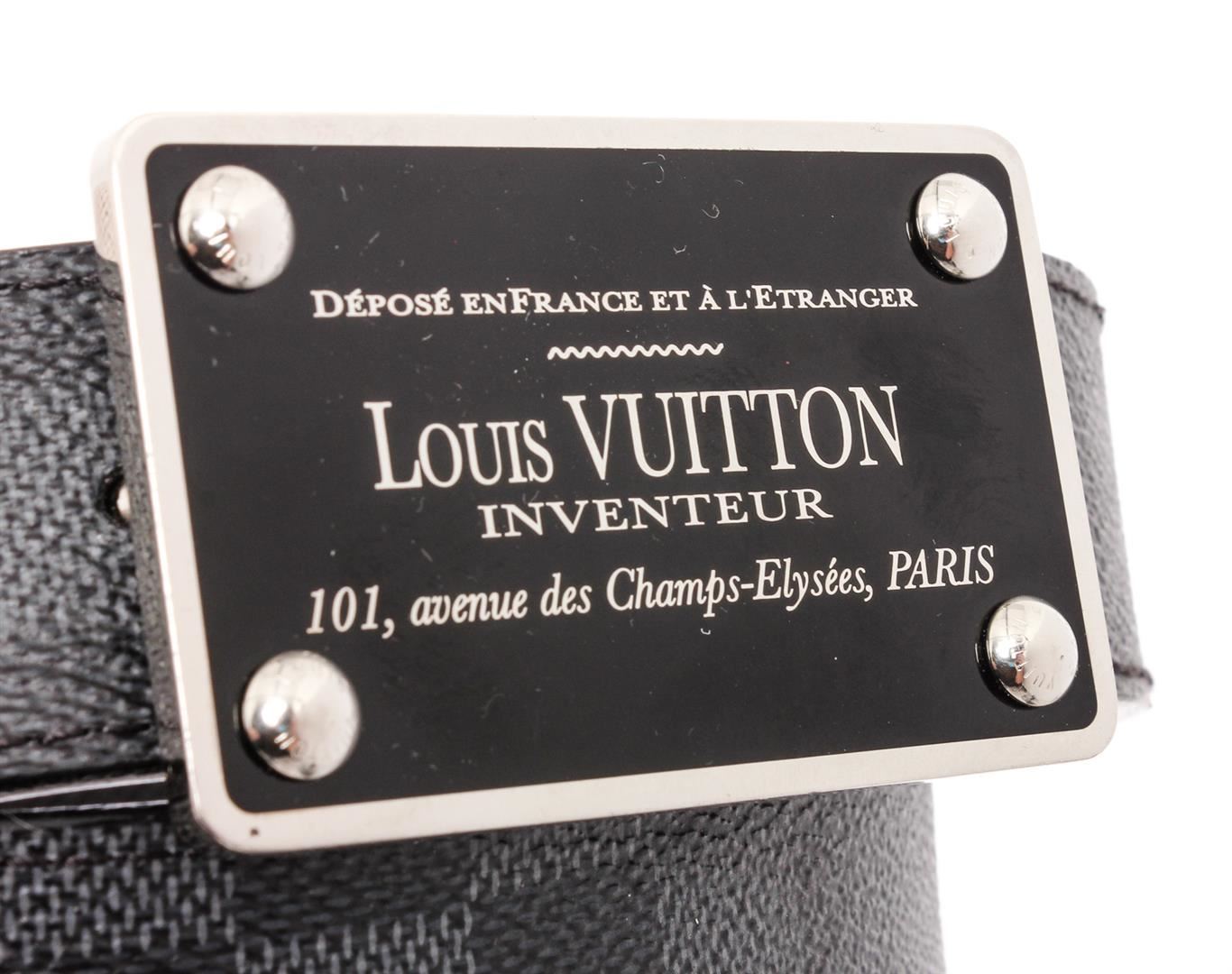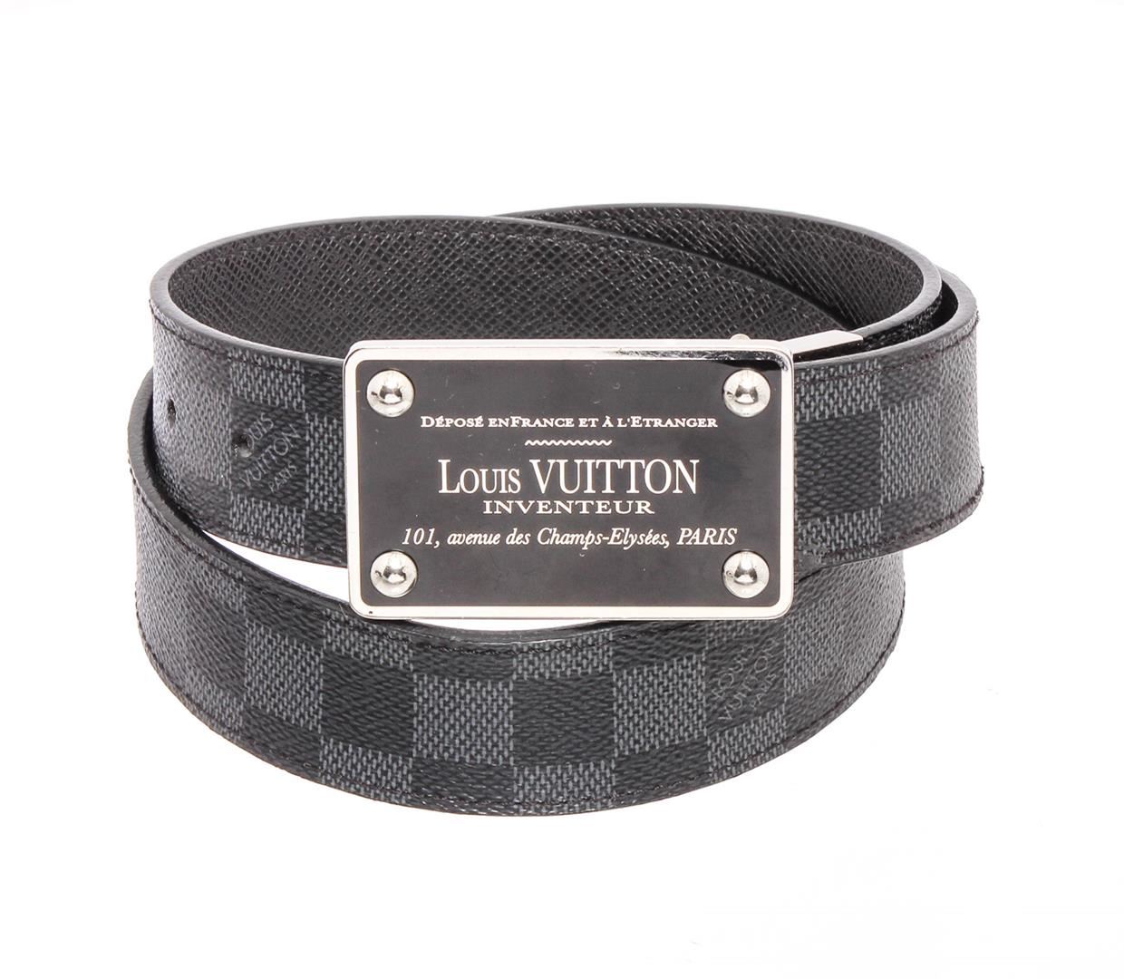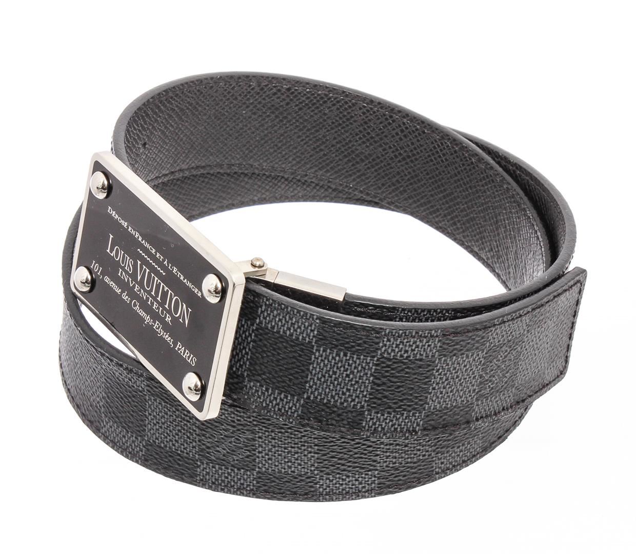 Damier Graphite coated canvas Louis Vuitton Inventeur belt with silver-tone peg-in-hole buckle closure. Designer size 85.