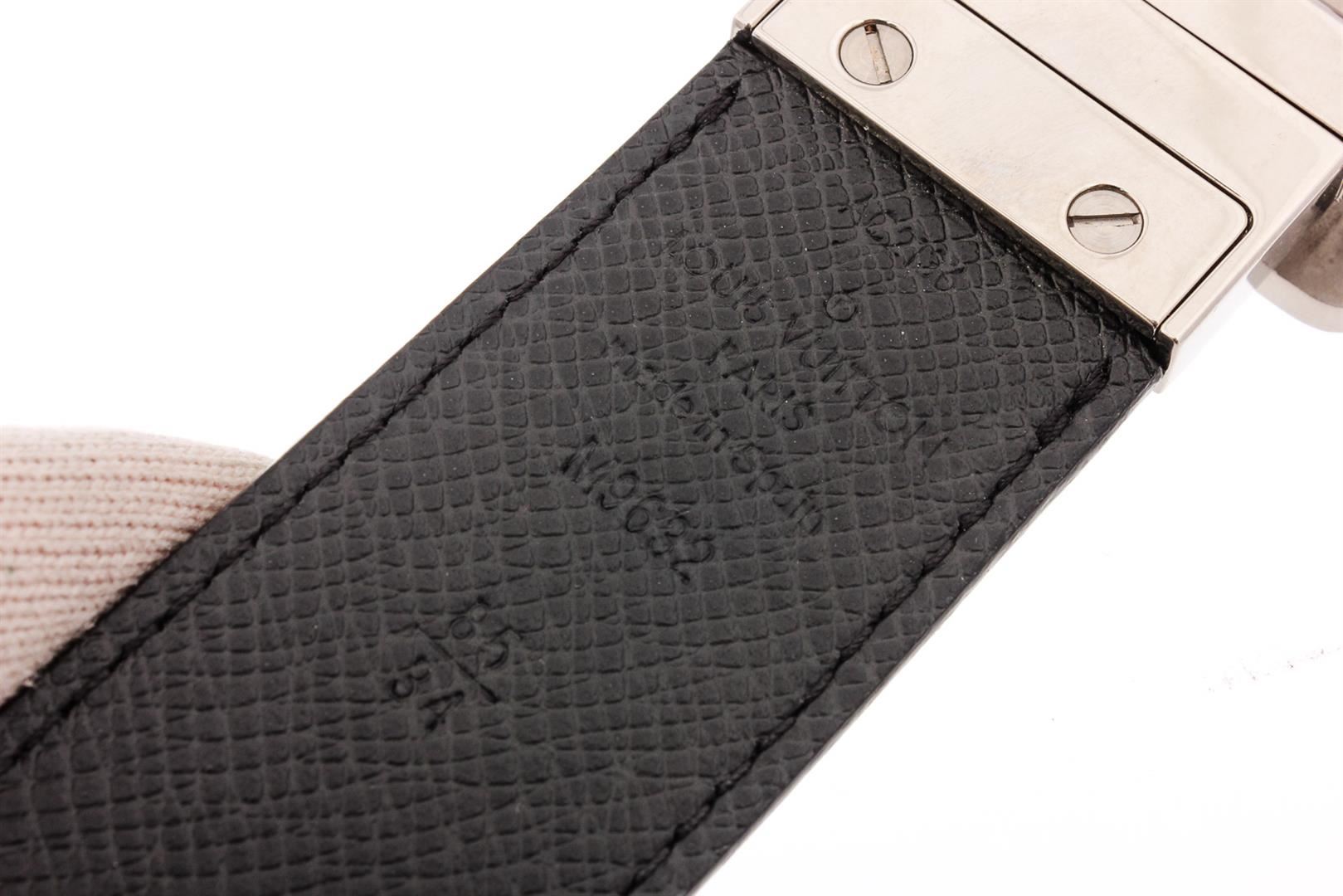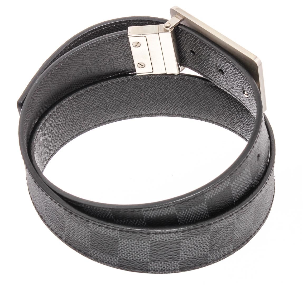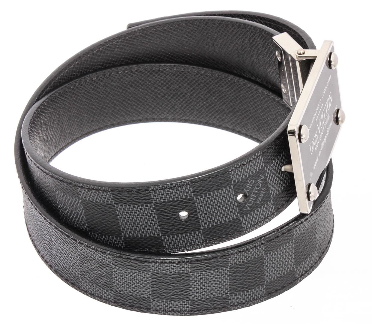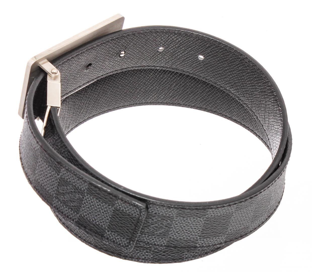 Damier Graphite coated canvas Louis Vuitton Inventeur belt with silver-tone peg-in-hole buckle closure. Designer size 85.