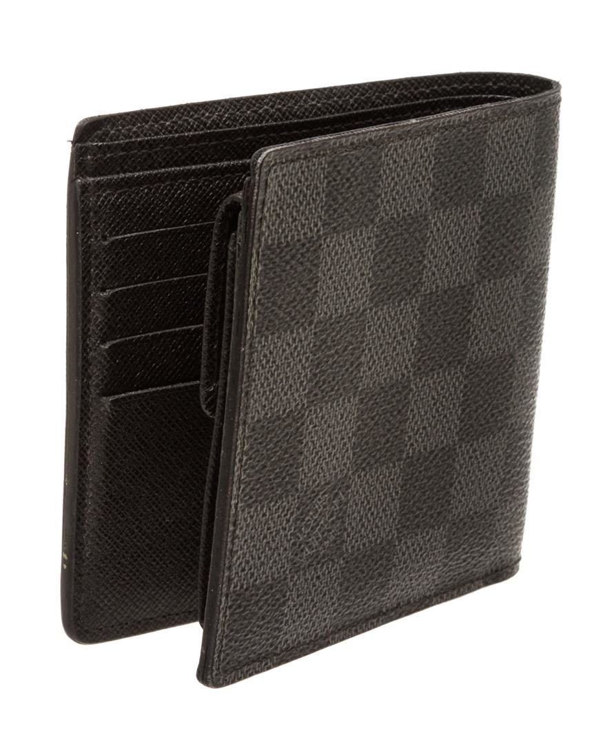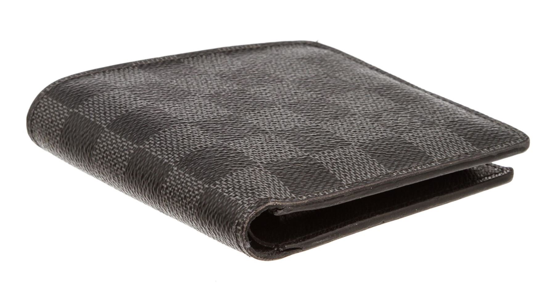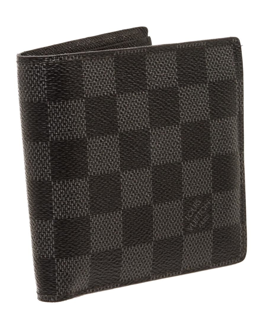 One Louis Vuitton Damier Graphite Canvas Leather Marco Bifold Wallet. Louis Vuitton signature gray and black checker damier graphite canvas on black leather men's Marco bifold wallet with leather interior, three card slots, coin pouch, two bill compartments, and one slide slot.