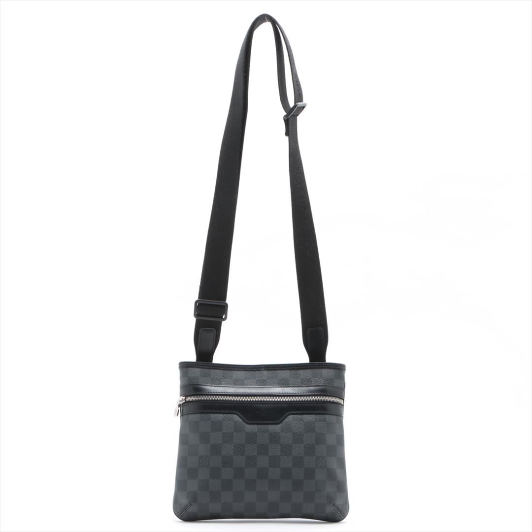 Black and grey Damier Graphite coated canvas Louis Vuitton Thomas crossbody bag with silver-tone hardware, black leather trim, one front zipper pocket, generous interior lined in black canvas featuring two flat pockets and single flat adjustable shoulder