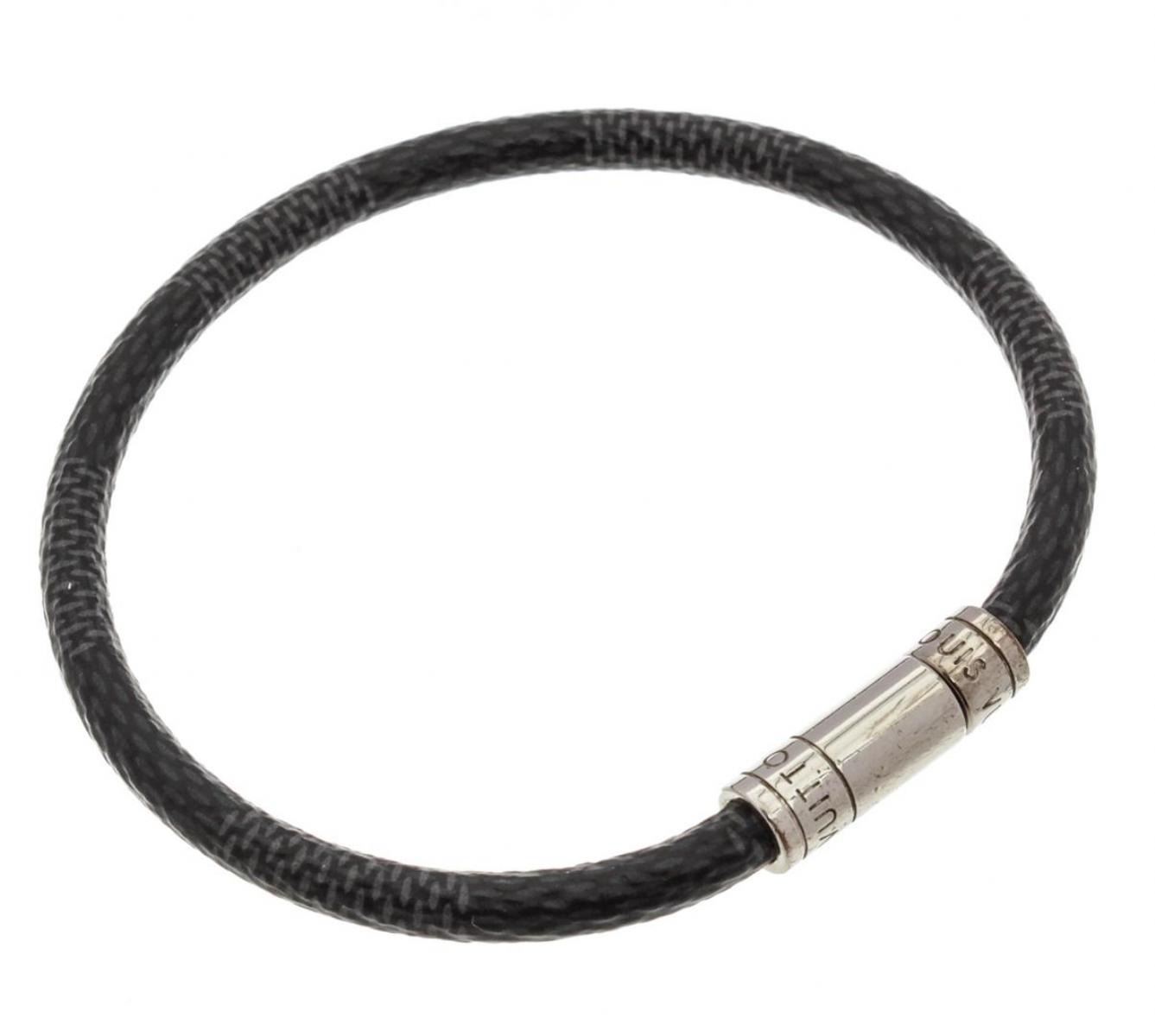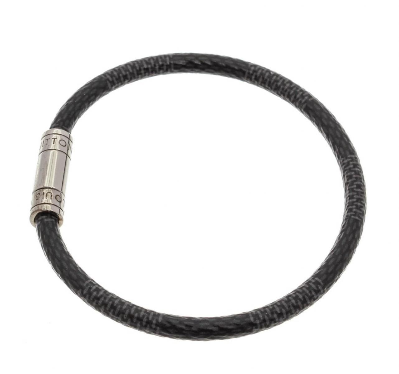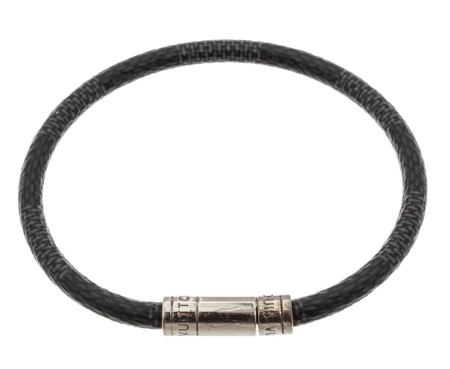 Louis Vuitton gray Damier Graphite coated canvas Keep It bracelet with silver-tone hardware.