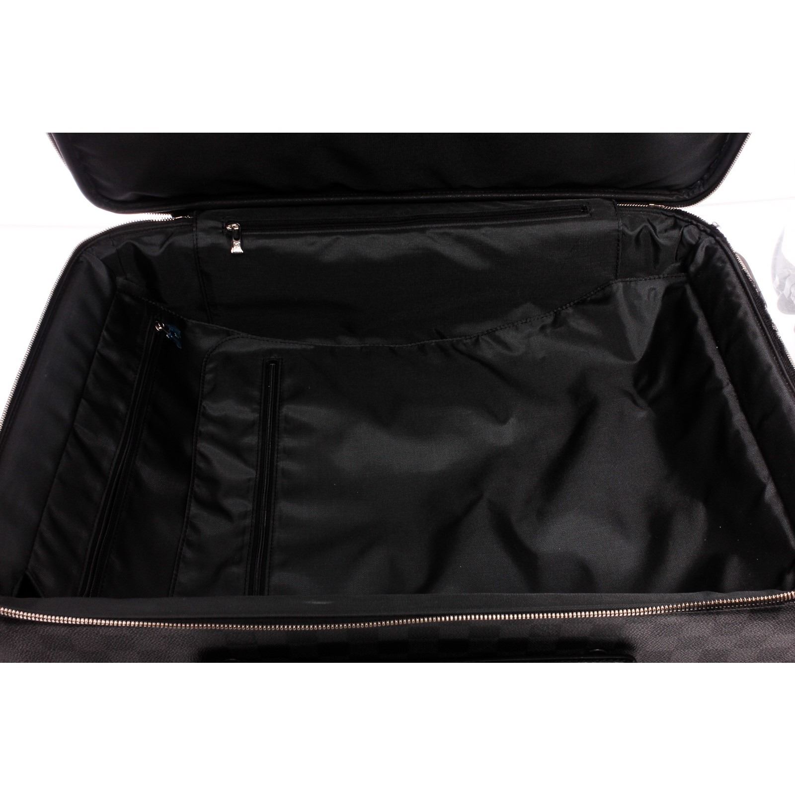 Damier Graphite coated canvas Louis Vuitton Pegase 55 with black Macassar leather trimmings, silver-tone hardware, retractable pull handle, zip pocket at front, dual wheels at base, two internal zip pockets with Velcro security strap, and two-way zip closure.