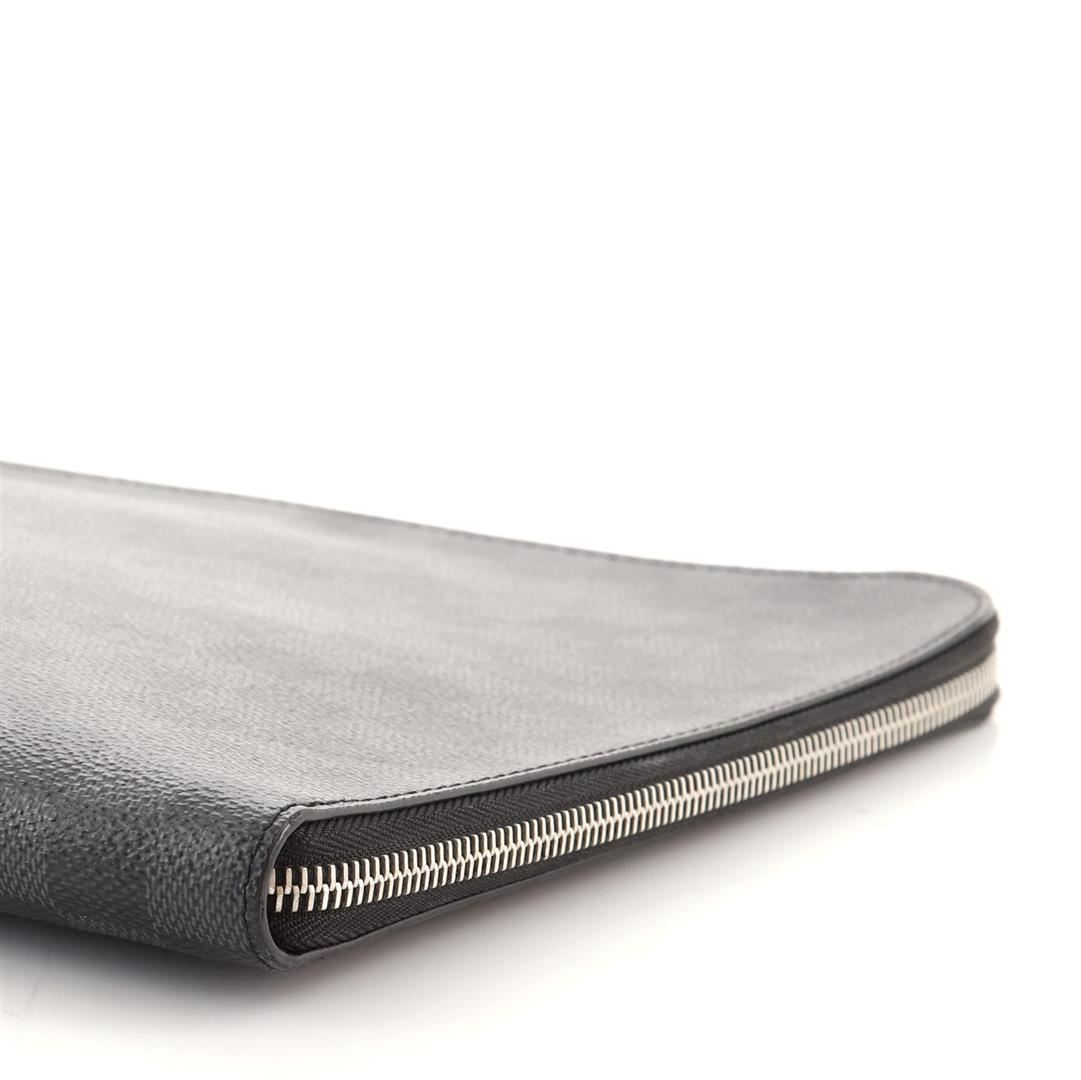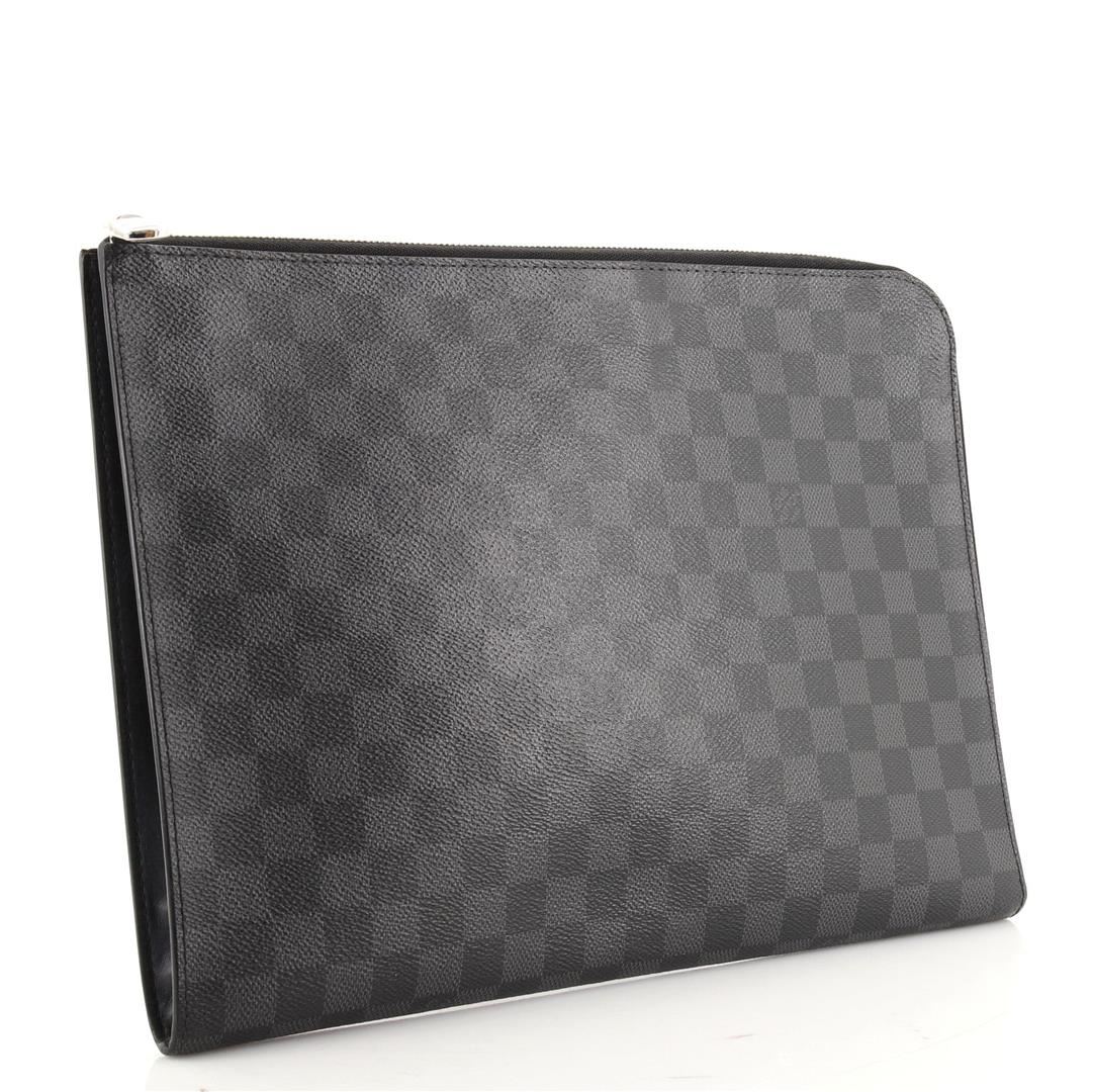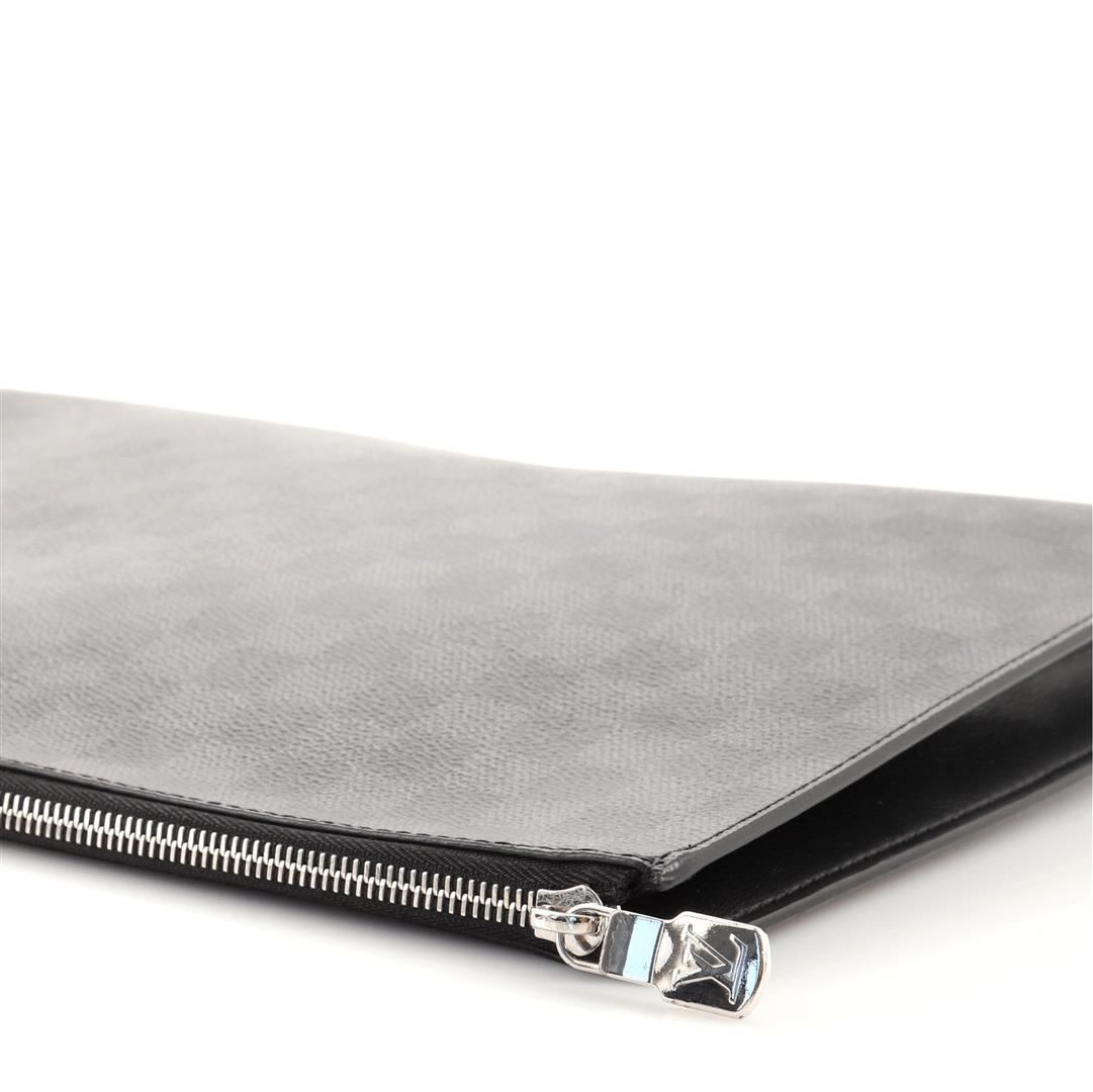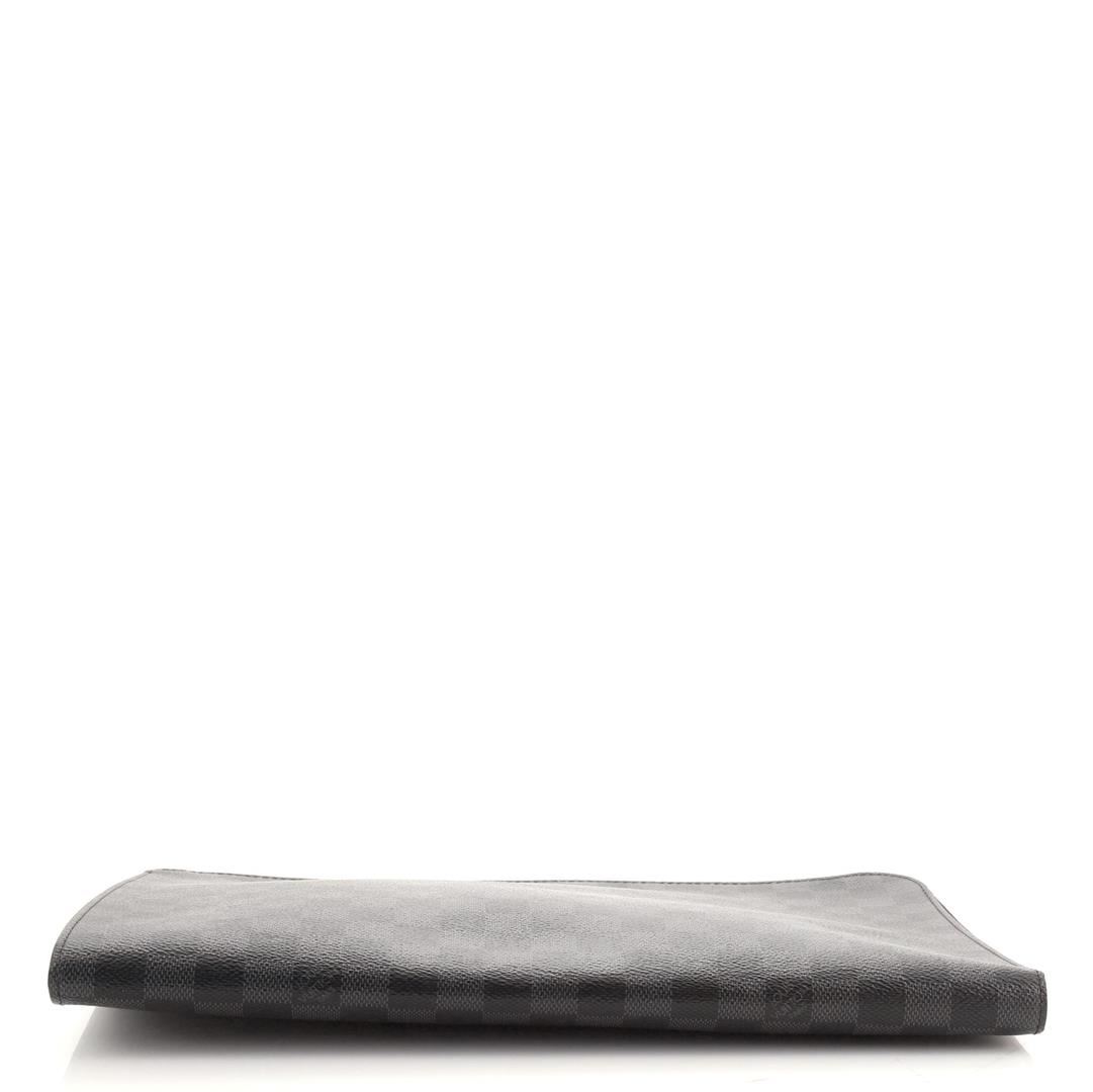 Louis Vuitton Damier Graphite Zip Around Pochette Jour GM Pouch with Damier Graphite coated canvas, silver-tone hardware, cowhide-leather lining, interior slip pocket and L-zipper closure.