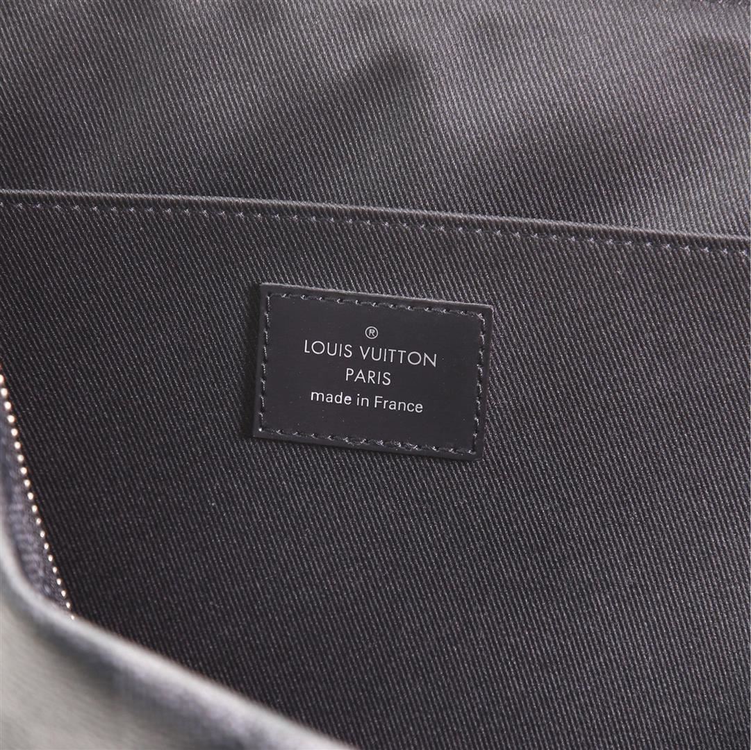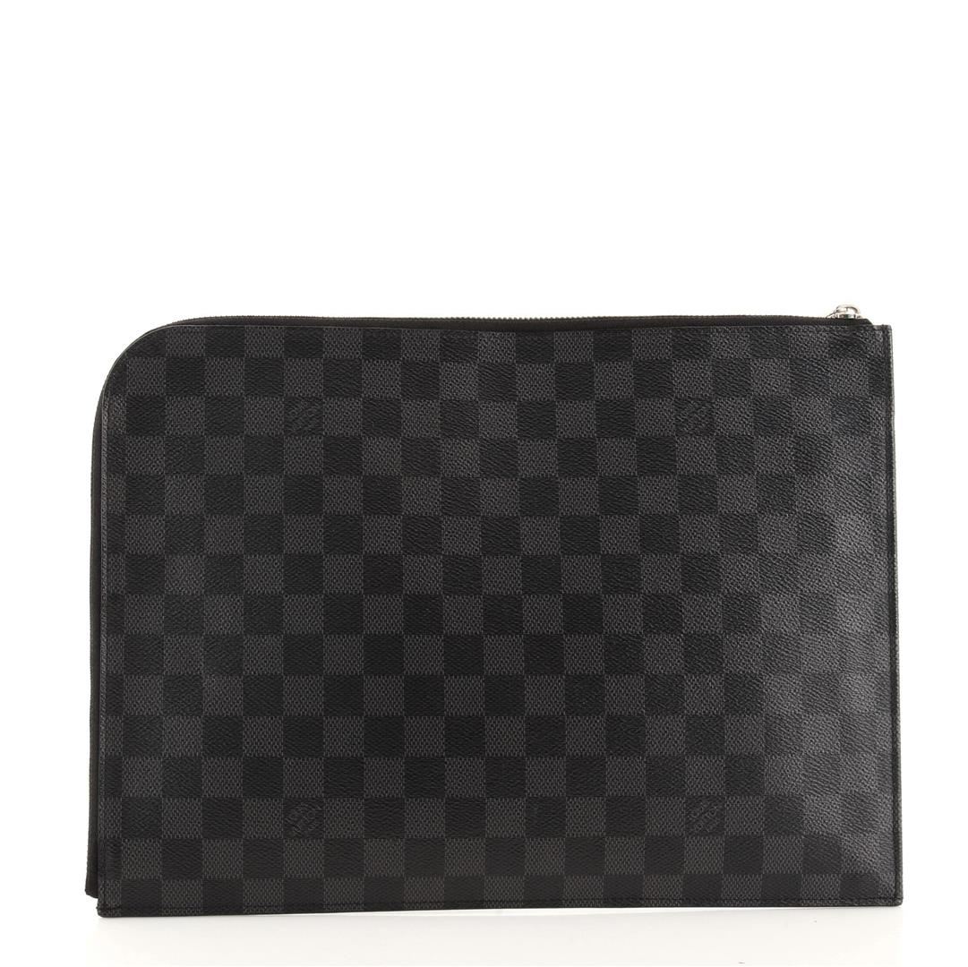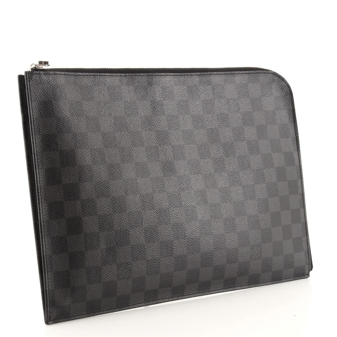 Louis Vuitton Damier Graphite Zip Around Pochette Jour GM Pouch with Damier Graphite coated canvas, silver-tone hardware, cowhide-leather lining, interior slip pocket and L-zipper closure.