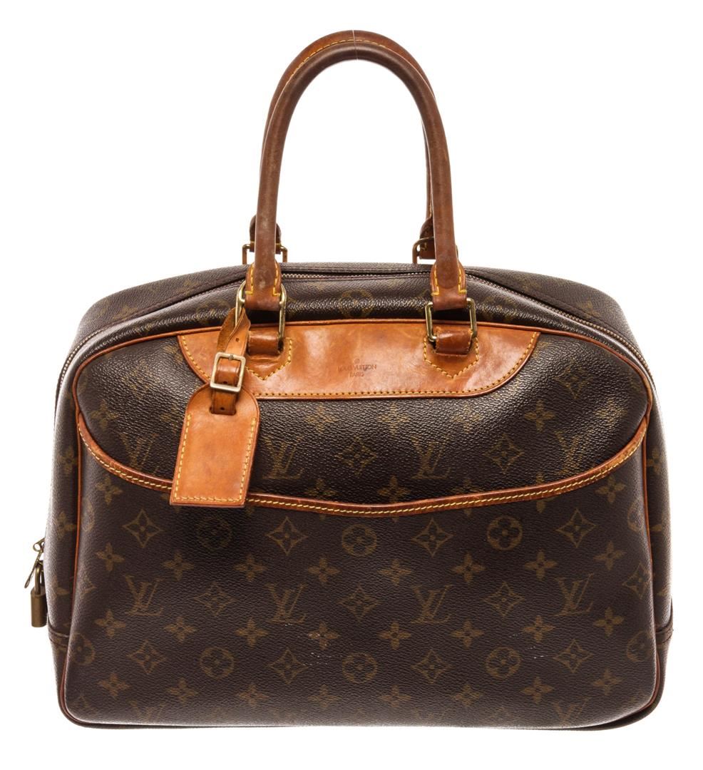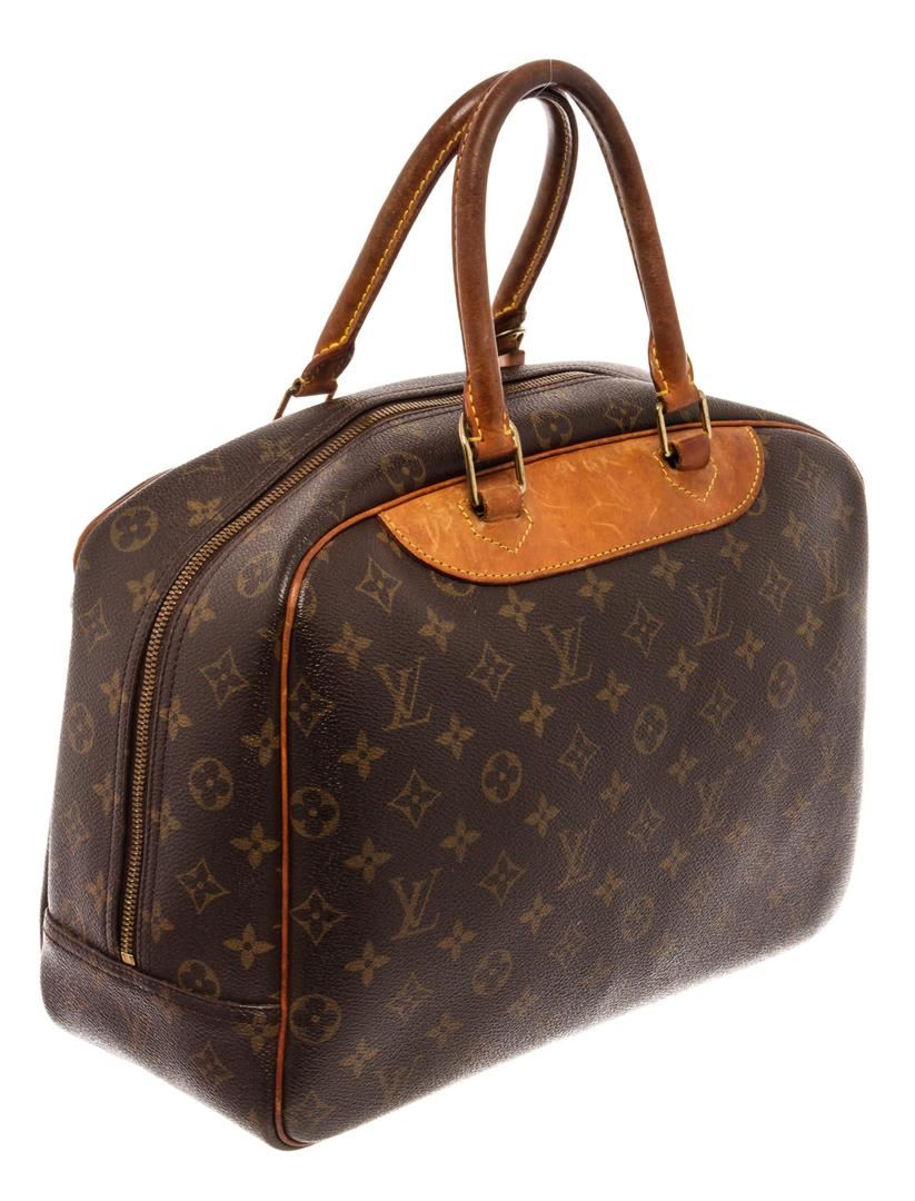 Louis Vuitton Deauville Tote. Brand: Louis Vuitton, Style: Deauville, Type: Tote, Exterior color: Brown Monogram, Exterior material: Coated Canvas, Interior color: Brown, Interior material: Canvas, Length: 14.5, Width: 5.5, Height: 11.5. Item is sold AS-I