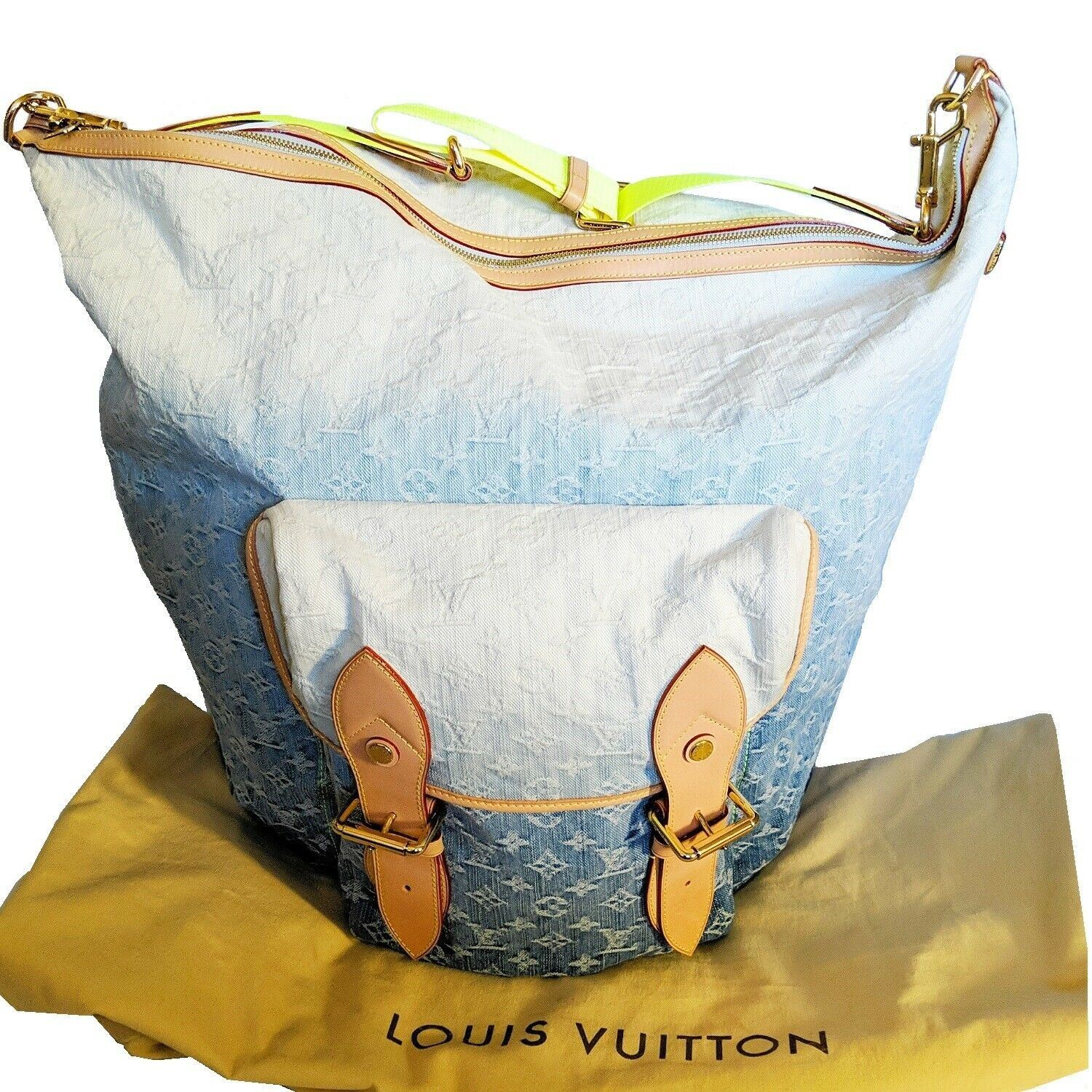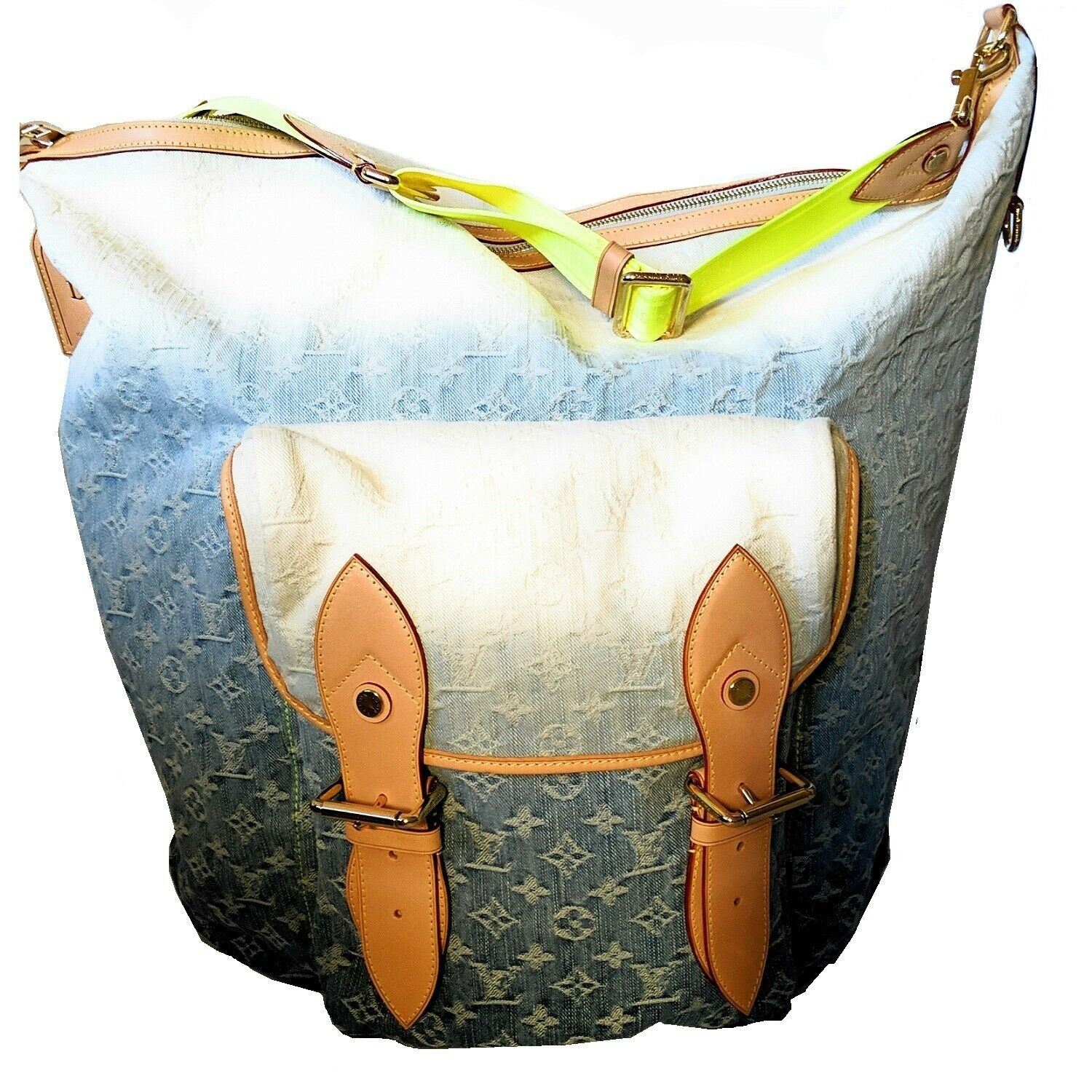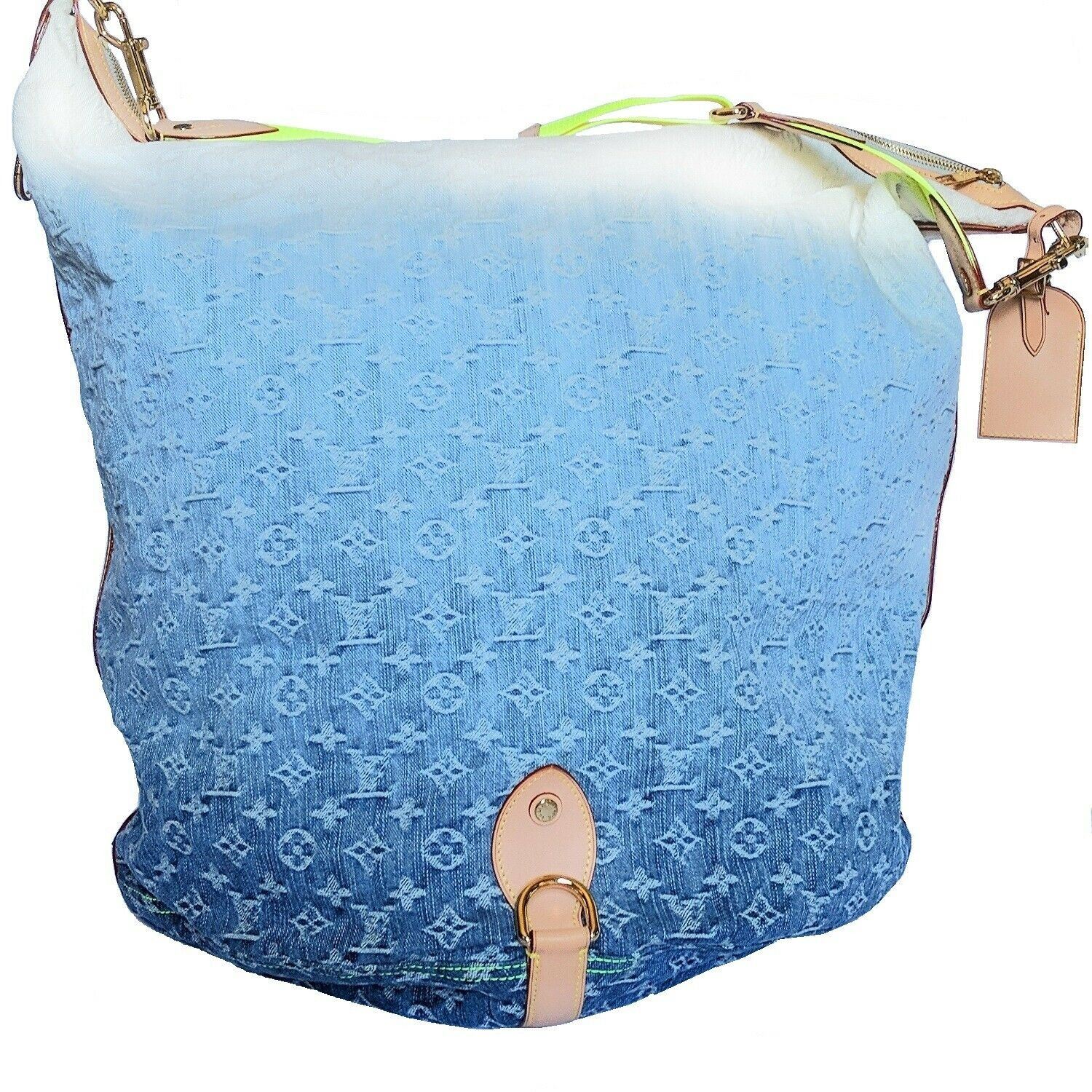 From the Louis Vuitton Spring/Summer 2010 Collection featuring a colorful ombre denim bags with bright contrast straps. Ombré blue monogram denim Louis Vuitton Sunburst bag with tan vachetta leather trim, brass hardware, neon yellow canvas shoulder strap, Alcantara lining, interior wall pocket with zip closure and front flap pocket with dual buckle closure.