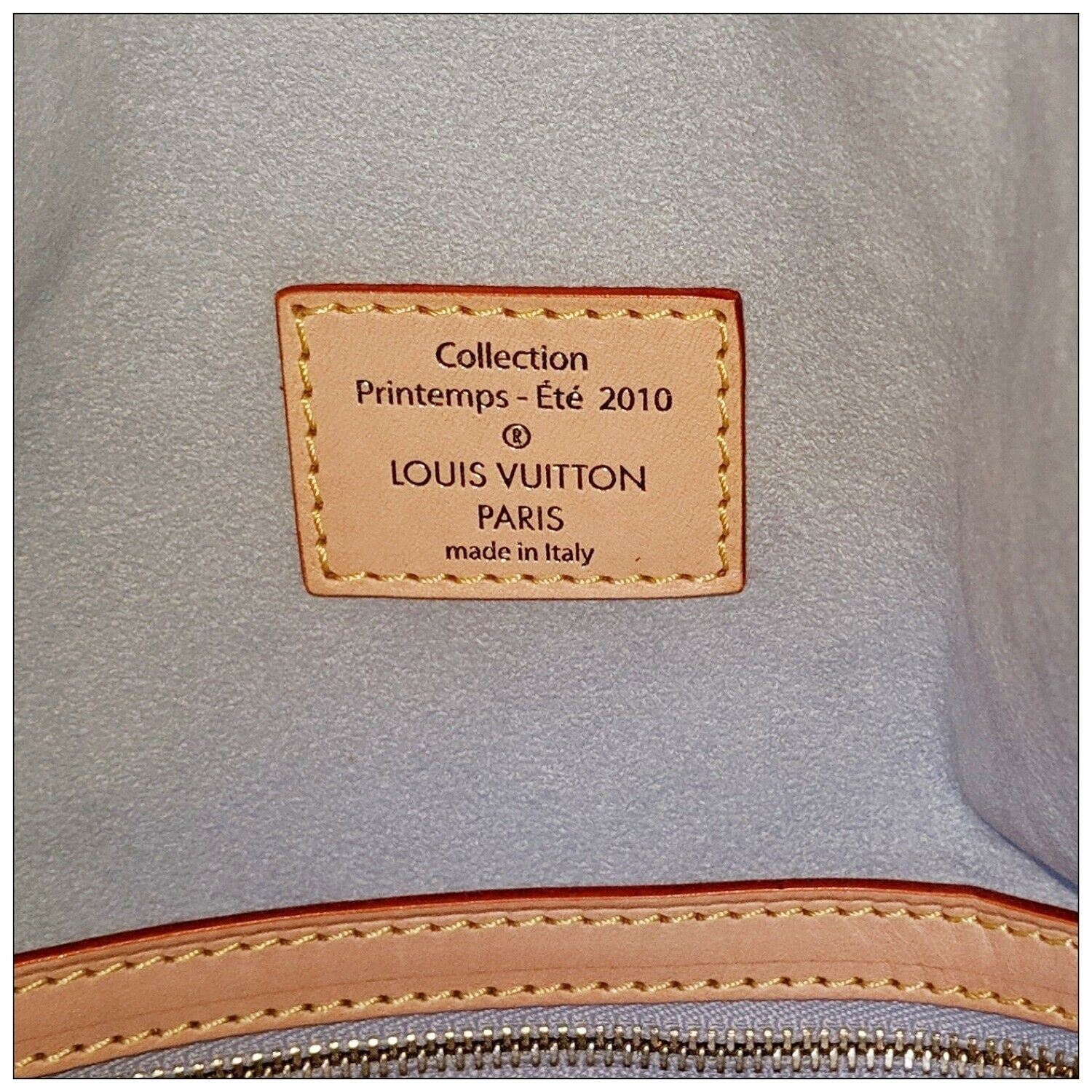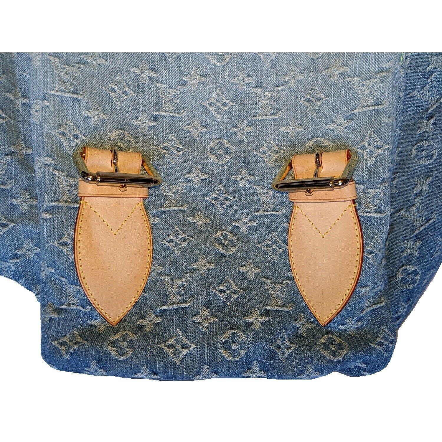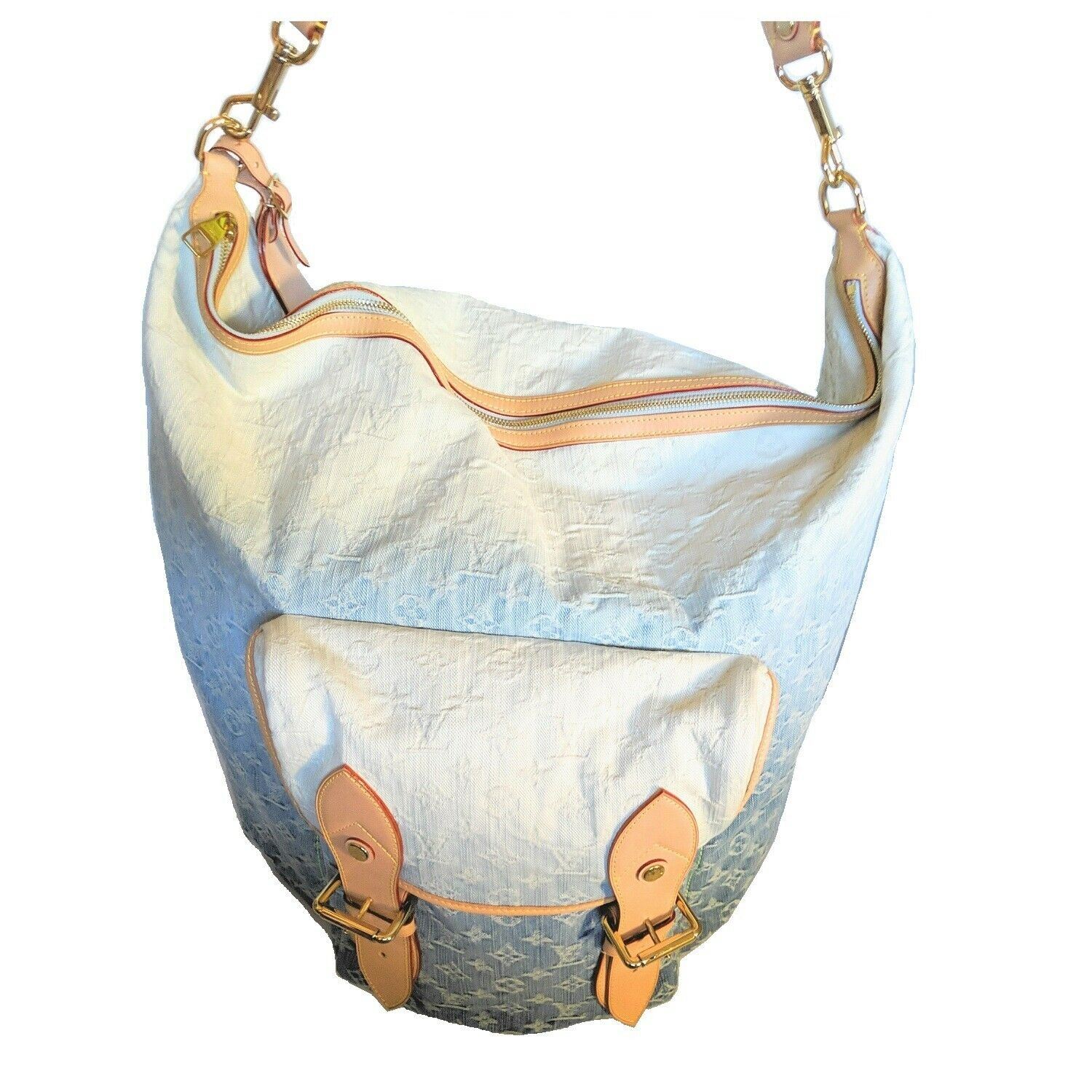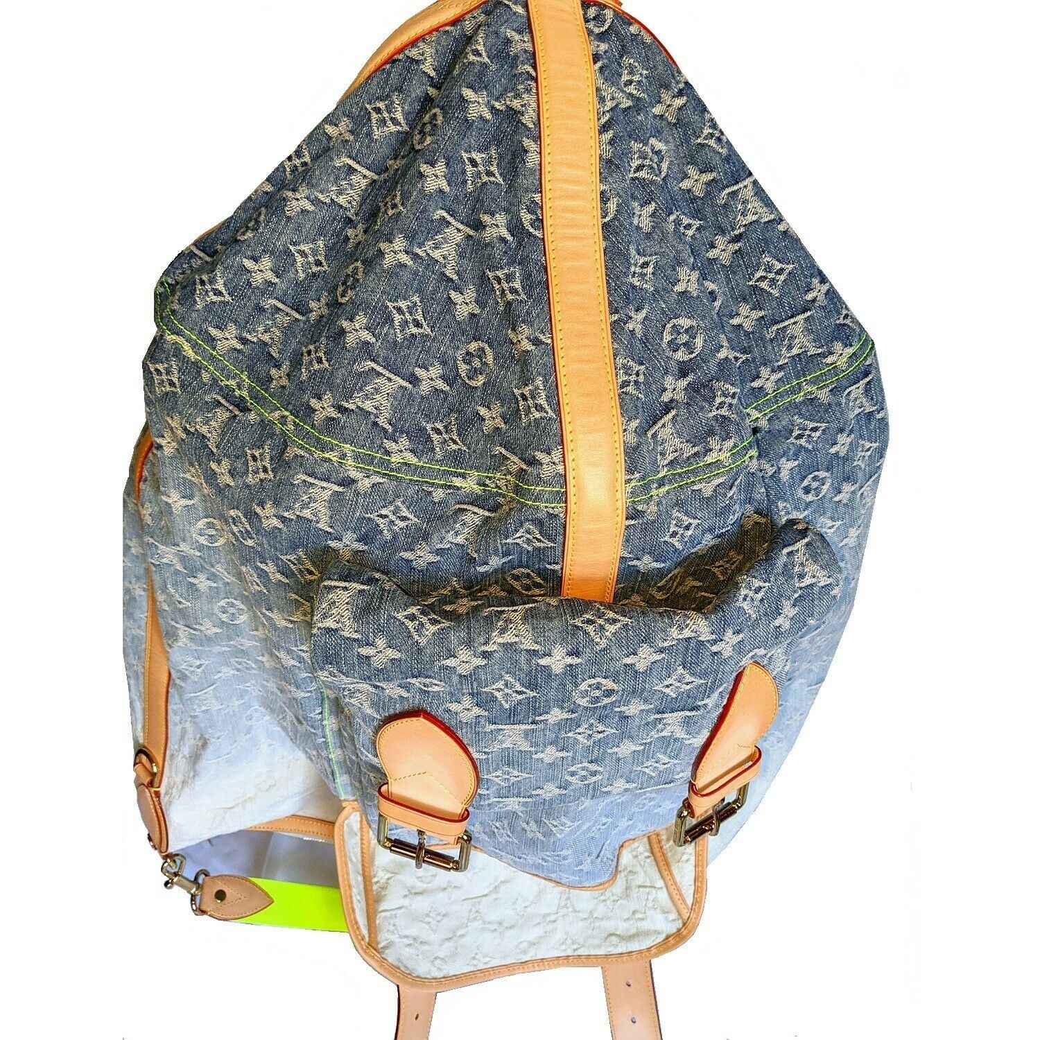 From the Louis Vuitton Spring/Summer 2010 Collection featuring a colorful ombre denim bags with bright contrast straps. Ombré blue monogram denim Louis Vuitton Sunburst bag with tan vachetta leather trim, brass hardware, neon yellow canvas shoulder strap, Alcantara lining, interior wall pocket with zip closure and front flap pocket with dual buckle closure.