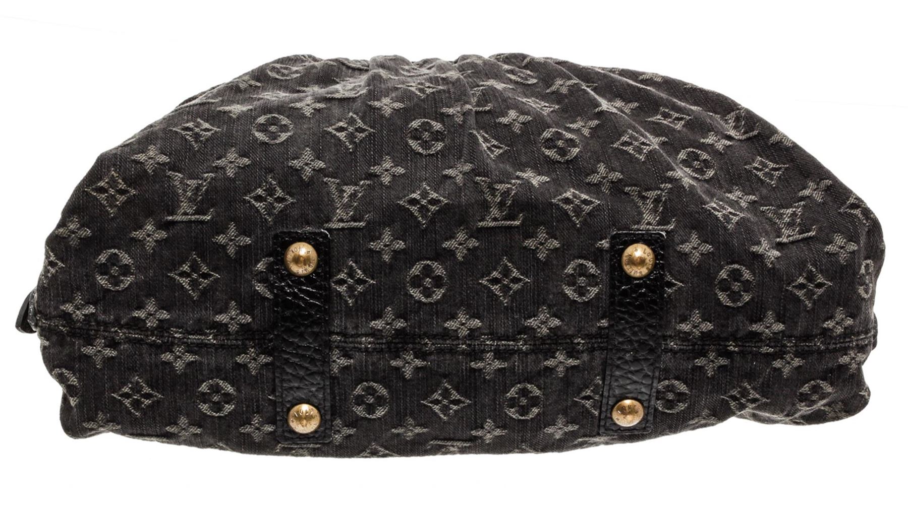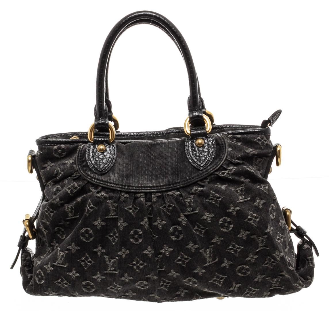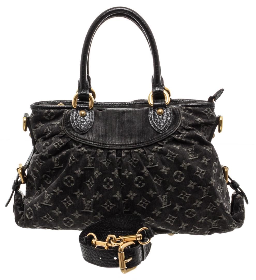 Denim Louis Vuitton Neo Cabby MM with brass hardware, tan leather trim, dual rolled top handles, single detachable flat shoulder strap with buckle adjustment, protective feet at base, Alcantara lining, dual interior slit pockets and zip closure at top. Authentic.