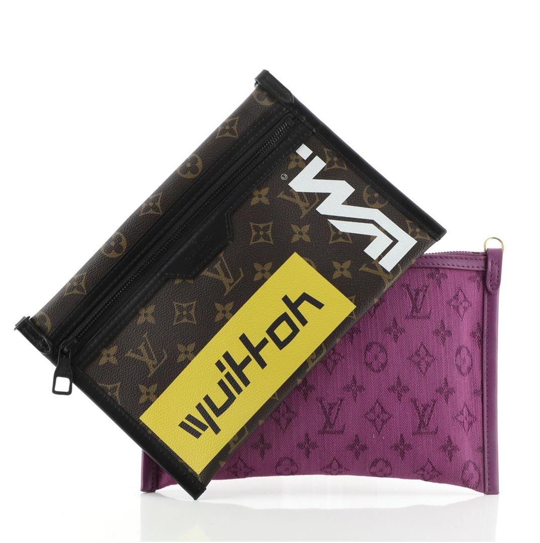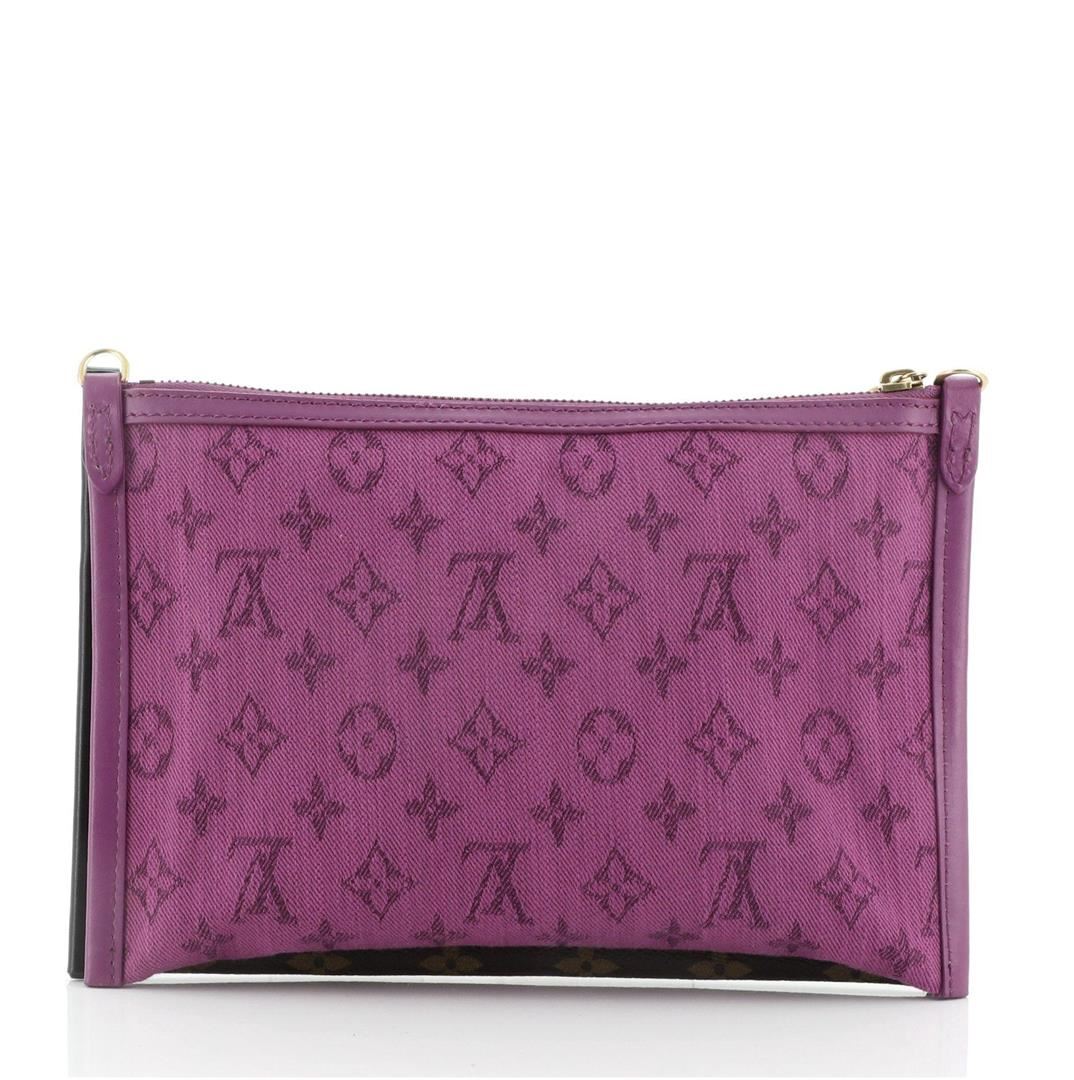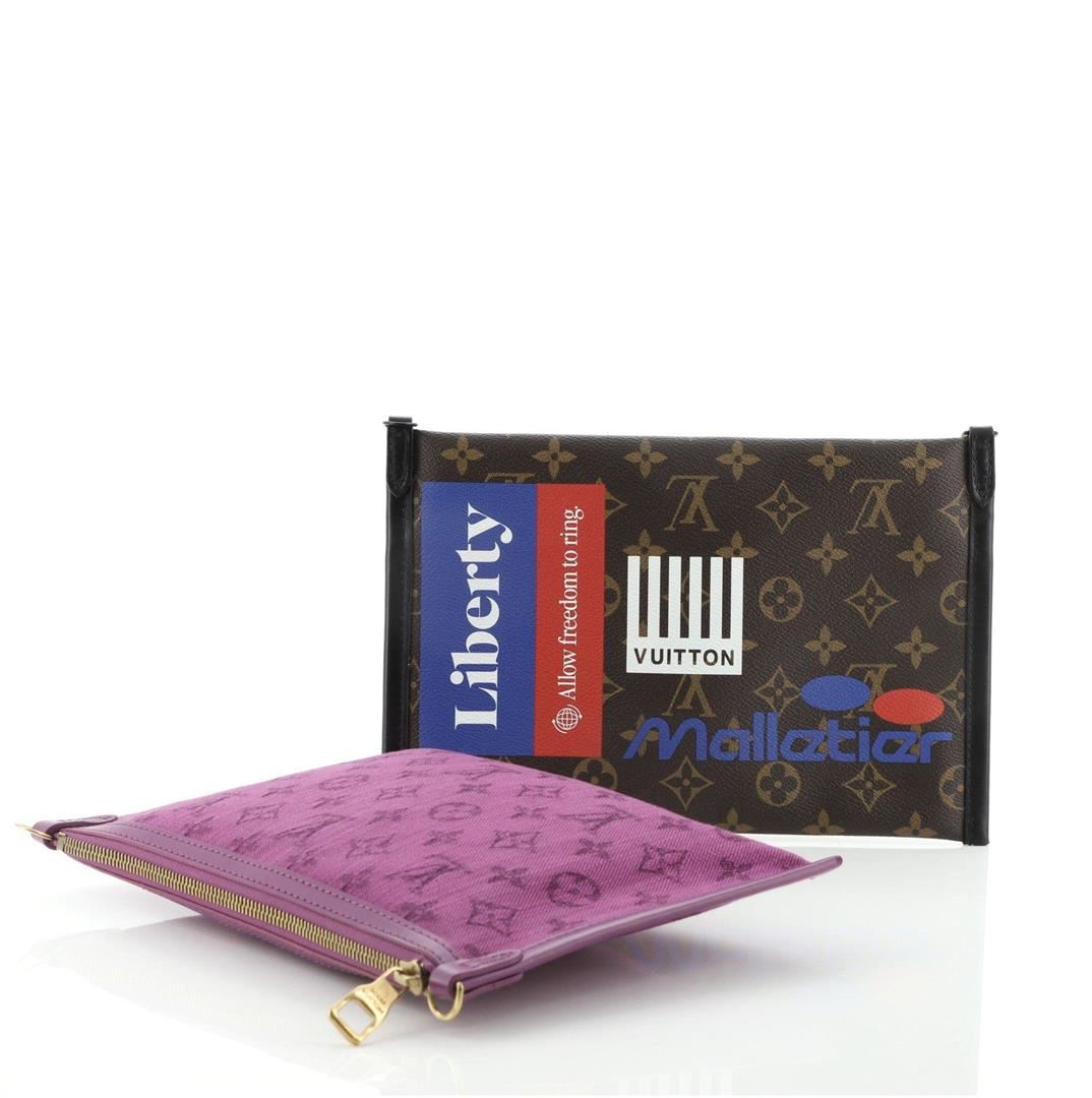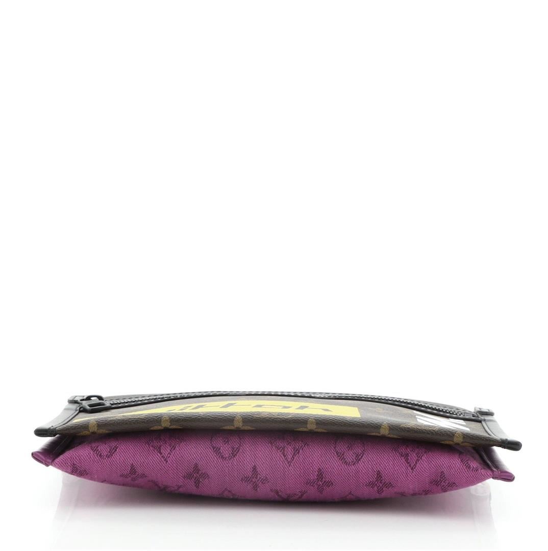 Louis Vuitton Double Flat Messenger Bag Limited Edition Logo Story Monogram Canvas and Denim with gold-tone hardware, leather & chain strap, two zipper pockets, purple denim pouch, brown leather pouch, fabric lining and zipper closure. Height 7", Width 10.5", Depth 0.5", Strap Drop 23"Features: • Shoulder Bag Measurements: 7 in / 18 cm 0.5 in / 1 cm 10.5 in / 27 cm Condition: Pre-Owned Good