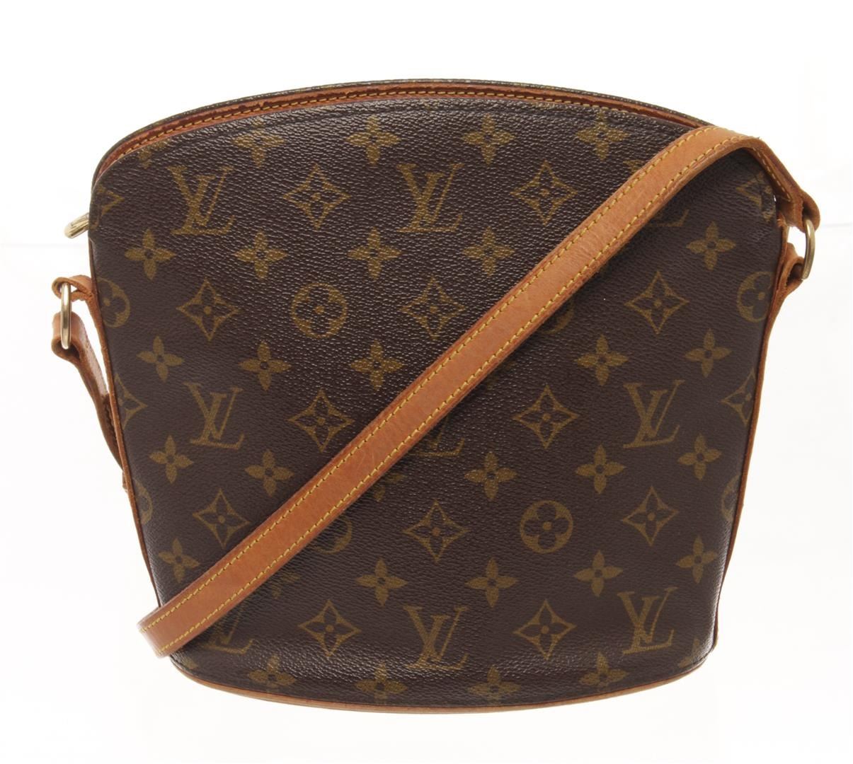 Louis Vuitton Drouot Crossbody broen monogram Canvas. Brand: Louis Vuitton, Style: Drouot, Type: Crossbody, Exterior Color: broen monogram, Exterior Material: Canvas, Exterior Pockets: None, Interior Color: beige, Interior Material: fabric, Interior Pockets: one, Closure: zip closure, Handle/Strap Type: crossbody strap, Length: 8, Width: 3 1/2, Height: 8 1/2, Strap Drop: 18. Condition: discolorstion inside interior pocket, water damage on bottom. Item is sold AS-IS and all information pertaining to this lot is available in the photos or this description.