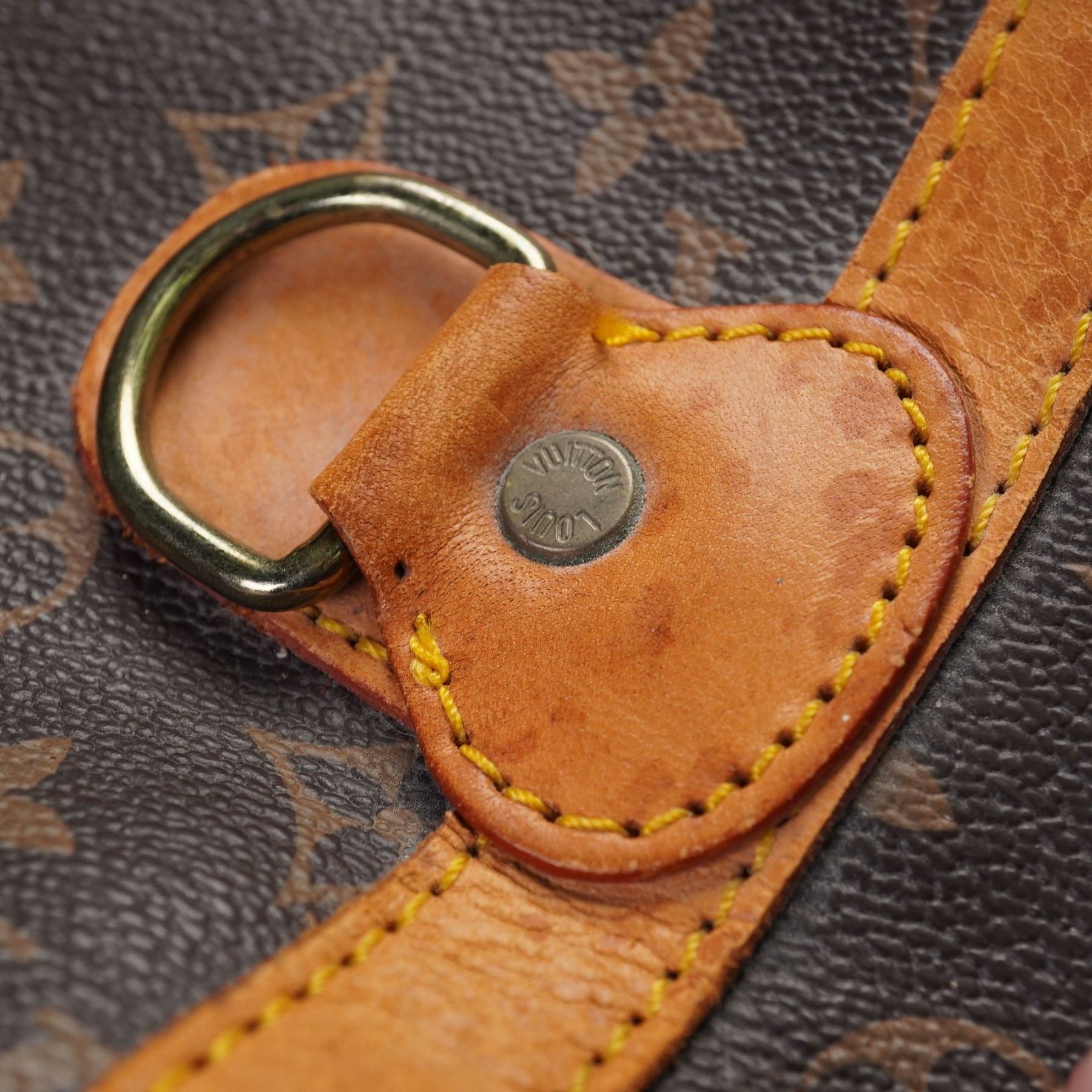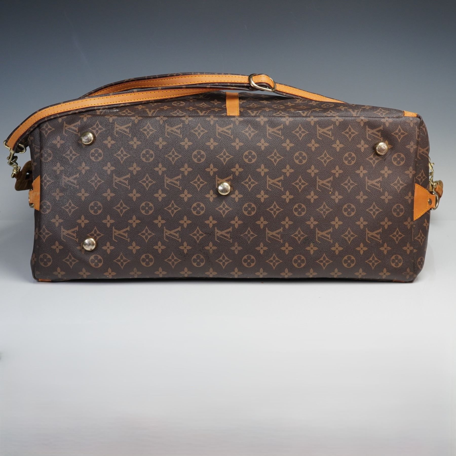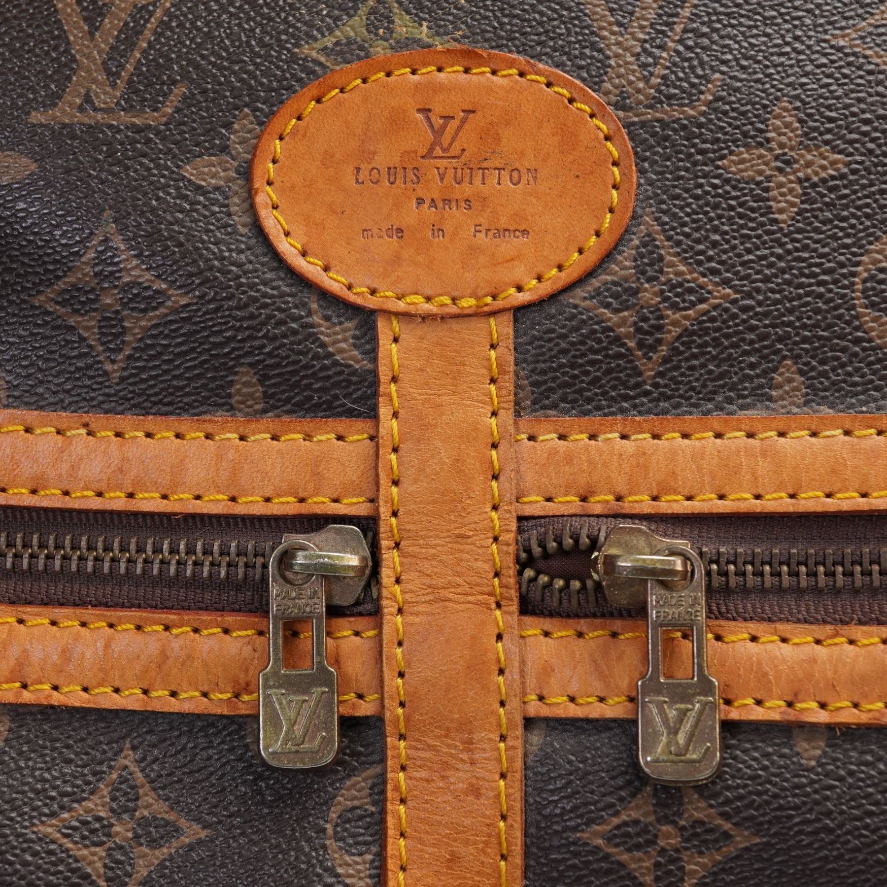 Classic Louis Vuitton duffle bag crafted in the brand's signature brown Monogram coated canvas with natural Vachetta leather trim and gold-tone hardware. The spacious design features dual rolled leather handles, an adjustable and detachable shoulder strap, and dual exterior zip pockets with LV-logo zipper pulls. Interior lined in brown textile with a leather-trimmed zip pocket stamped "Louis Vuitton Paris Made in France." The timeless design combines functionality and style, ideal for travel or everyday luxury.
