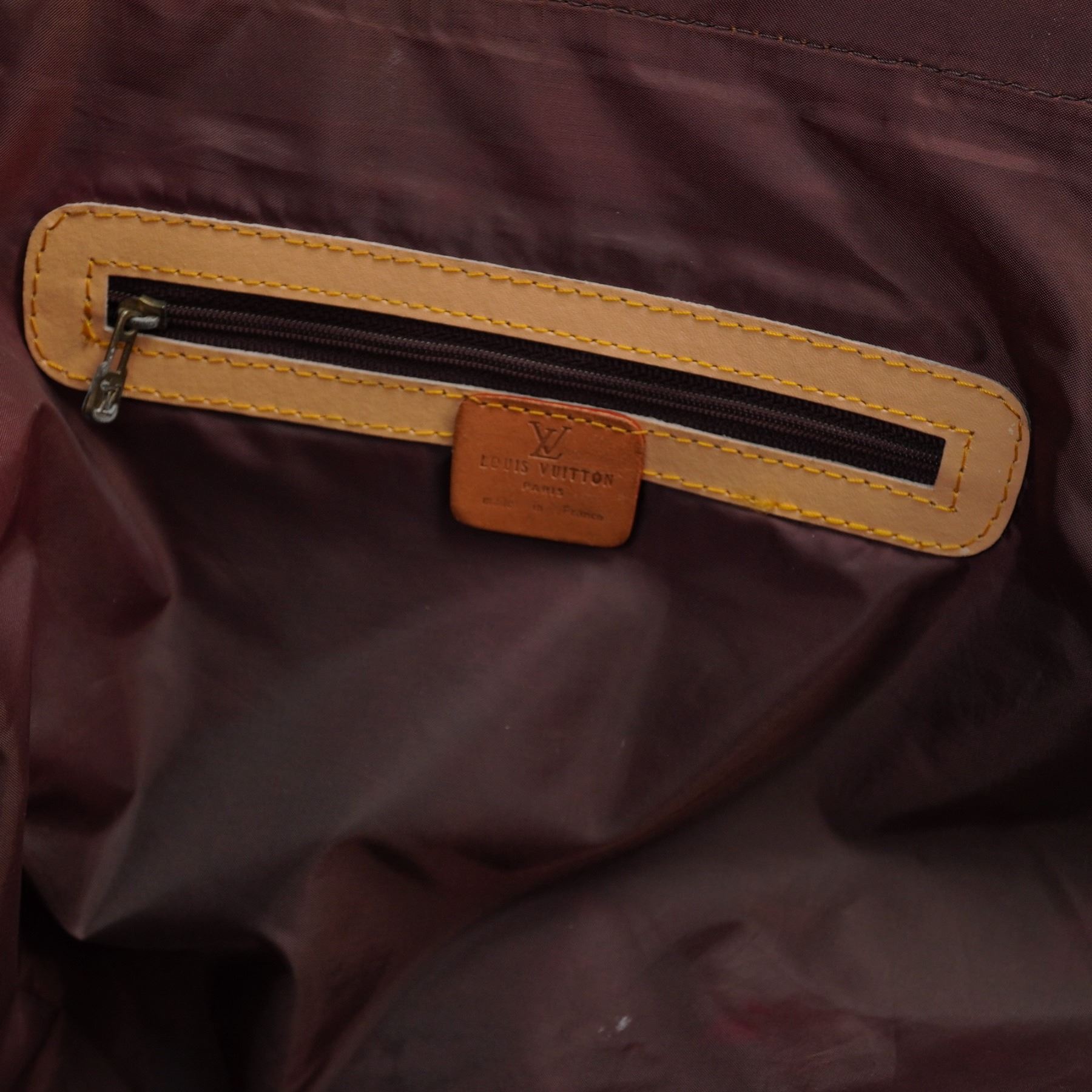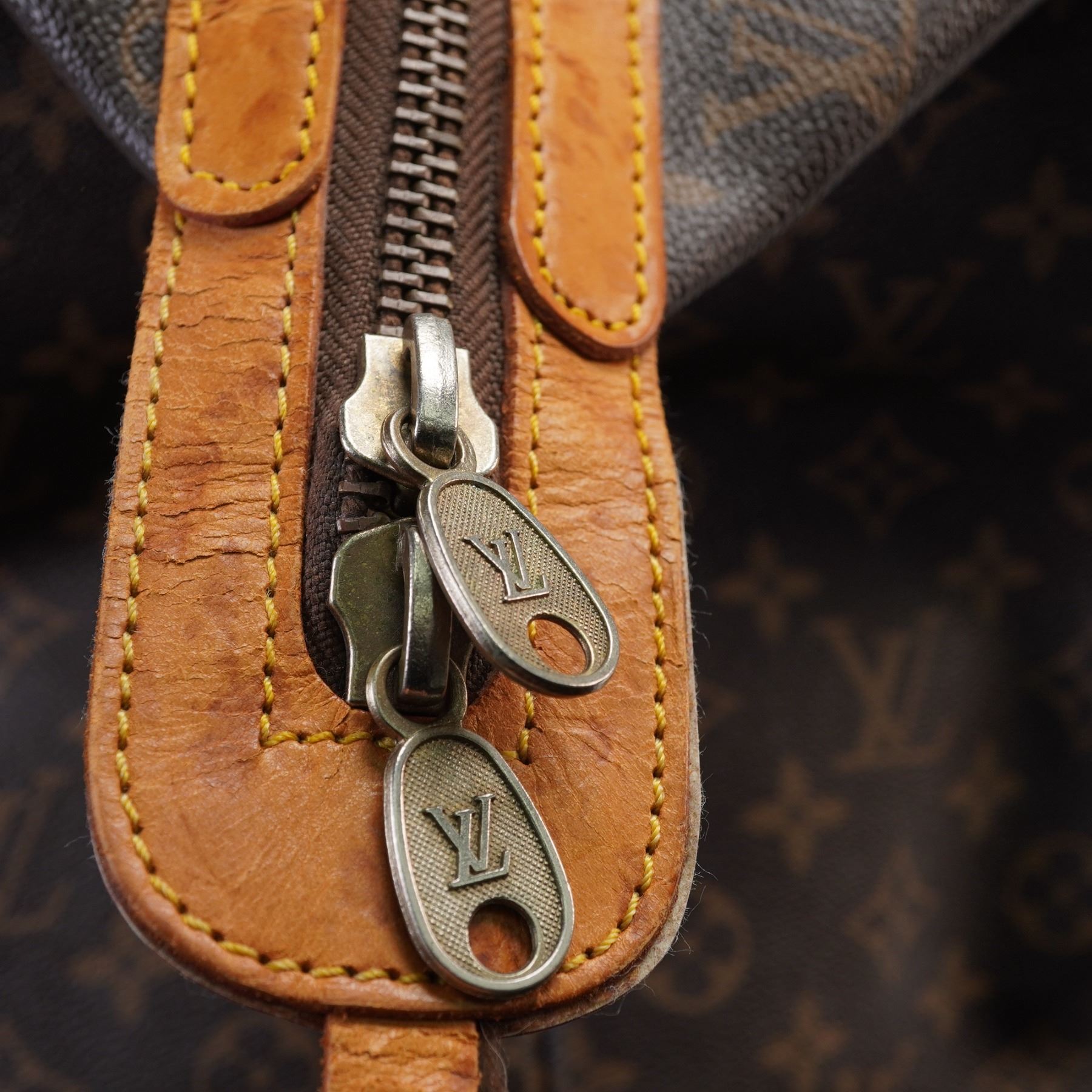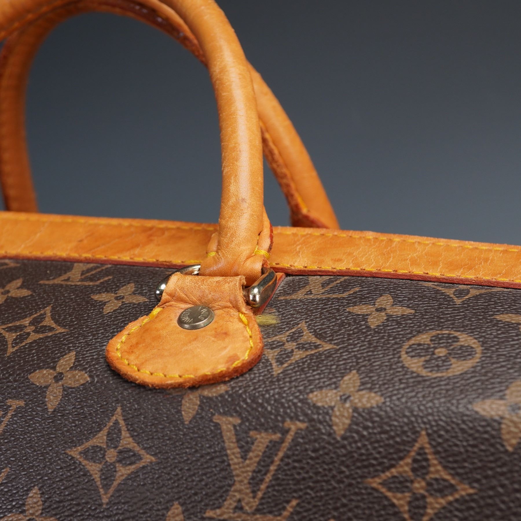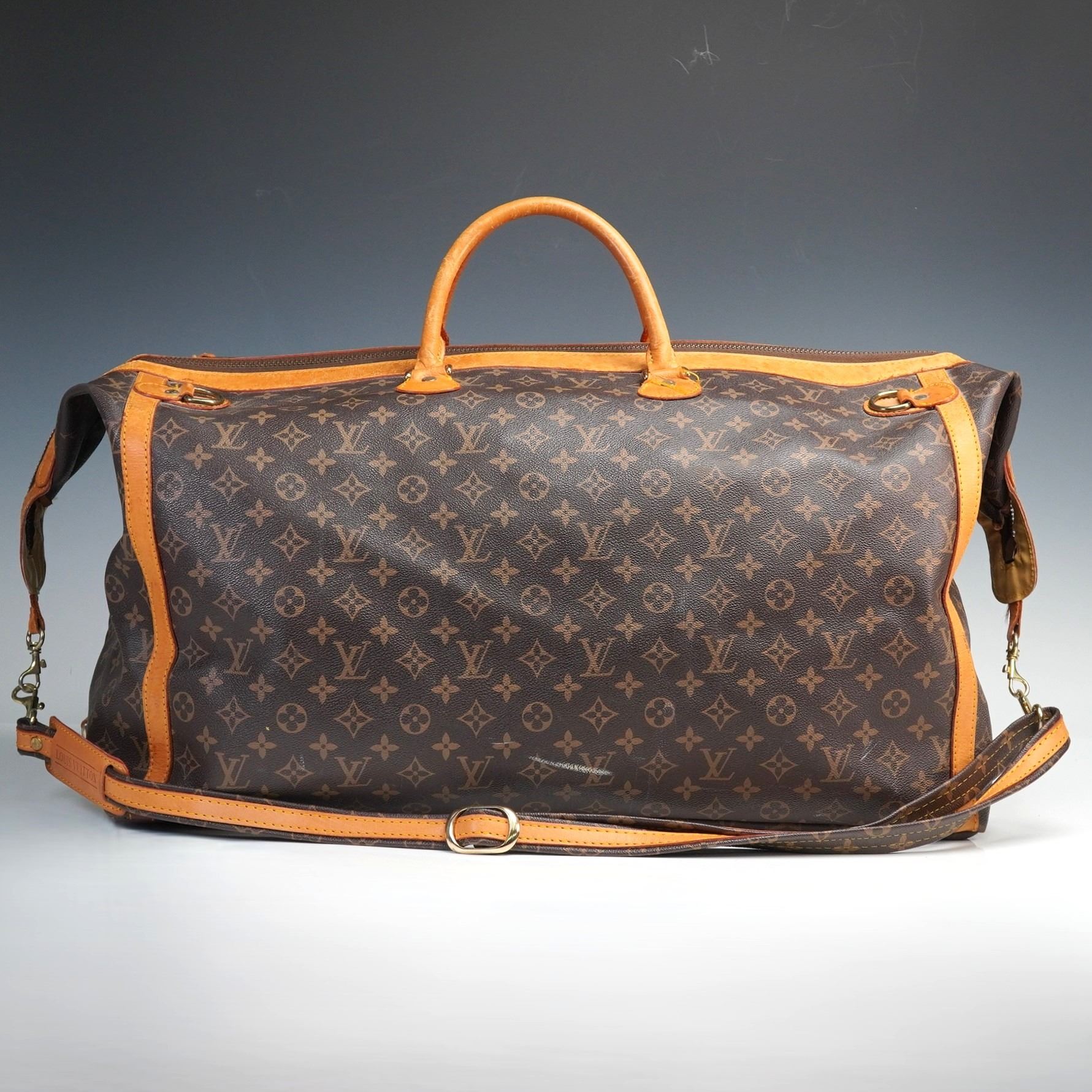 Classic Louis Vuitton duffle bag crafted in the brand's signature brown Monogram coated canvas with natural Vachetta leather trim and gold-tone hardware. The spacious design features dual rolled leather handles, an adjustable and detachable shoulder strap, and dual exterior zip pockets with LV-logo zipper pulls. Interior lined in brown textile with a leather-trimmed zip pocket stamped "Louis Vuitton Paris Made in France." The timeless design combines functionality and style, ideal for travel or everyday luxury.