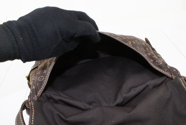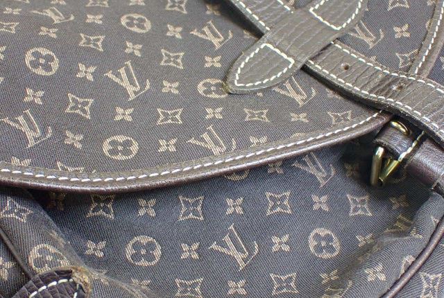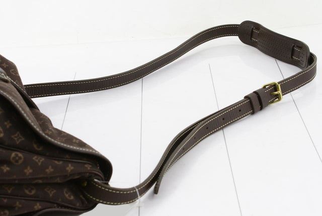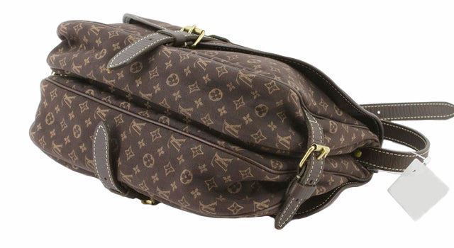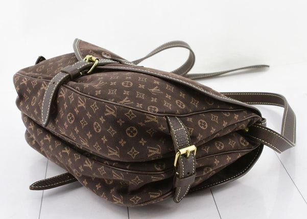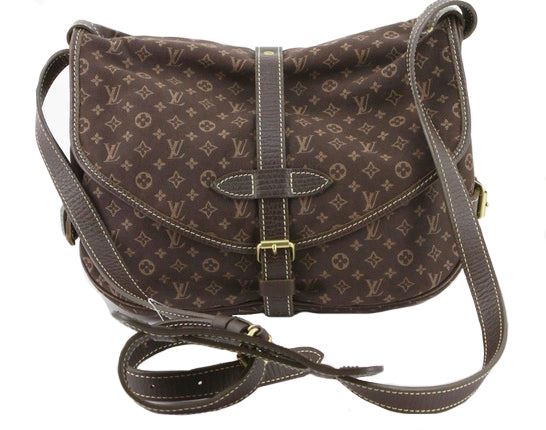 Ebene Monogram Mini Lin canvas Louis Vuitton Saumur th gold-tone hardware, tan vachetta leather trim, single adjustable flat shoulder strap, canvas lining, dual compartments at exterior, three pockets at interior walls and dual buckle closures at exterior