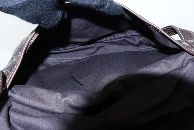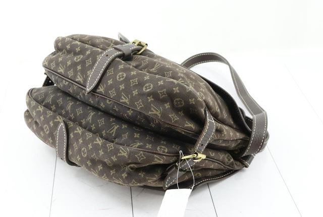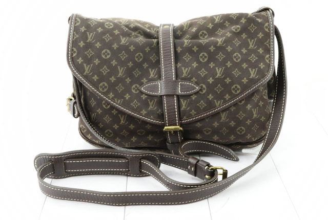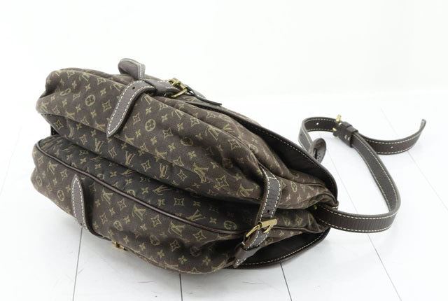 Ebene Monogram Mini Lin canvas Louis Vuitton Saumur th gold-tone hardware, tan vachetta leather trim, single adjustable flat shoulder strap, canvas lining, dual compartments at exterior, three pockets at interior walls and dual buckle closures at exterior