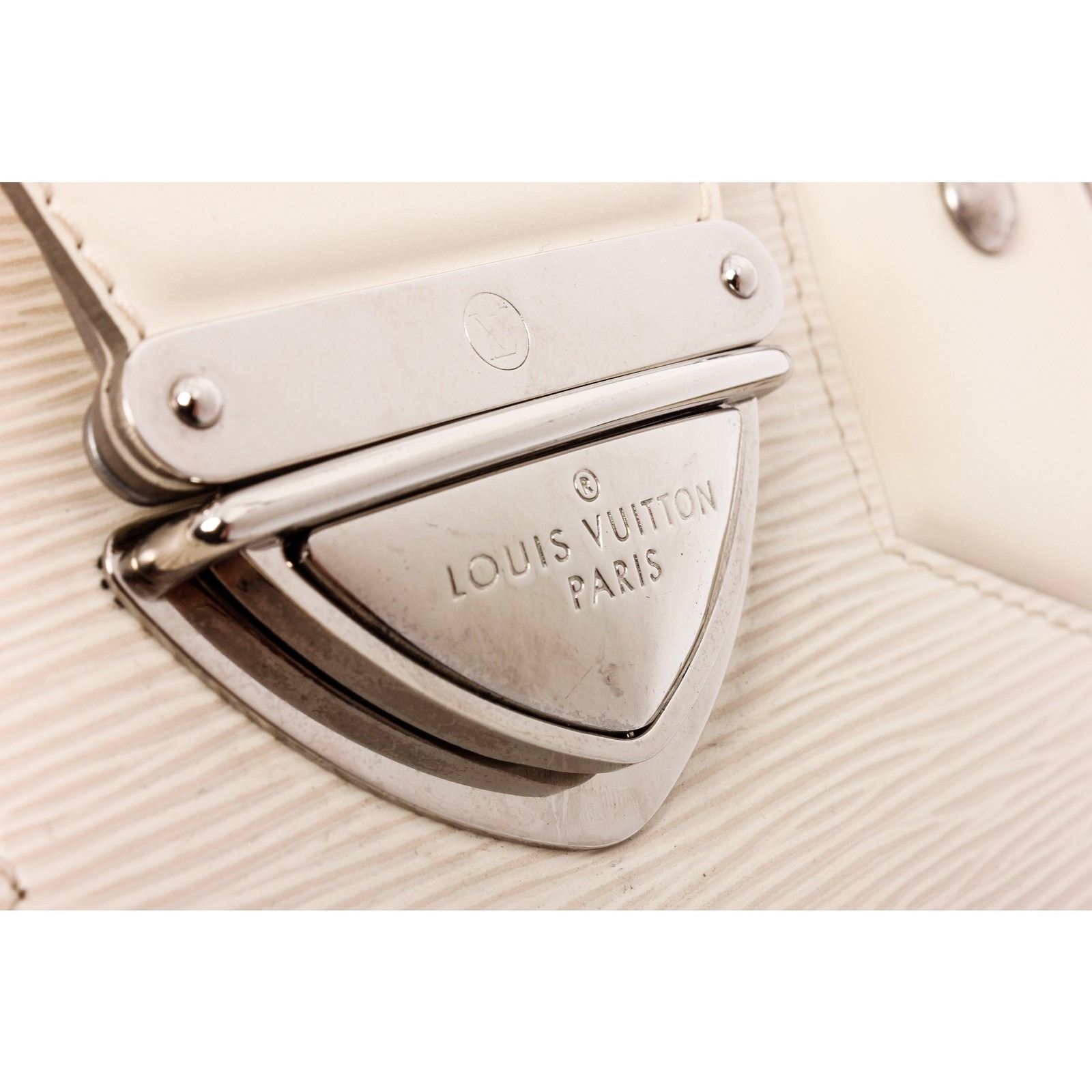 White Epi leather Louis Vuitton Montaigne Bowling GM with silver-tone hardware, dual rolled top handles, protective feet at base, exterior slit pocket at back, tonal woven lining, dual slit pockets at interior wall and zip closure at top with additional push-lock closure at front strap. Includes lock, keys and clochette.