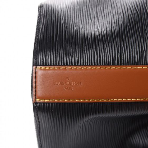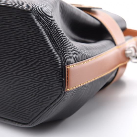 Bucket bag that is crafted of Louis Vuitton signature textured epi leather in classic black. The bag features an adjustable handle, an optional monogram shoulder strap and matte silver hardware. The top is open to a matching microfiber interior with a brown leather removable pochette.