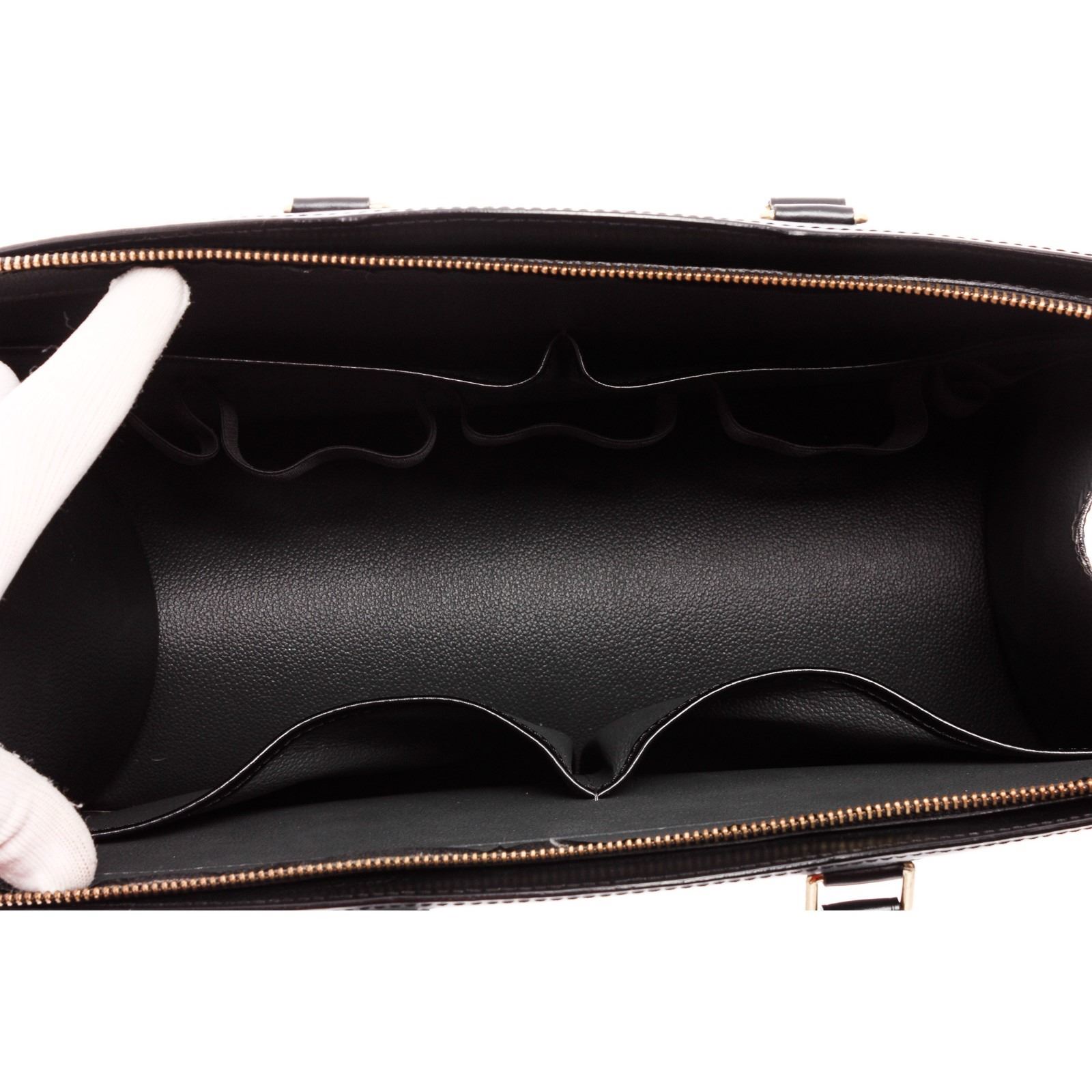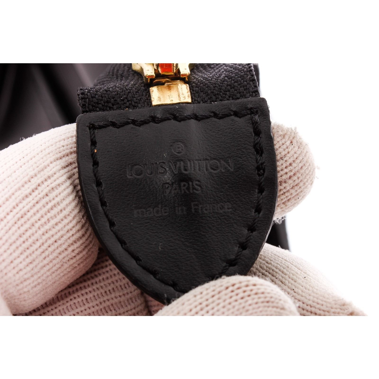 Black Epi leather Louis Vuitton Riviera Bag with brass hardware, single pocket at front exterior, dual rolled top handles, charcoal grey leather lining, four pockets at interior walls, elastic holders at interior and zip closure at top.