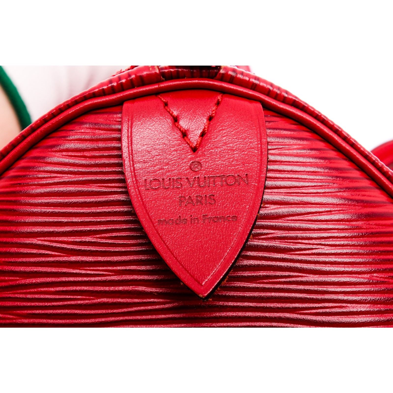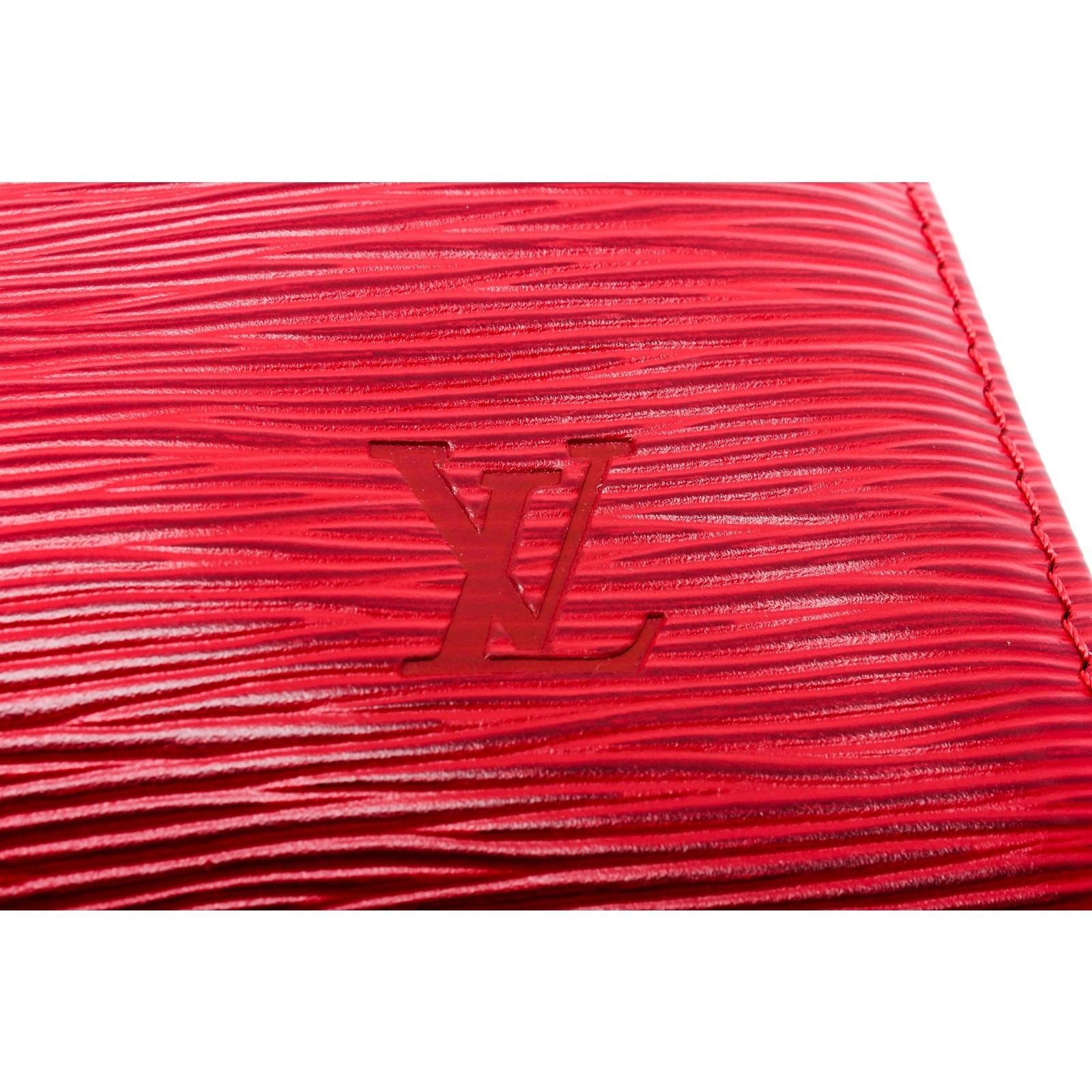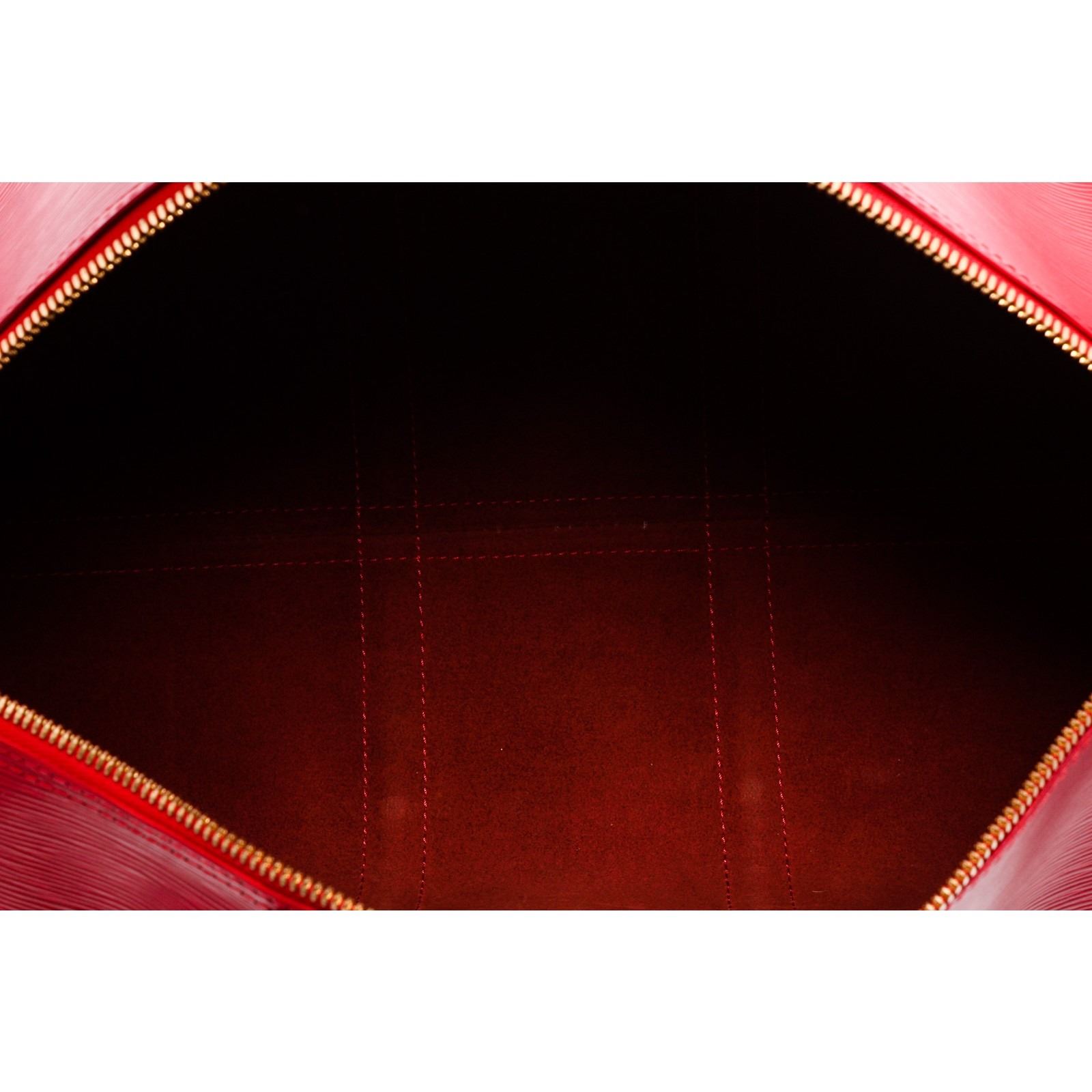 Red Epi leather Louis Vuitton Keepall 45 with brass hardware, dual rolled top handles, exterior pocket at side, tonal suede lining and zip closure at top.