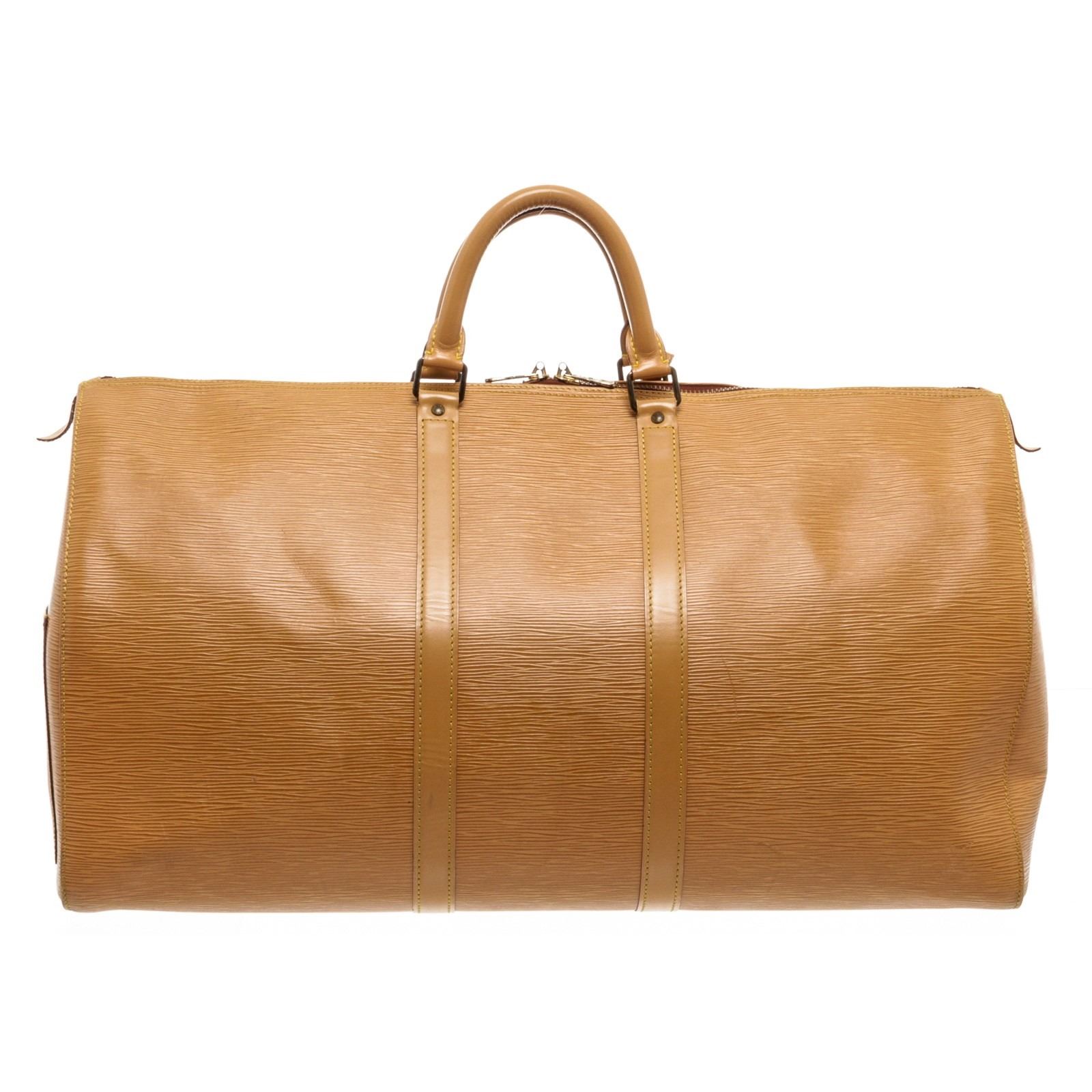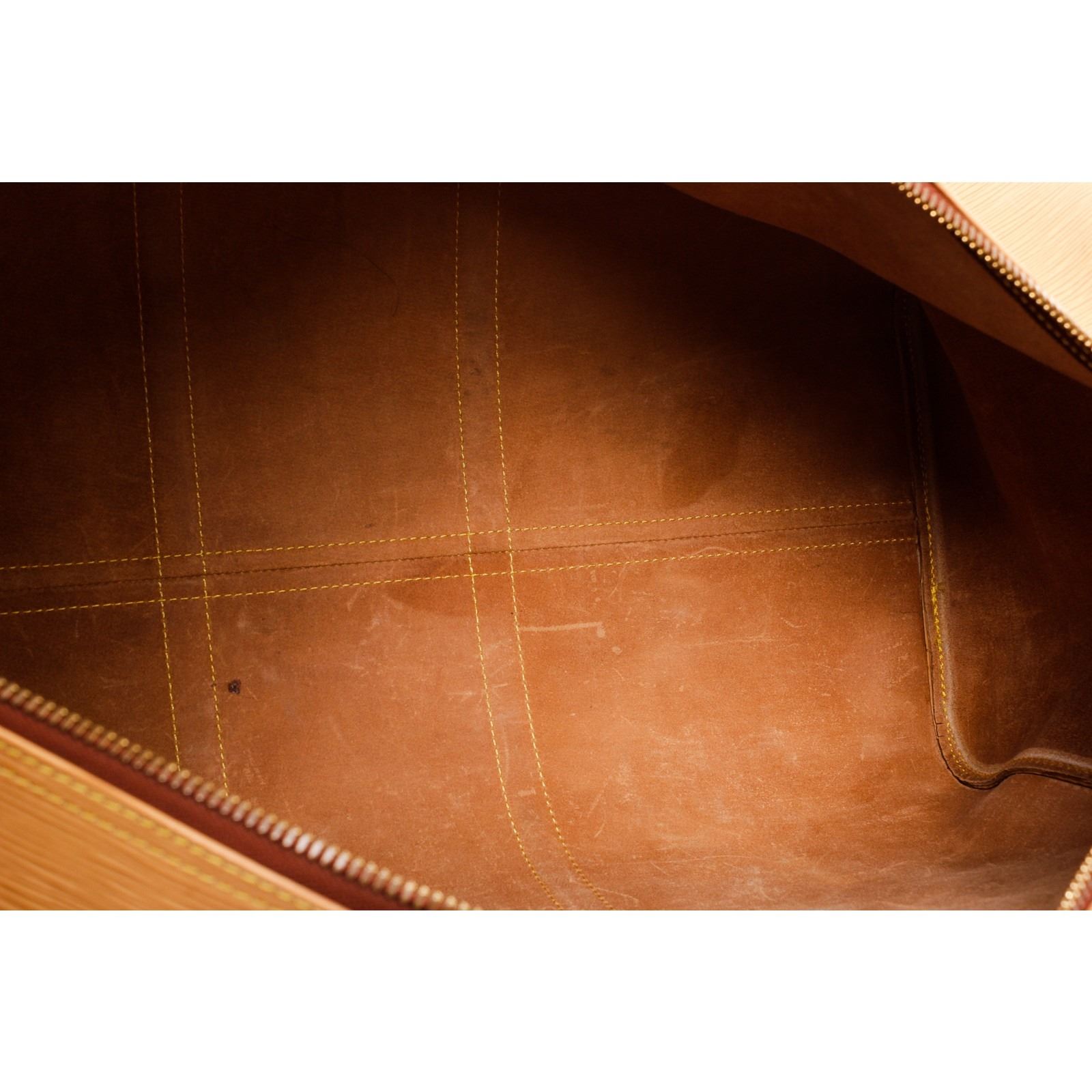 Description: Louis Vuitton Cipango Gold Epi Leather Keepall 55 cm Duffle Bag Luggage. Cipango Gold Epi leather Louis Vuitton Keepall 55 with bronze hardware, dual rolled top handles, patch pocket at exterior side, Alcantara lining, single interior compartment and two-way zip closures at top.