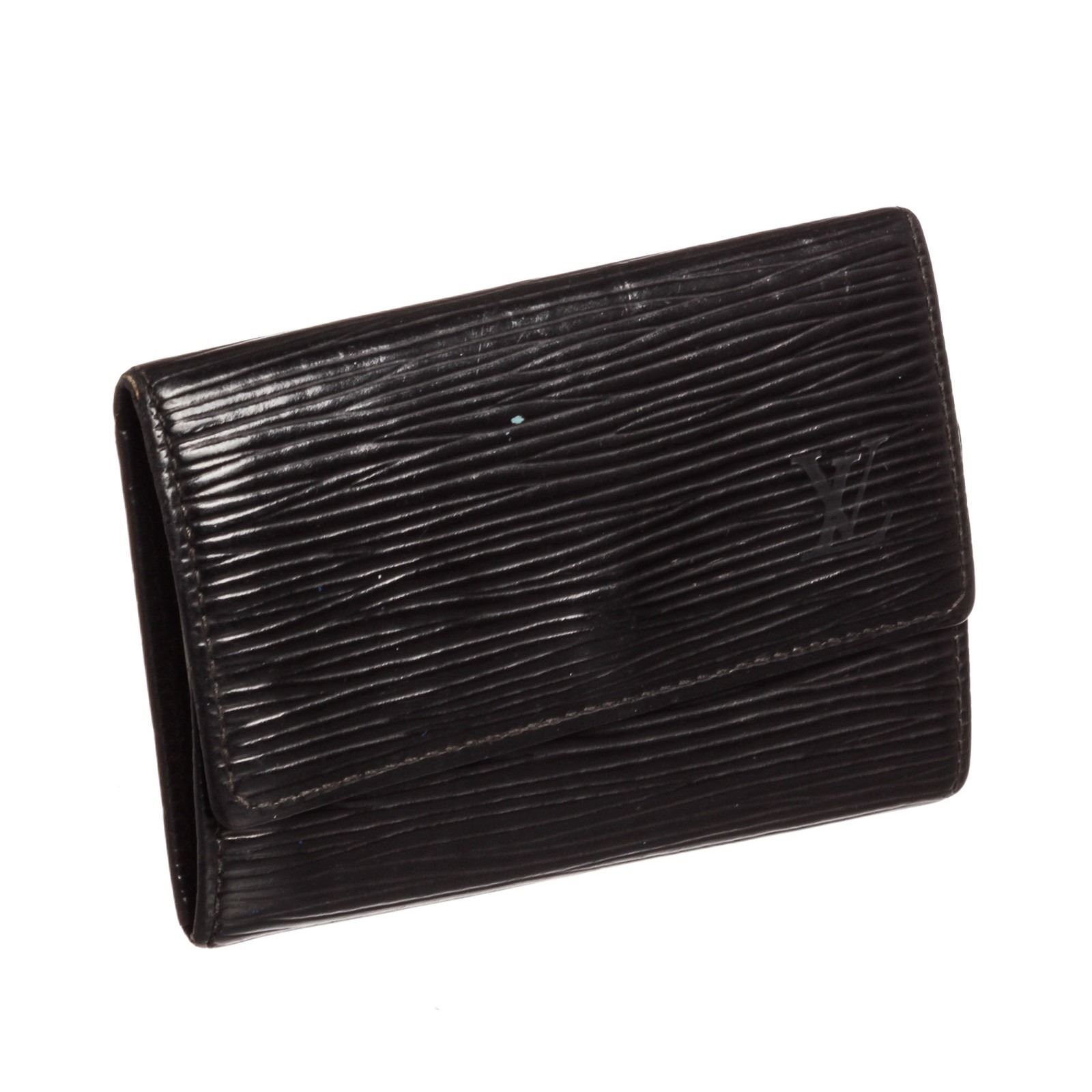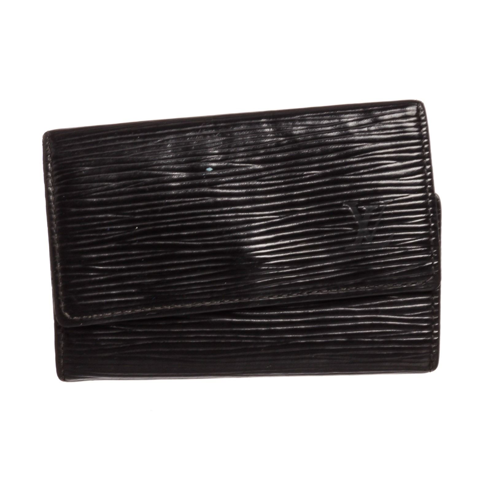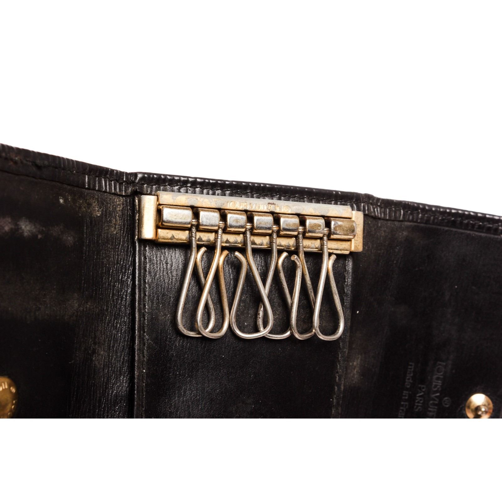 Black Epi leather Louis Vuitton key holder with gold-tone hardware, debossed logo at front, tonal leather interior, six key clasps and snap closure at front flap.