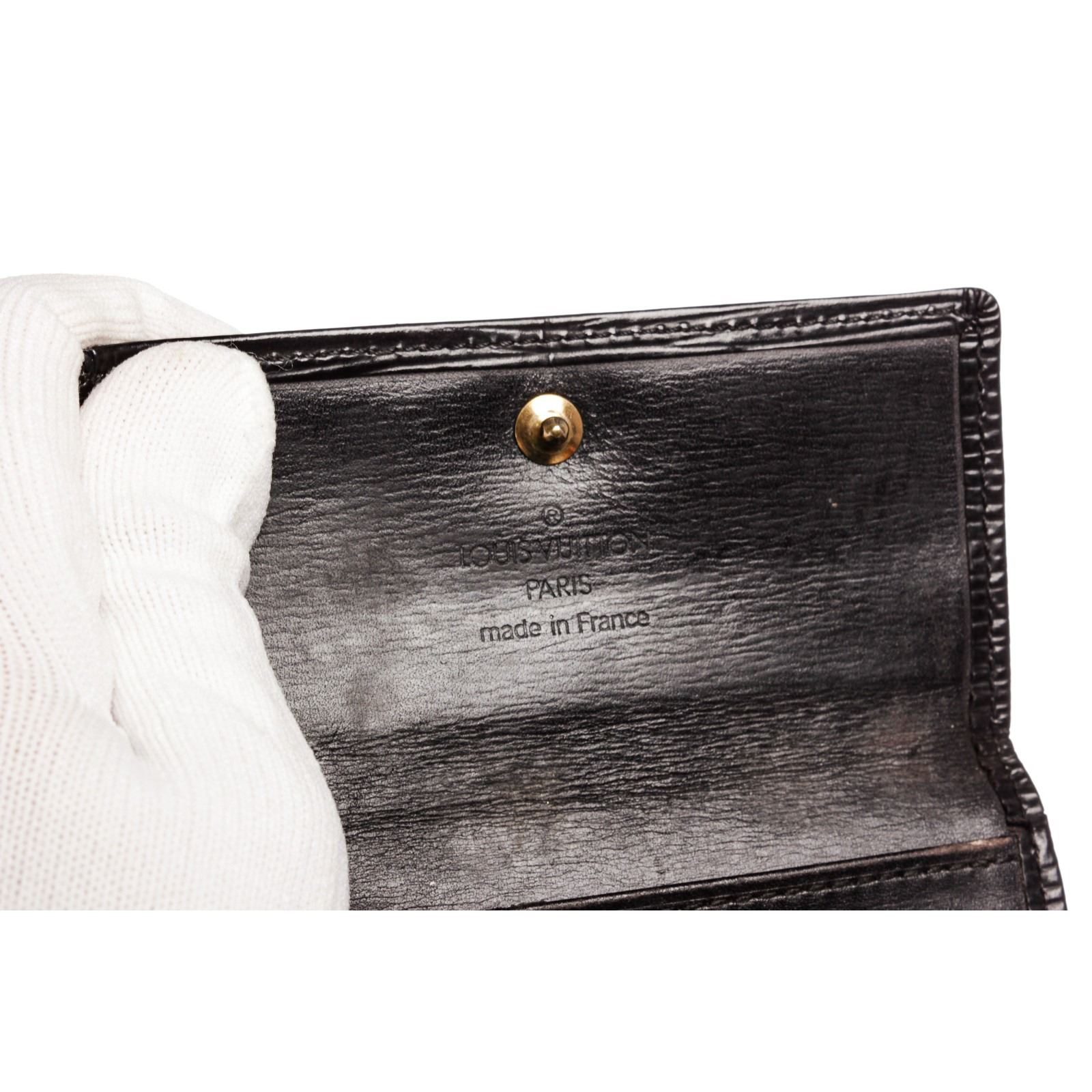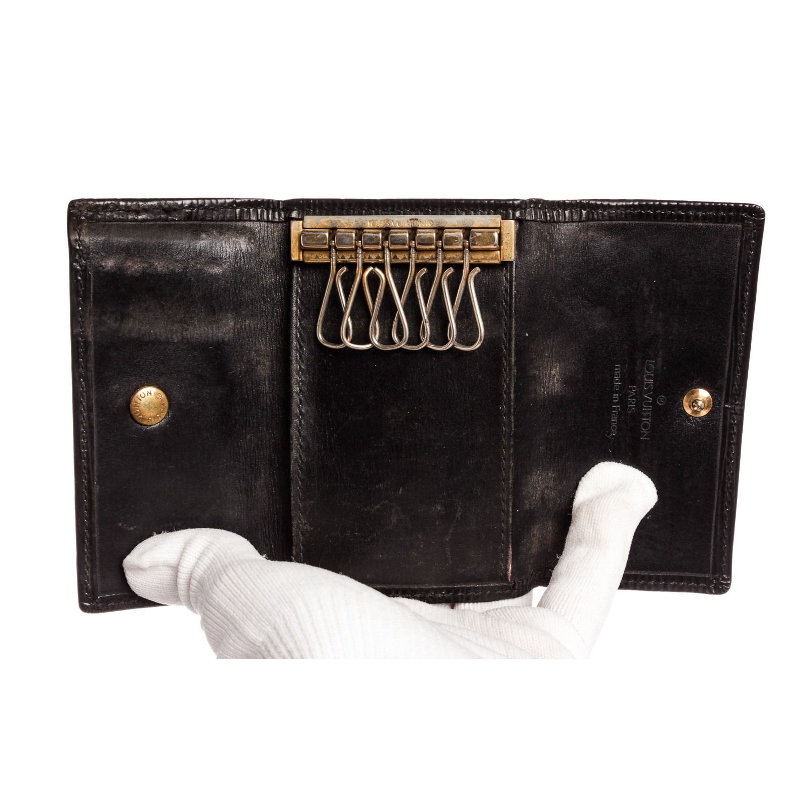 Black Epi leather Louis Vuitton key holder with gold-tone hardware, debossed logo at front, tonal leather interior, six key clasps and snap closure at front flap.