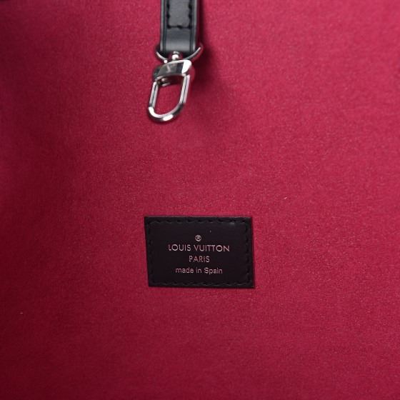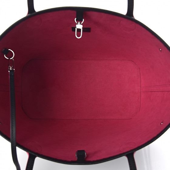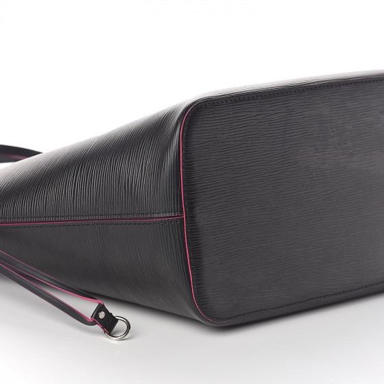 This stylish tote is crafted of Louis Vuitton signature textured epi leather in black with a hot pink resin glazing. The bag features smooth black leather trim, shoulder straps, and side cinch cords with polished silver hardware. The top opens to a pink microfiber interior with a matching pochette.