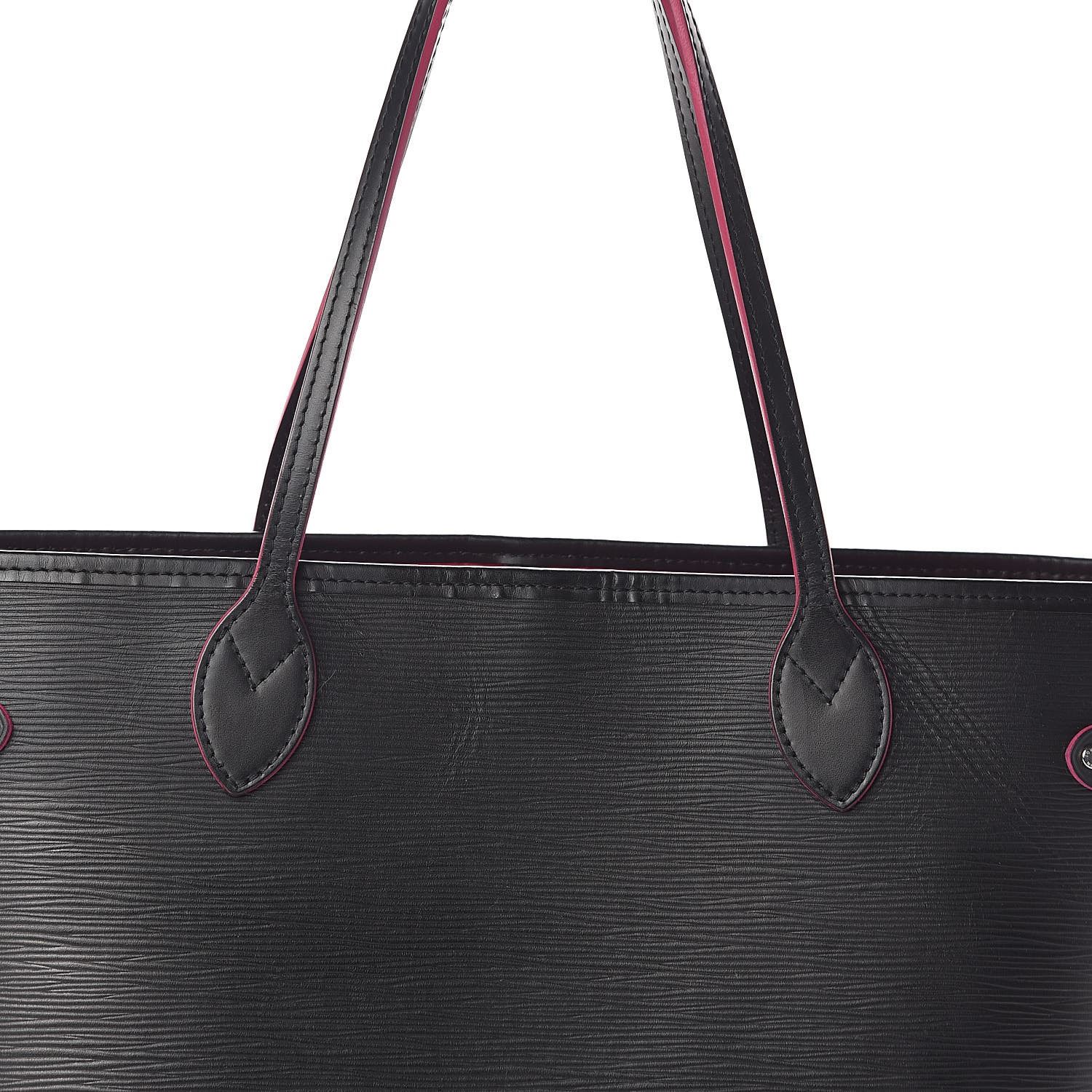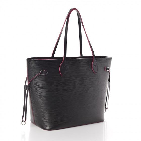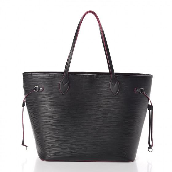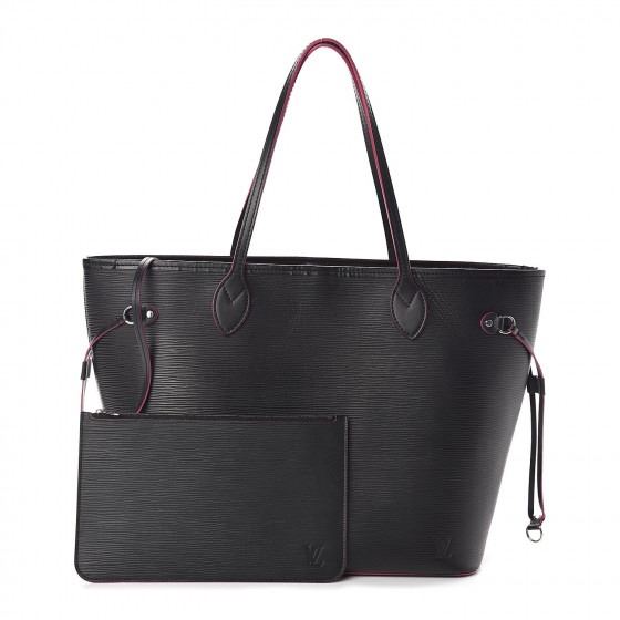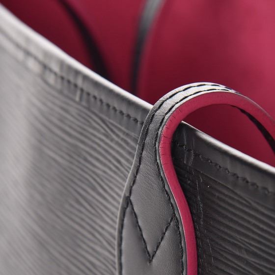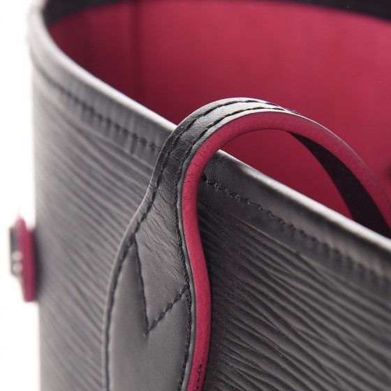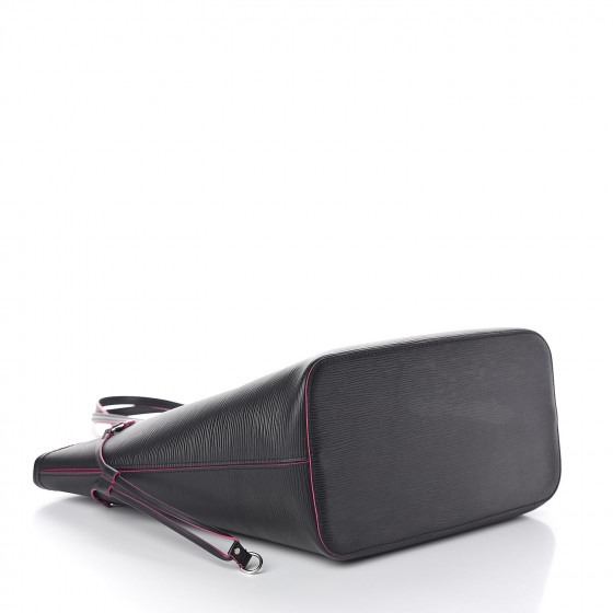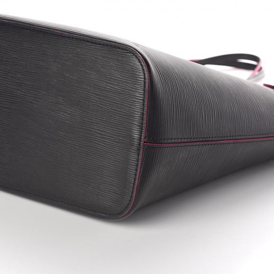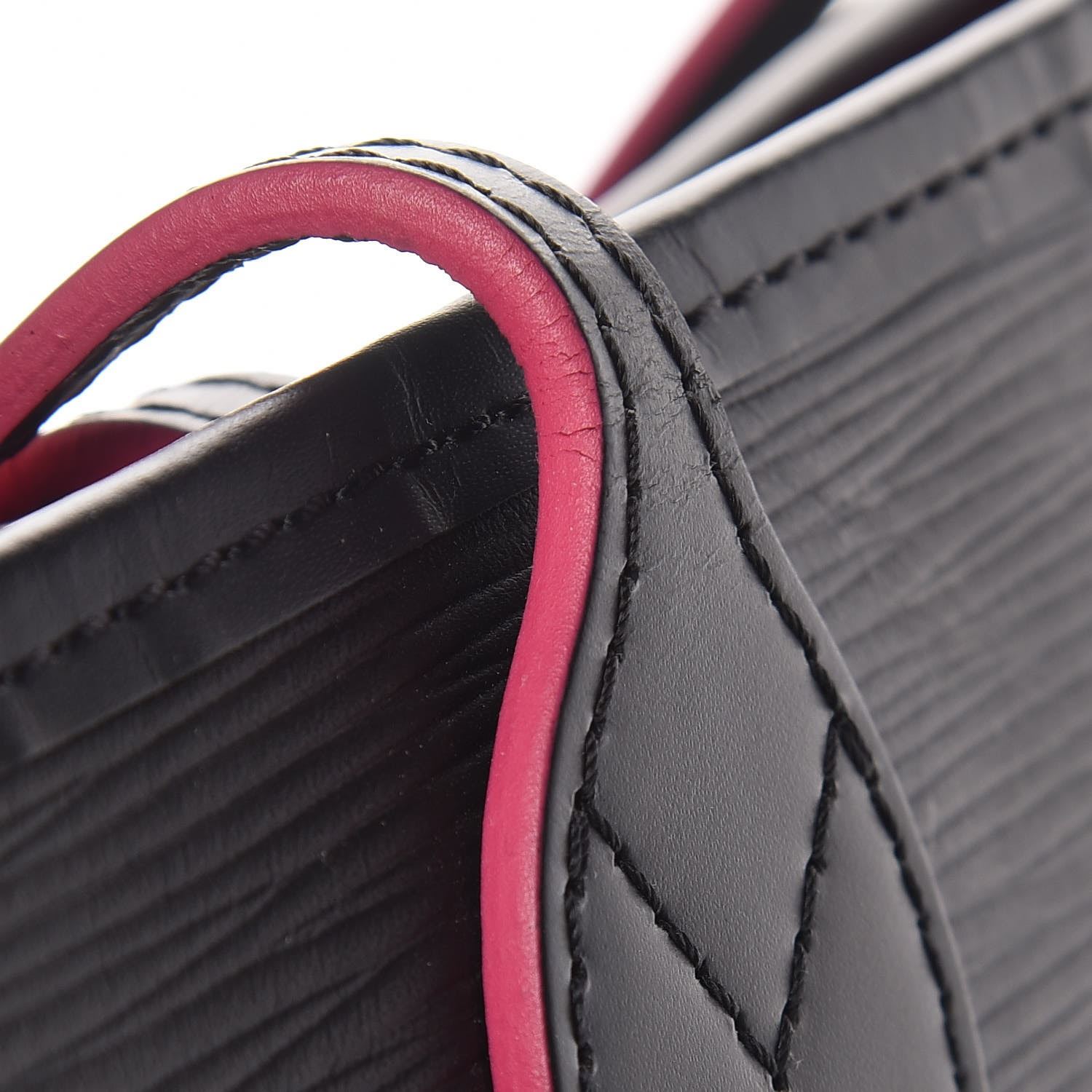 This stylish tote is crafted of Louis Vuitton signature textured epi leather in black with a hot pink resin glazing. The bag features smooth black leather trim, shoulder straps, and side cinch cords with polished silver hardware. The top opens to a pink microfiber interior with a matching pochette.