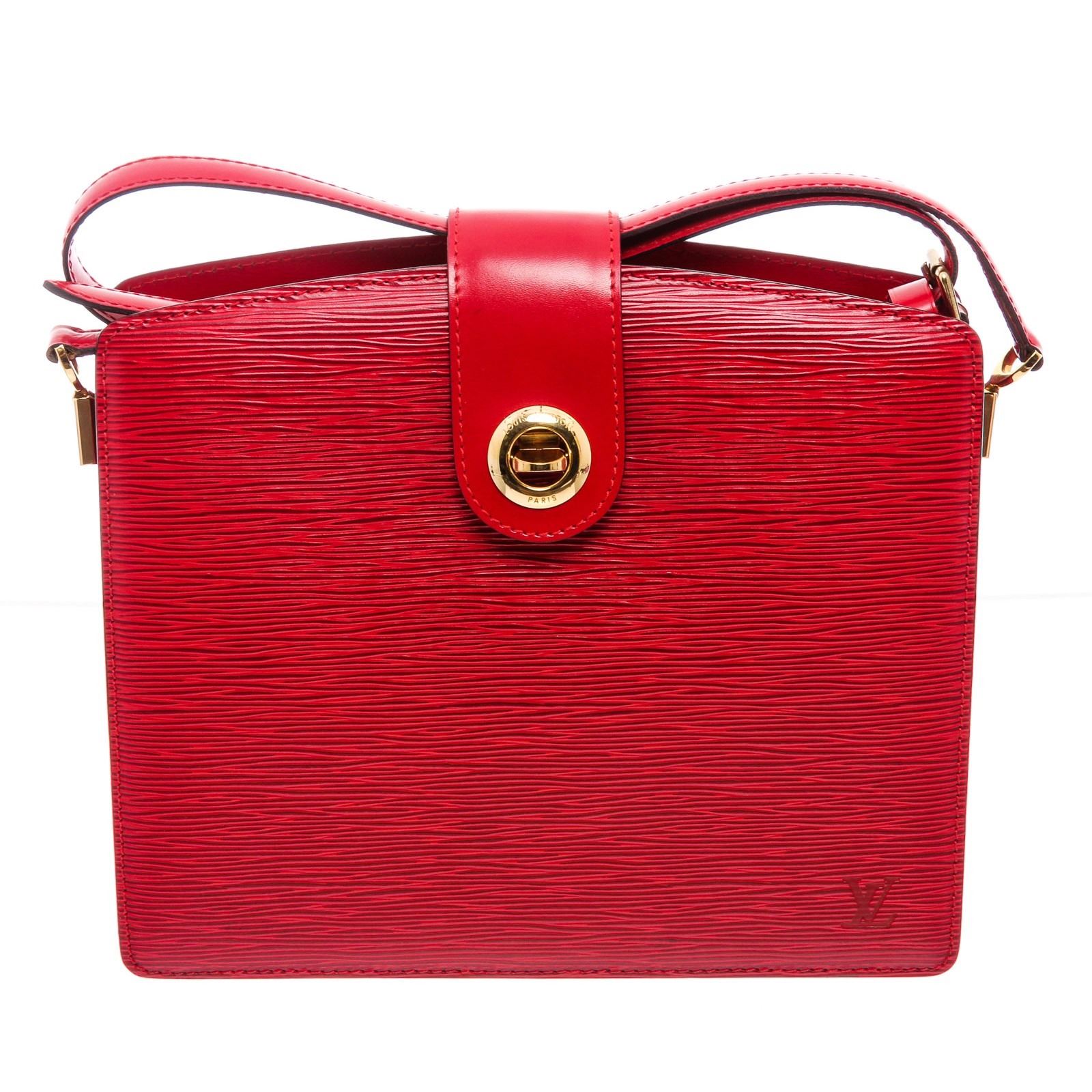 Red Epi leather Louis Vuitton Capucine bag with brass hardware, adjustable flat shoulder strap, embossed logo at corner, three interior compartments; one with zip closure, tonal leather lining, single slip pocket at interior wall and turn-lock closure at front flap.
