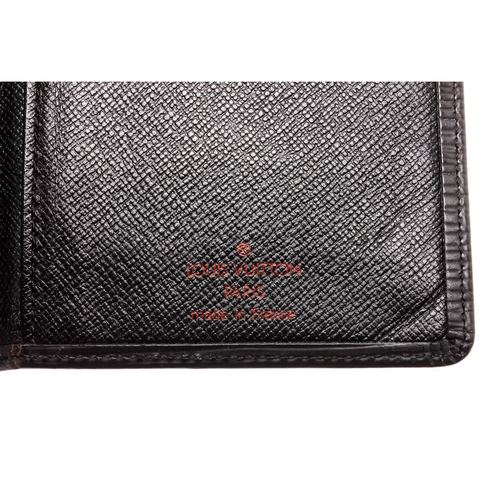Black Epi leather Louis Vuitton Vertical wallet with debossed logo at front corner, tonal leather interior, three bill compartments, six interior card slots and fold closure at front.