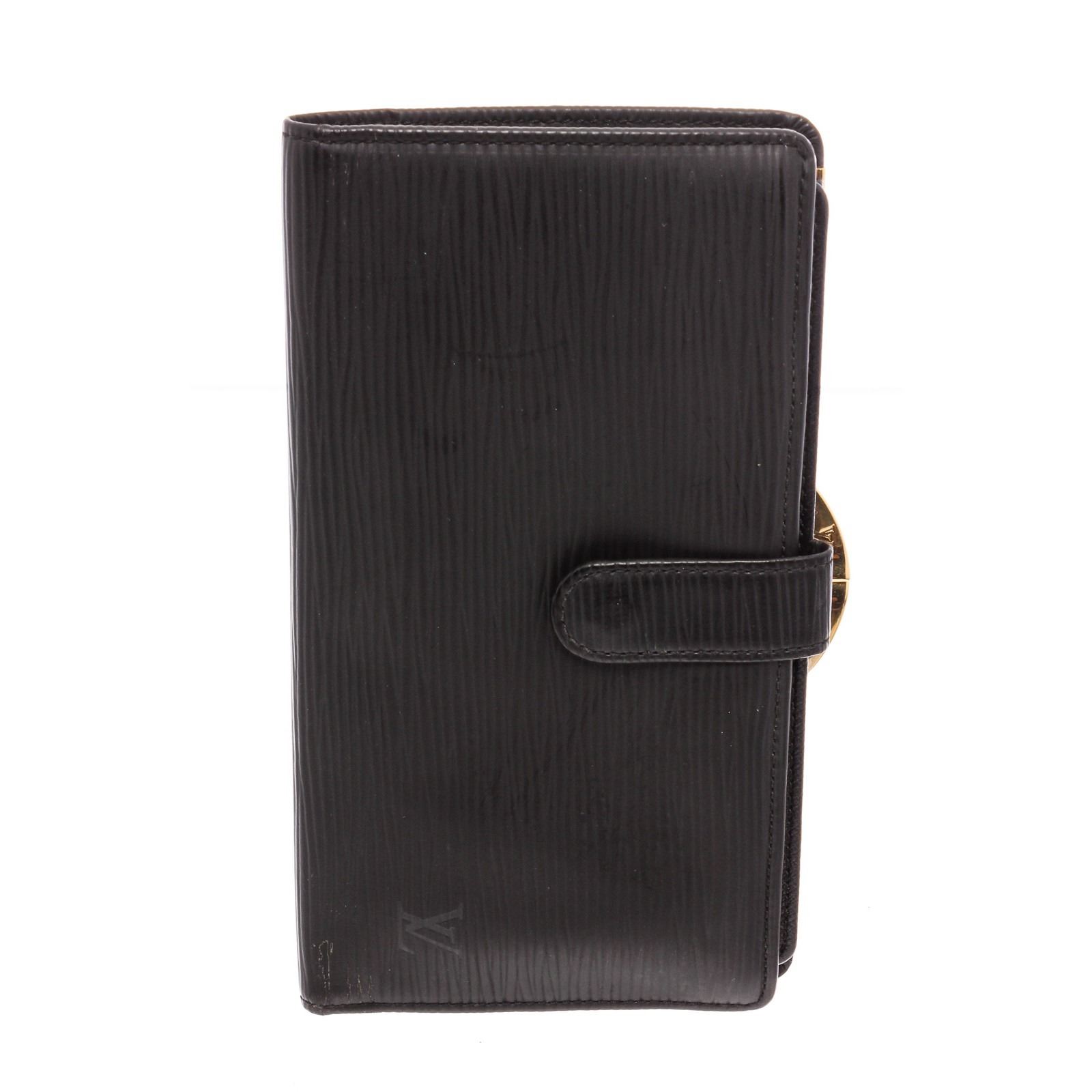 Black Epi leather Louis Vuitton Long French Purse wallet with brass hardware, tonal leather lining, dual bill compartments, single compartment with kiss-lock closure, six card slots and snap closure at front face